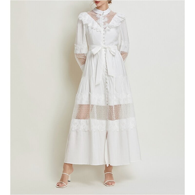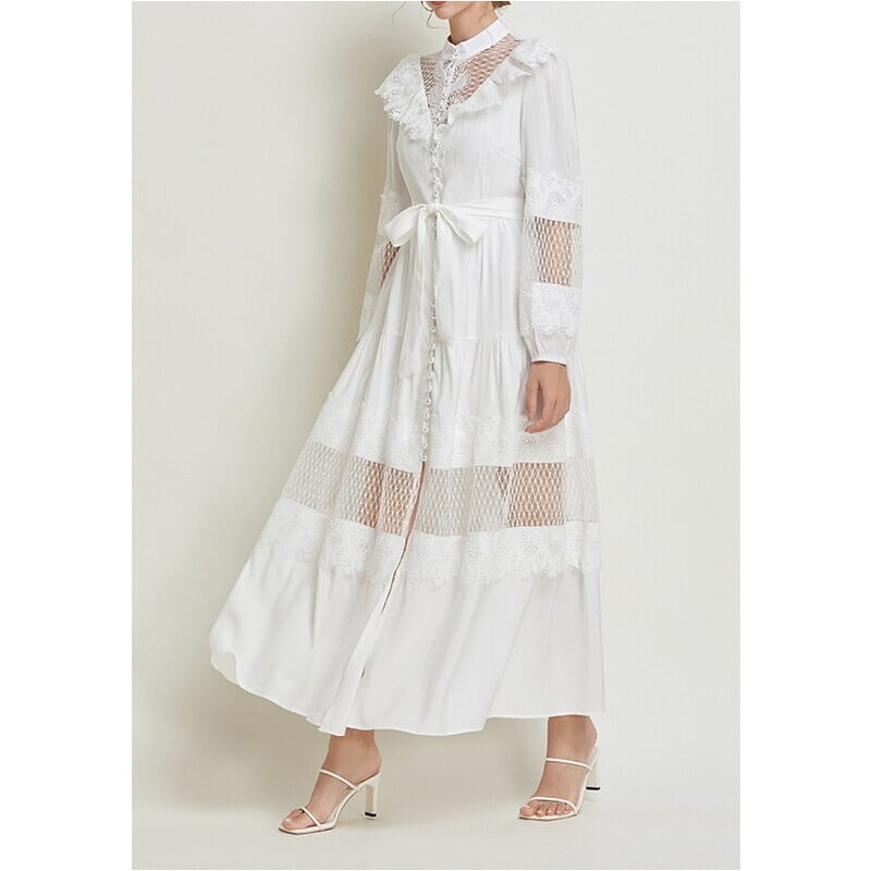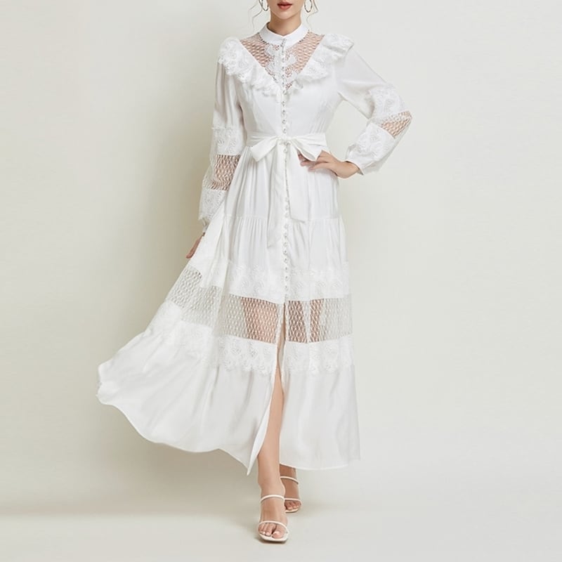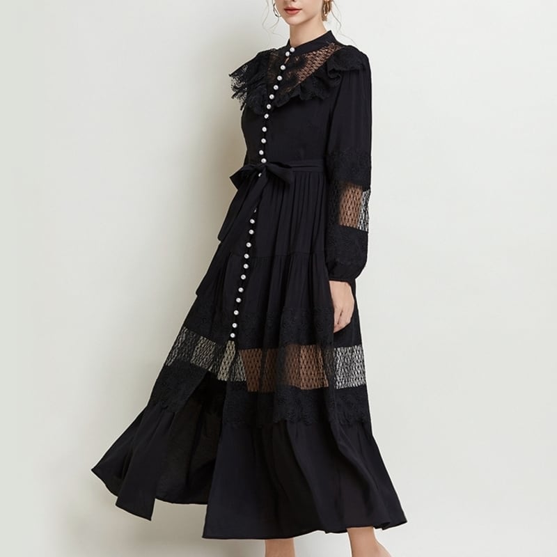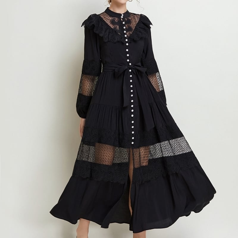 メッシュ切り替えがセクシーさを引き立てる、切り替えフレアロングドレスです。透け感がありながらもフリルやリボンのガーリーなアクセントが絶妙にミックスされ、魅力的な一着に仕上がっています。普段使いから特別な日のコーディネートまで幅広く活躍しますので、どんな場面でもあなたを引き立ててくれること間違いなしです!ぜひお試しください!