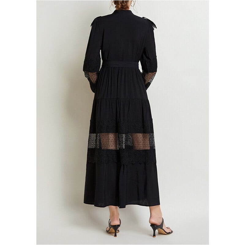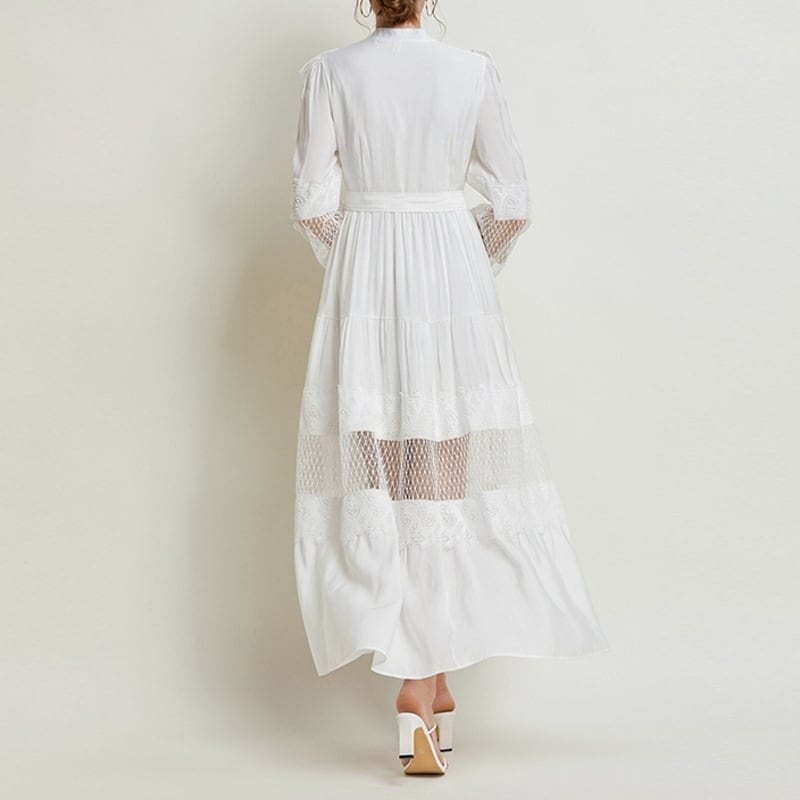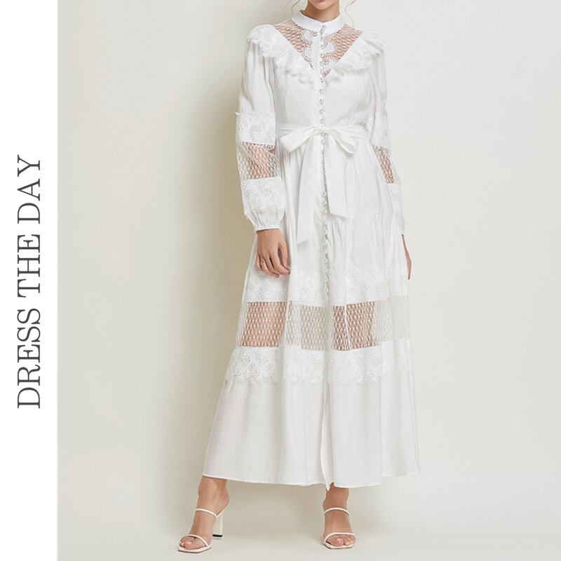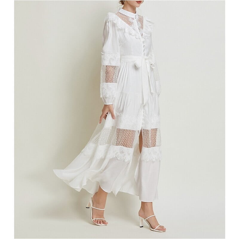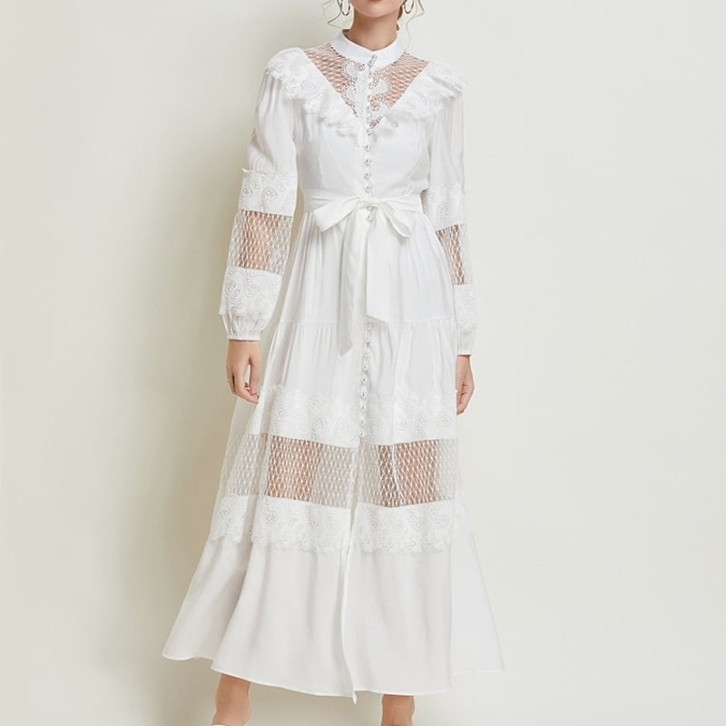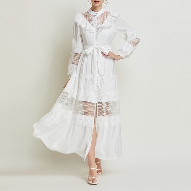 メッシュ切り替えがセクシーさを引き立てる、切り替えフレアロングドレスです。透け感がありながらもフリルやリボンのガーリーなアクセントが絶妙にミックスされ、魅力的な一着に仕上がっています。普段使いから特別な日のコーディネートまで幅広く活躍しますので、どんな場面でもあなたを引き立ててくれること間違いなしです!ぜひお試しください!