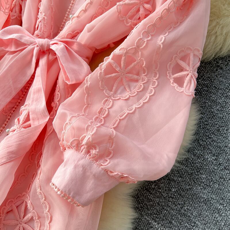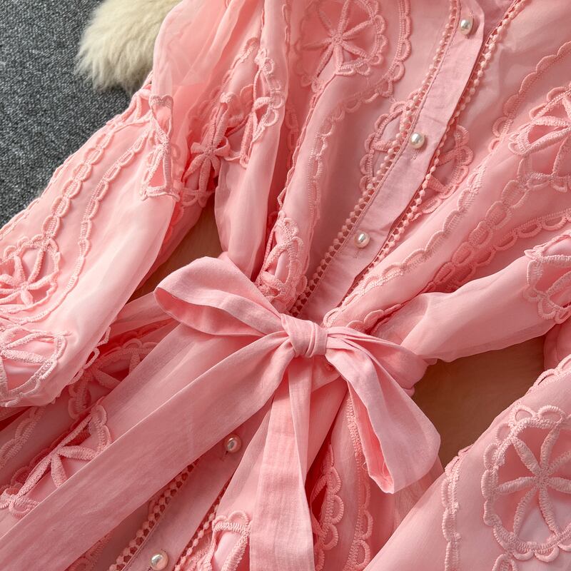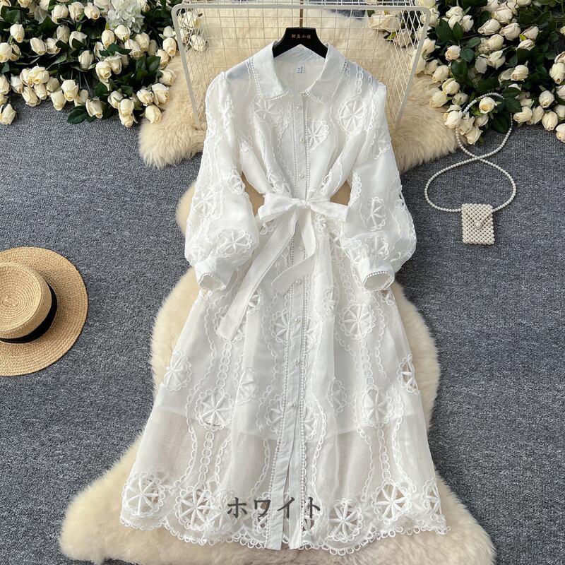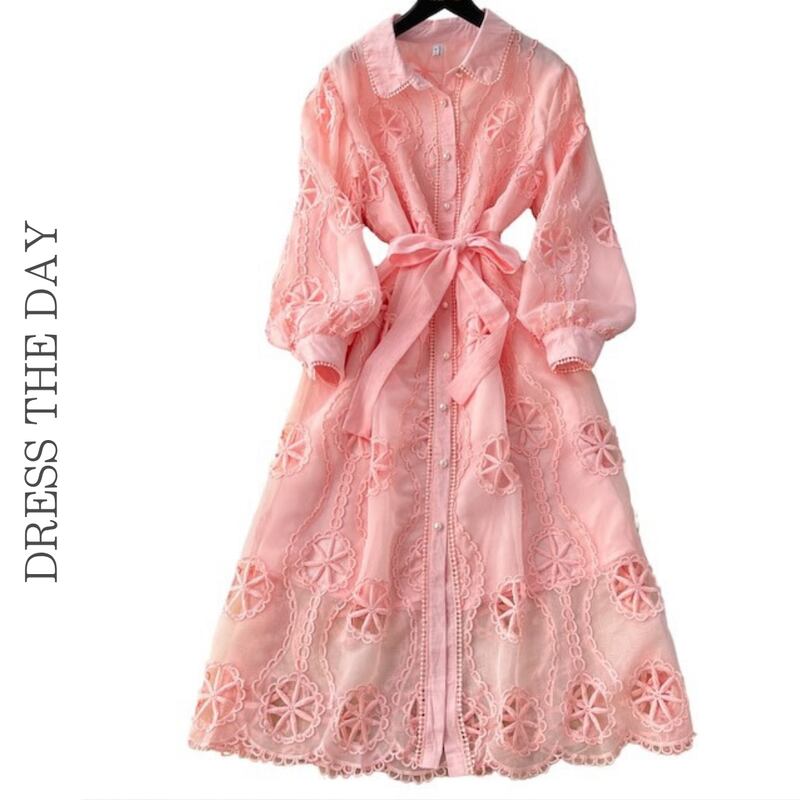 パンチングレースの透け感が華やかさを引き立てる、シャツタイプのロングドレスです。シンプルながらも上品なデザインが、特別な日から普段使いまで幅広く活躍します。ウエストのリボンはスタイルアップ効果を期待でき、どのシーンでも自信を持てる存在感を演出します。女性らしさを際立たせる一着を、ぜひお試しください!