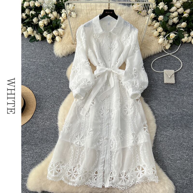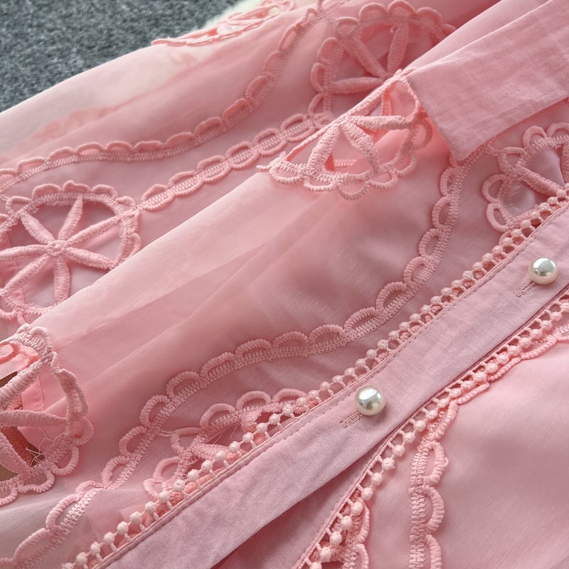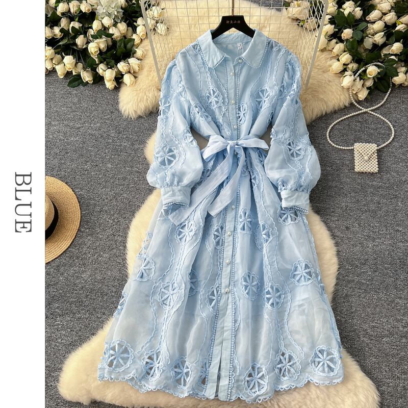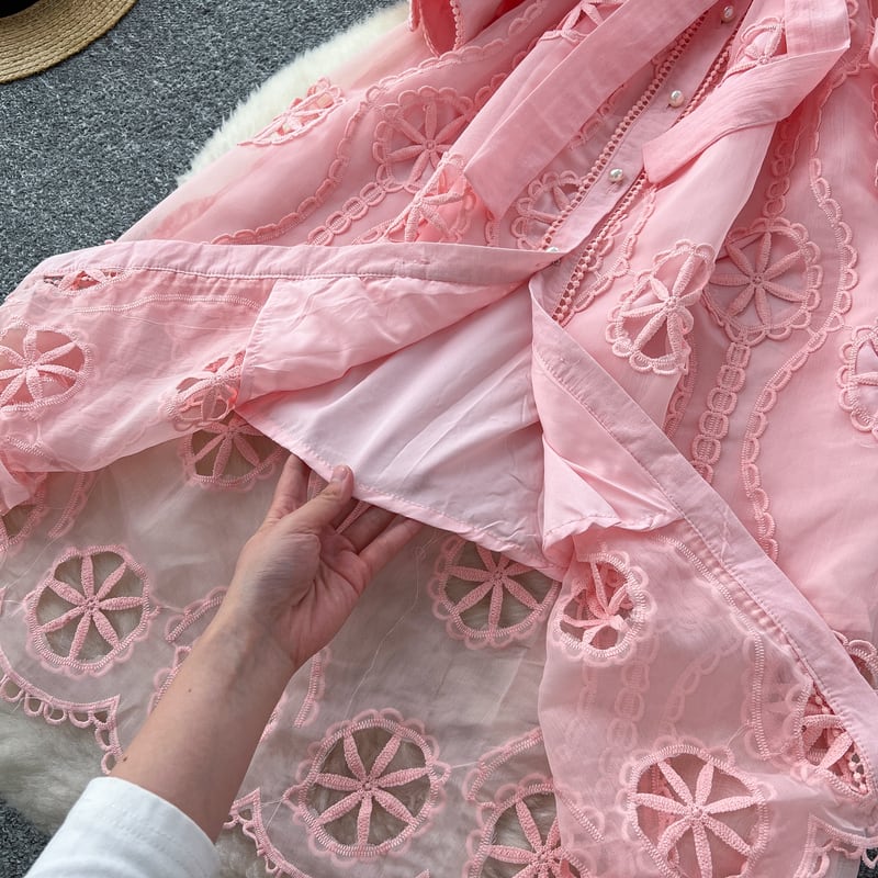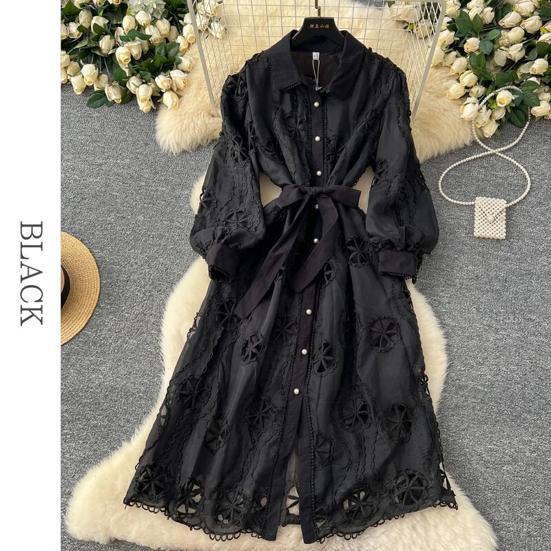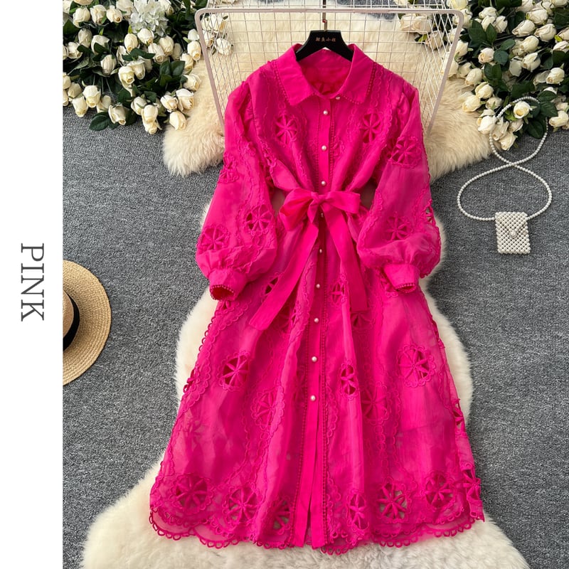 パンチングレースシャツロングドレス6色展開 D0007