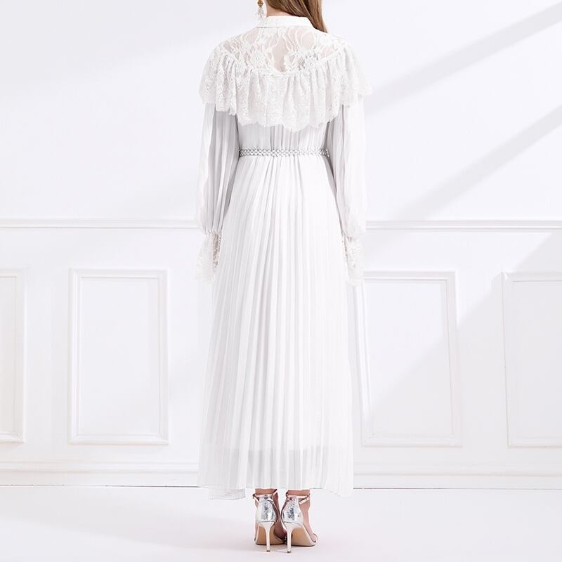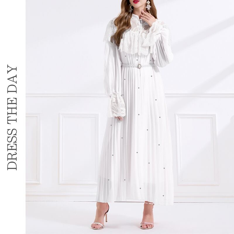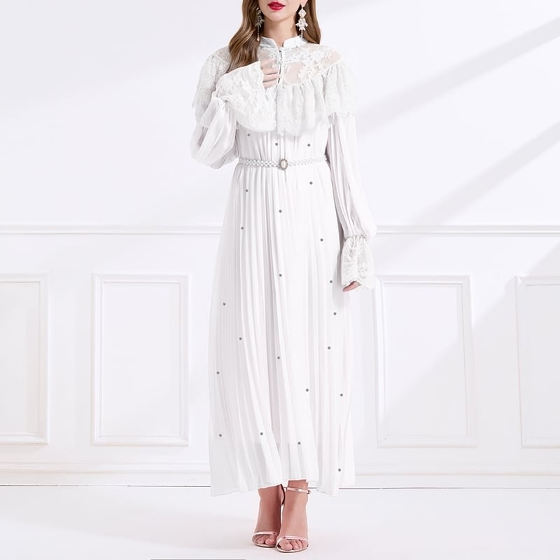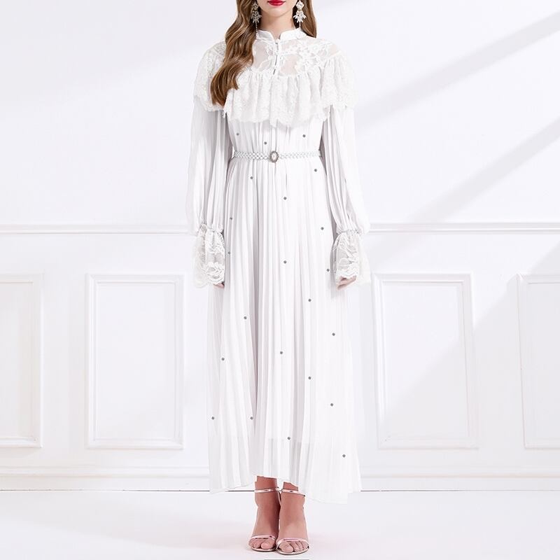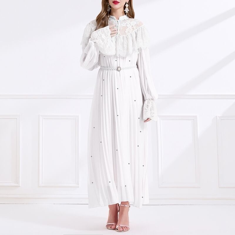 レース切り替えプリーツロングドレス D0008