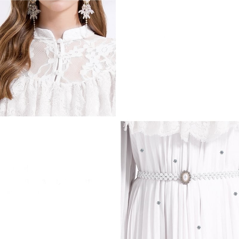 デコルテまわりのレースの透け感とフリルが華やかさを引き立てる、レース切り替えプリーツロングドレスです。繊細なプリーツが魅力的で、ガーリーなドット柄が可愛らしい印象を与えます。普段使いから特別な日のコーディネートまで幅広く活躍しますので、どんな場面でもあなたを引き立ててくれること間違いなしです!