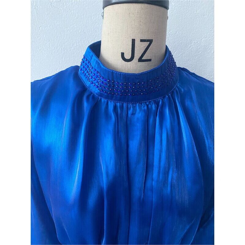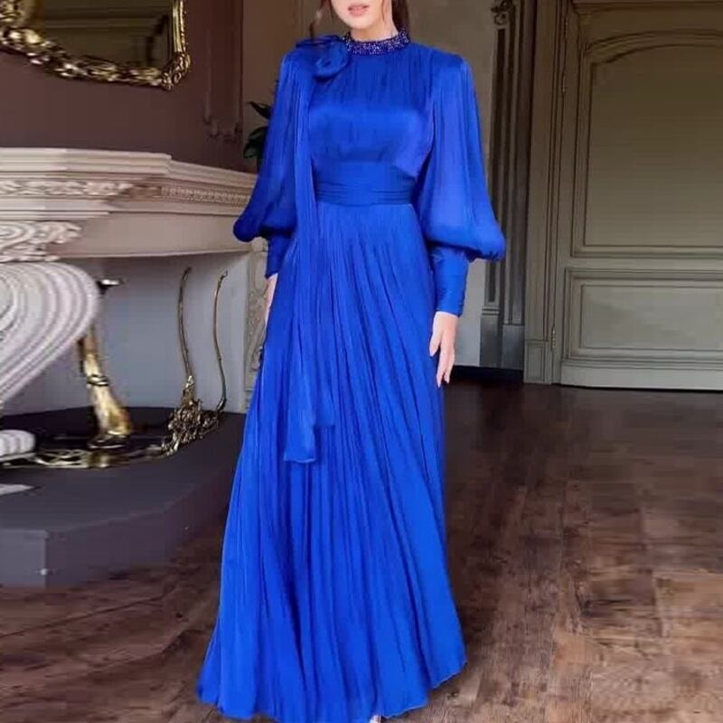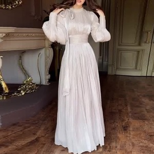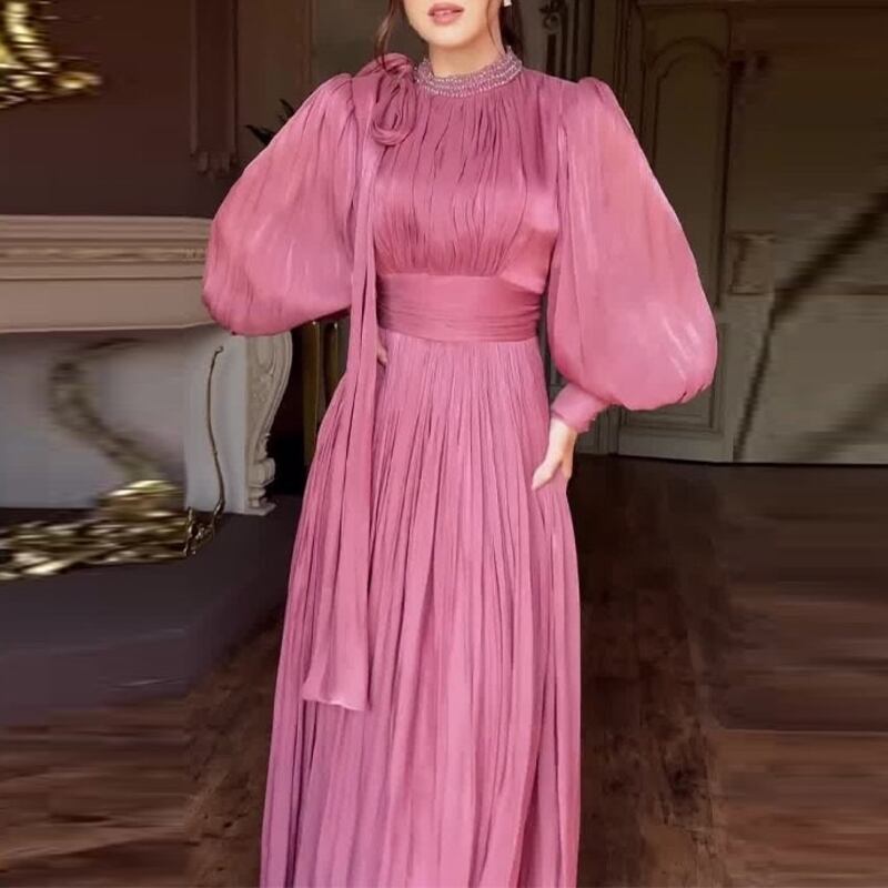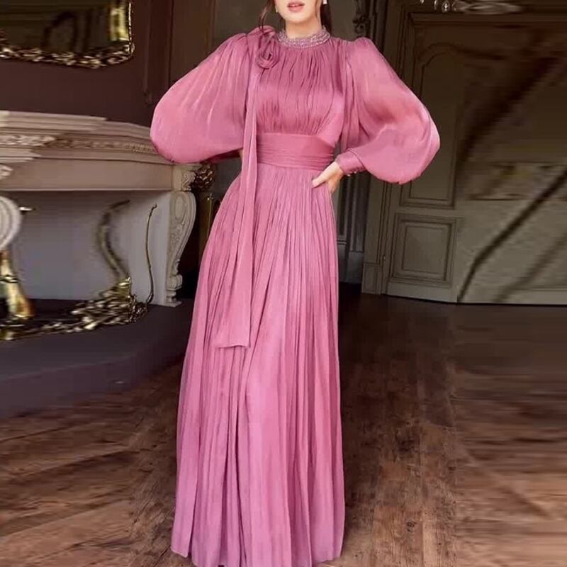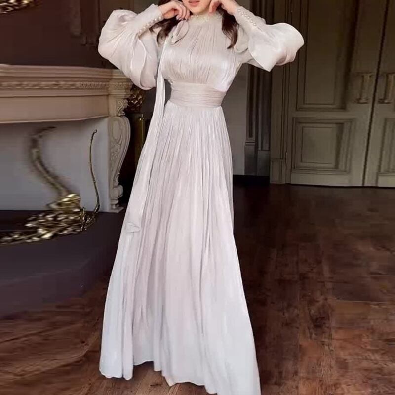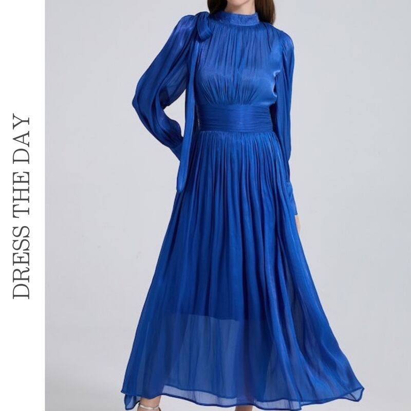 サテンの上品なツヤ感が漂う、華やかなAラインフレアドレスです。クラシカルなロングカフスがデザインのアクセントとなり、エレガントな雰囲気を演出します。普段使いから特別な日のコーディネートまで幅広く対応できる一着で、どんなシーンでもあなたを引き立てる存在感を発揮します。