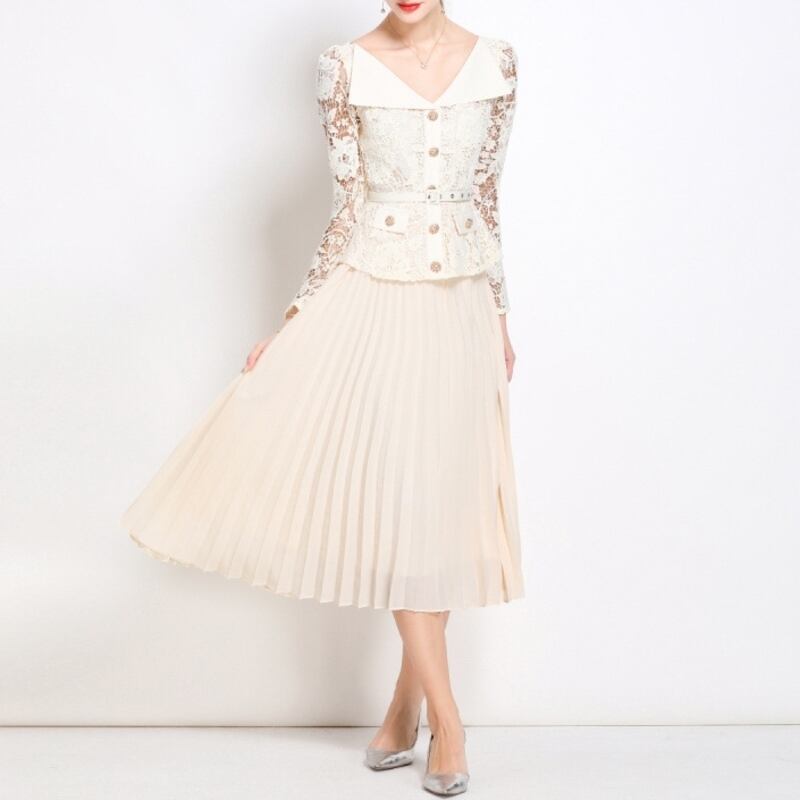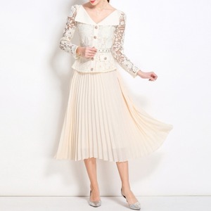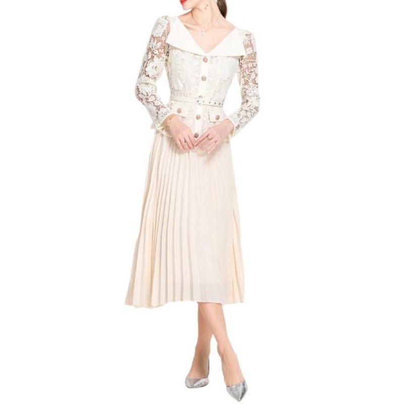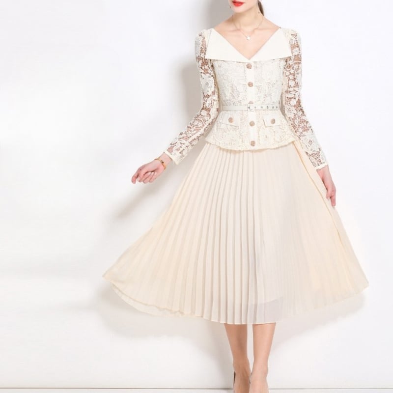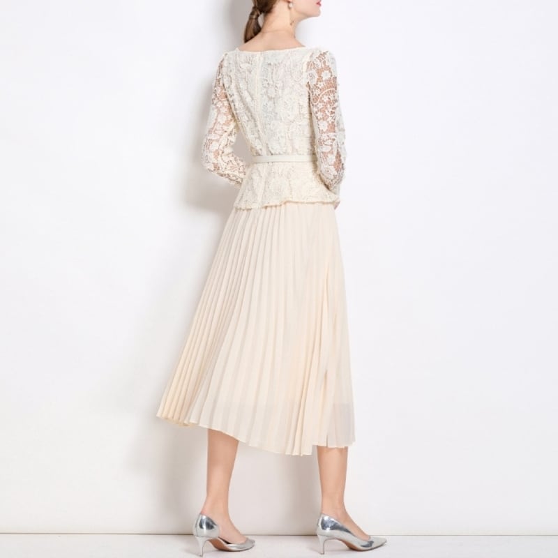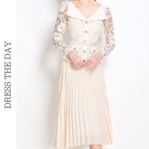 レース切り替えプリーツミモレドレス D0015