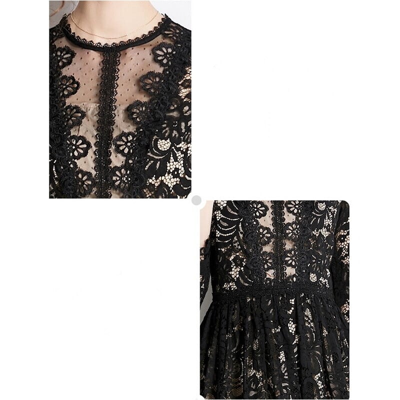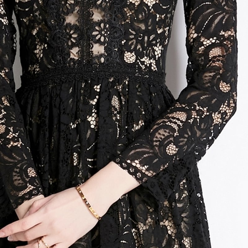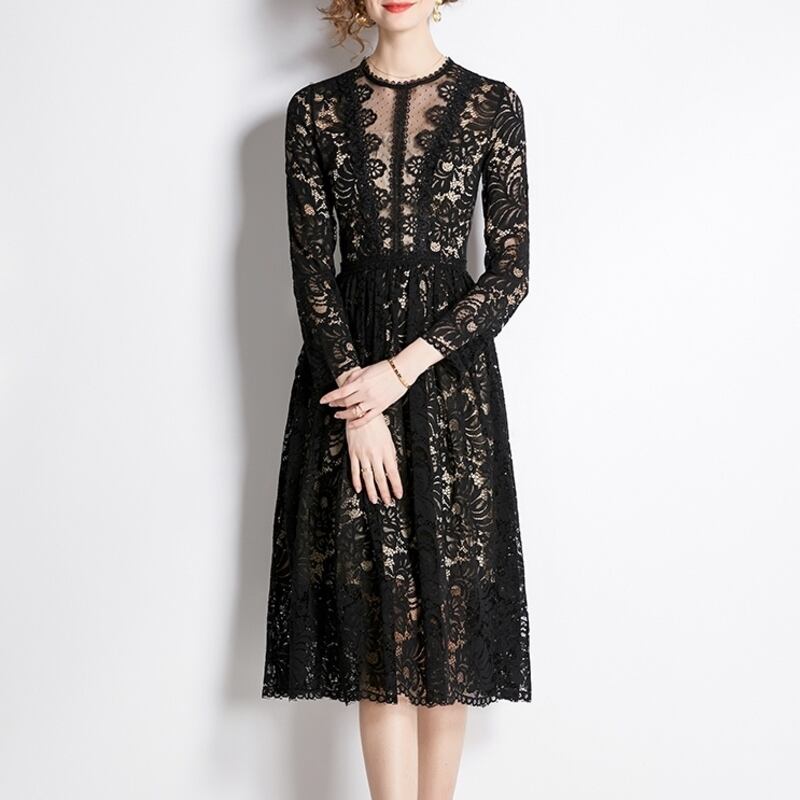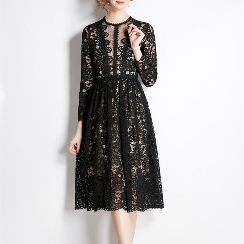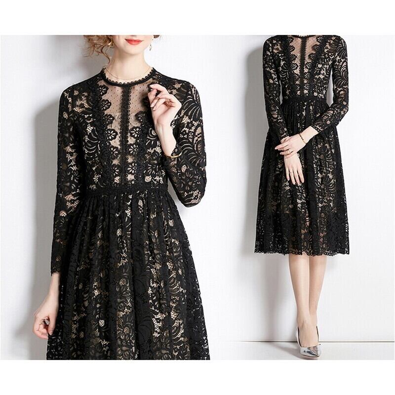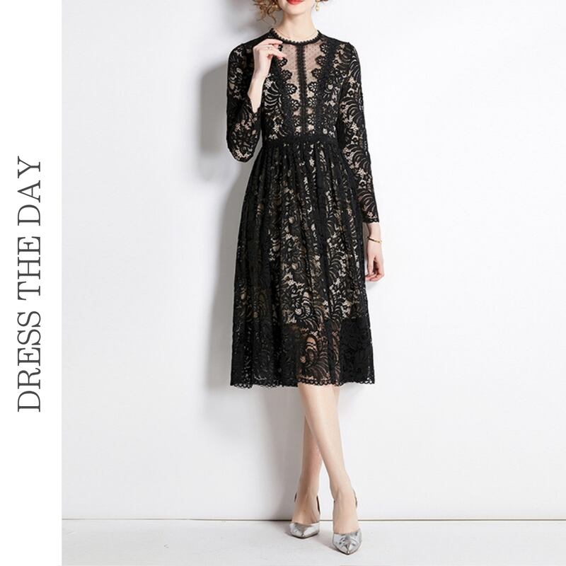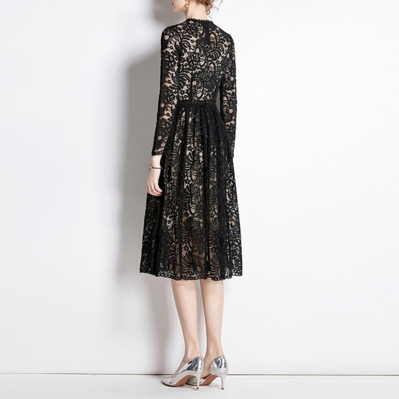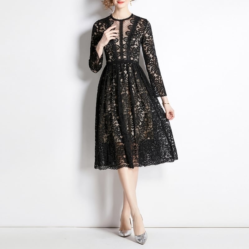 ヌーディーな裏地がレースの透け感をいかしたクラシカルで華やかなミディアム丈ドレスです。上品なフレア感が魅力的で、シックなモノトーン配色が大人かわいい印象を与えます。普段使いから特別な日のコーディネートまで幅広く活躍しますので、どんな場面でもあなたを引き立ててくれること間違いなしです!