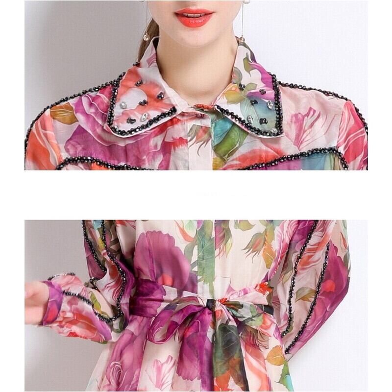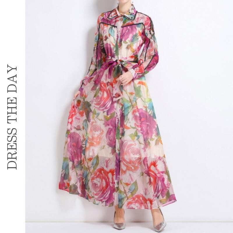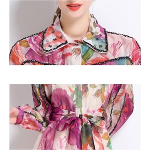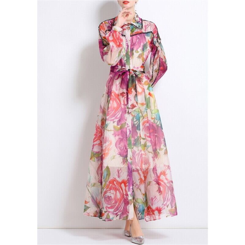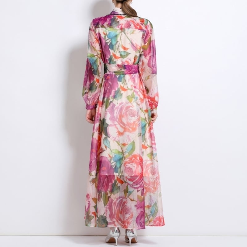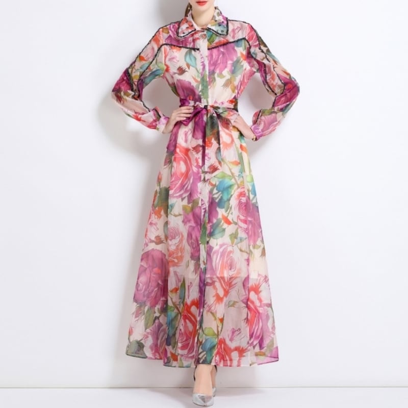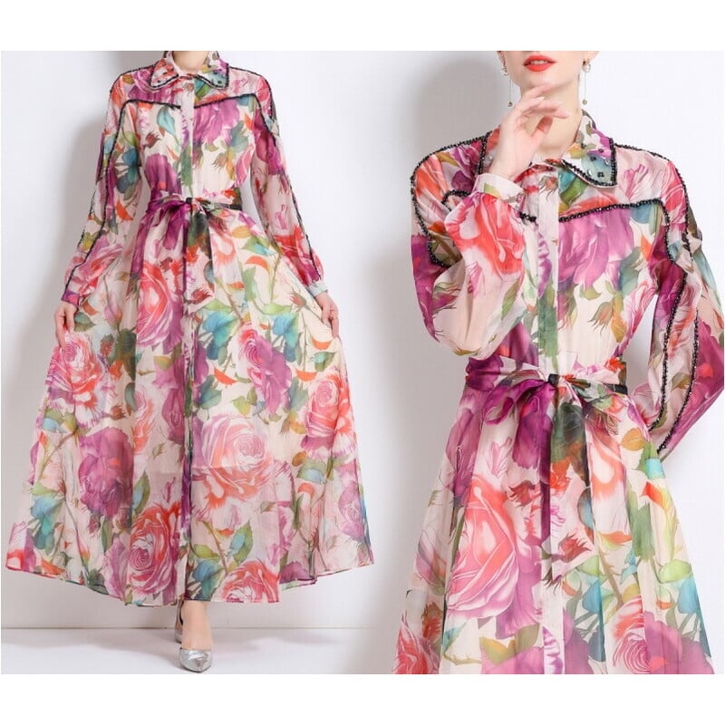 鮮やかなフラワープリントが魅力的なスパンコール装飾が目を引くドレスです。チュールの透け感が柔らかく可愛らしい印象を演出します。普段使いから特別な日のコーディネートまで幅広く活躍する一着です。ボリューム感のあるフレアスカートが上品な仕立てで、ロング着丈は体型を自然にカバーしてくれます。