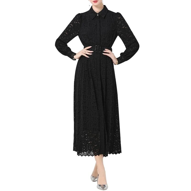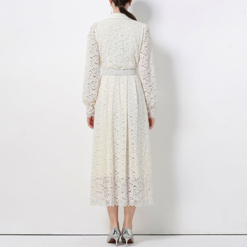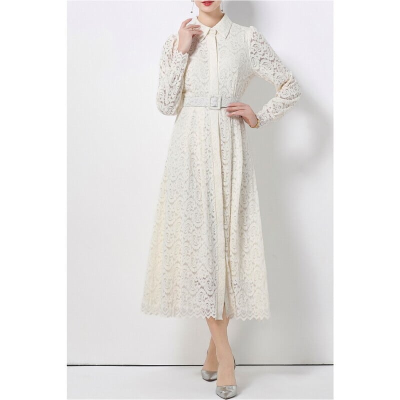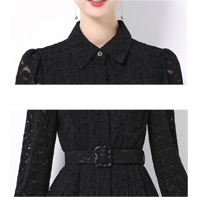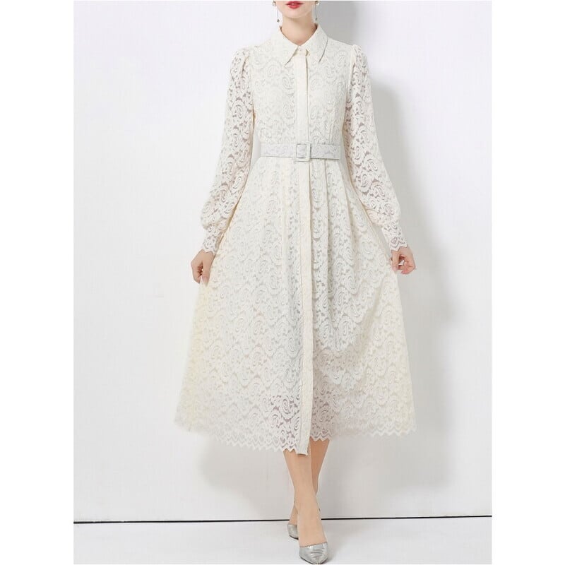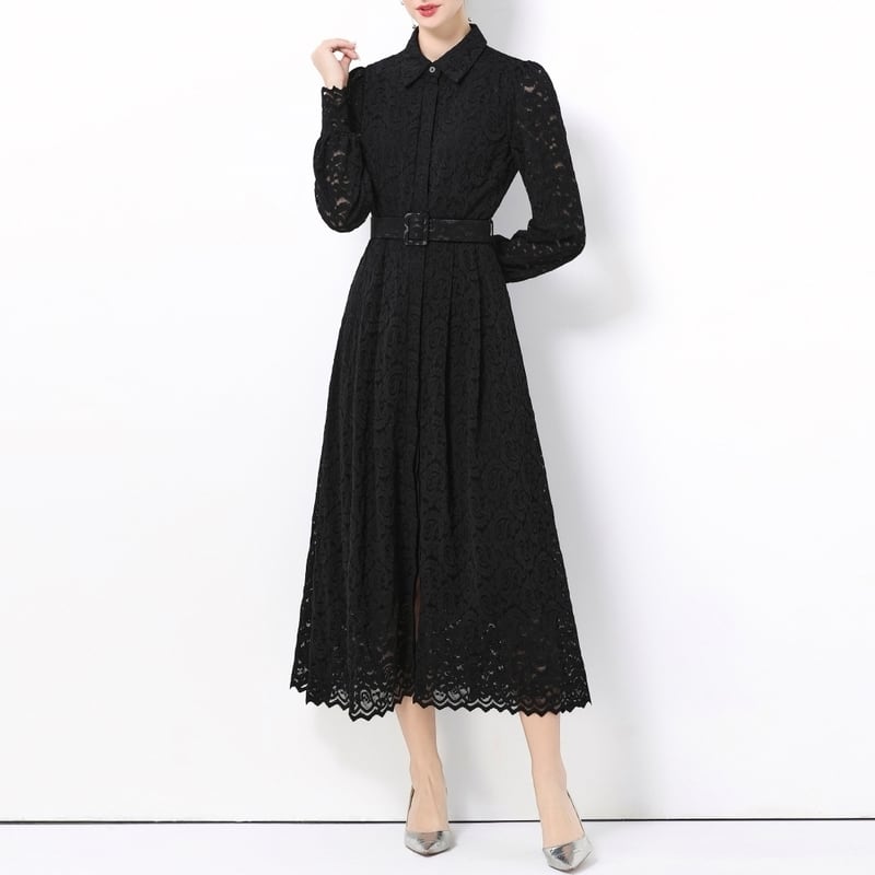 繊細な総レース仕立てが魅力的なシャツタイプのミモレ丈ドレスです。上品なフレア感が魅力的で、シックなモノトーン配色が大人かわいい印象を与えます。普段使いから特別な日のコーディネートまで幅広く活躍しますので、どんな場面でもあなたを引き立ててくれること間違いなしです!