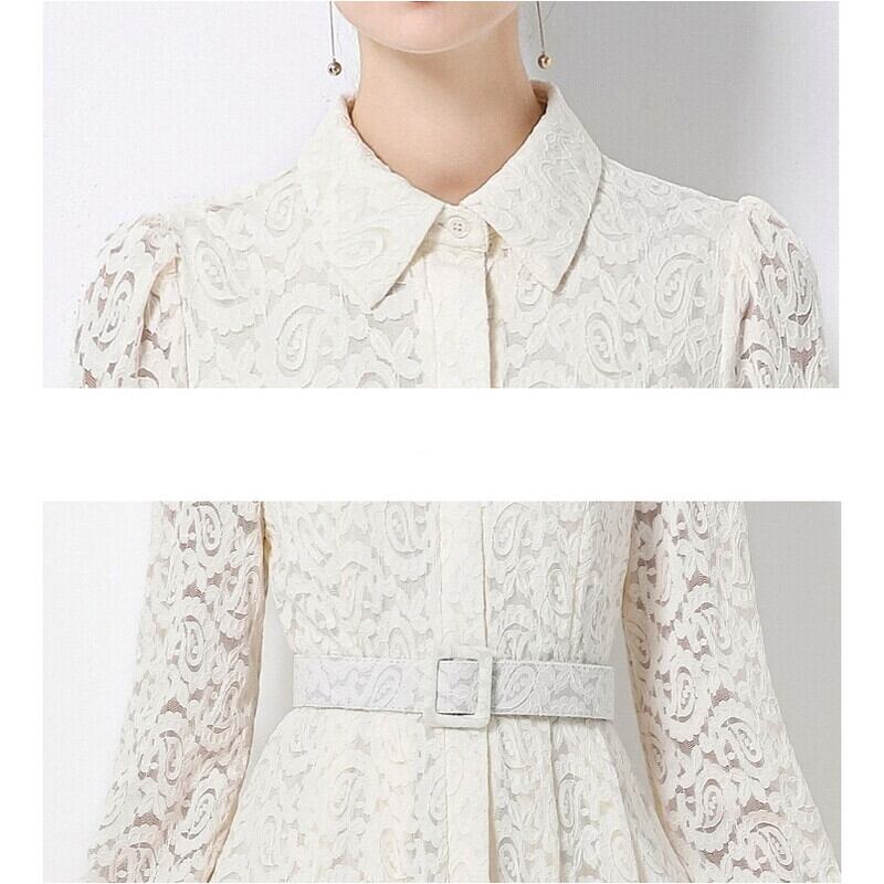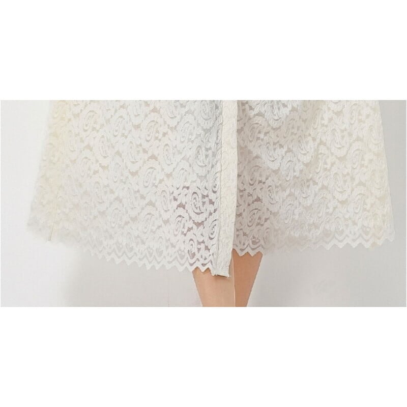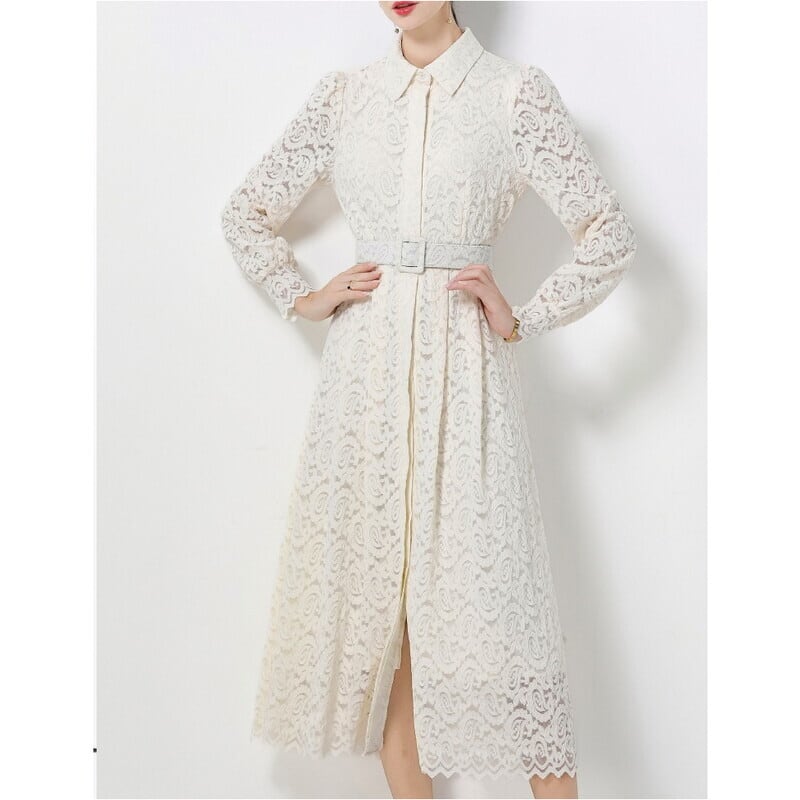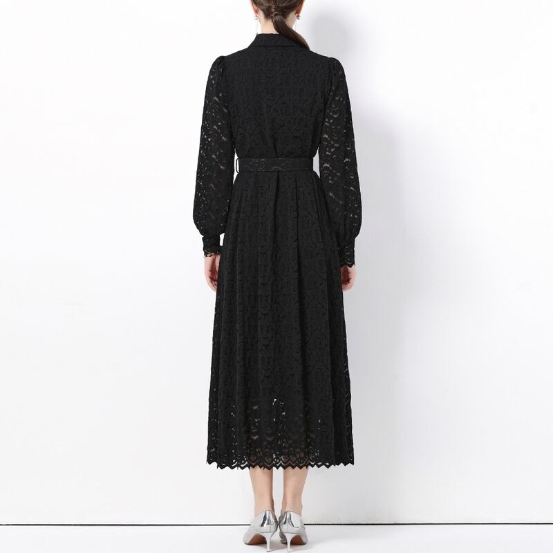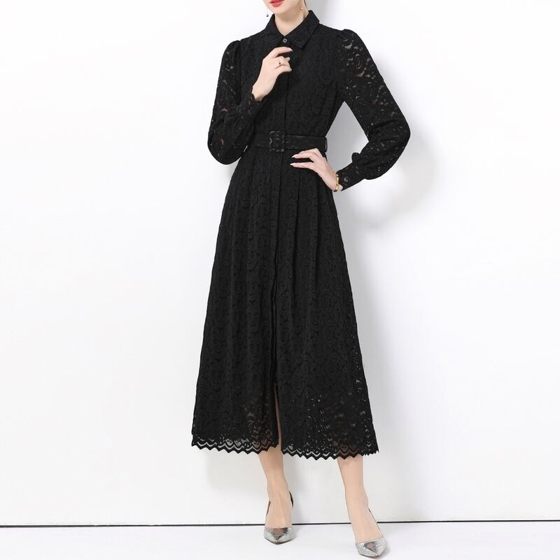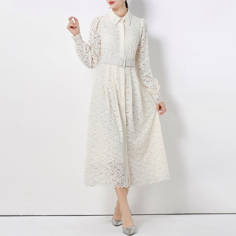 繊細な総レース仕立てが魅力的なシャツタイプのミモレ丈ドレスです。上品なフレア感が魅力的で、シックなモノトーン配色が大人かわいい印象を与えます。普段使いから特別な日のコーディネートまで幅広く活躍しますので、どんな場面でもあなたを引き立ててくれること間違いなしです!