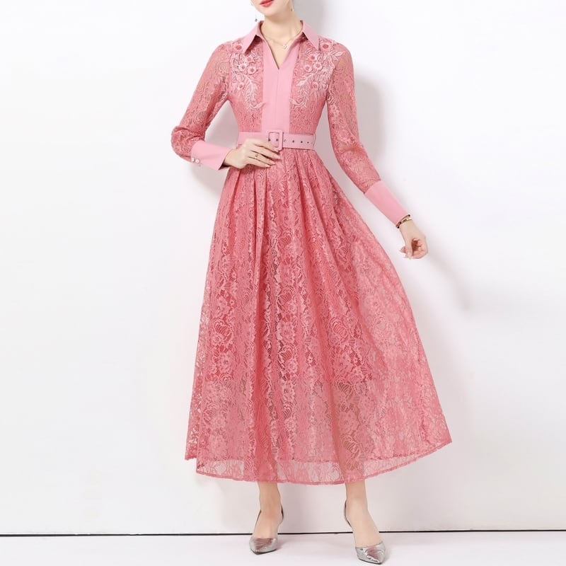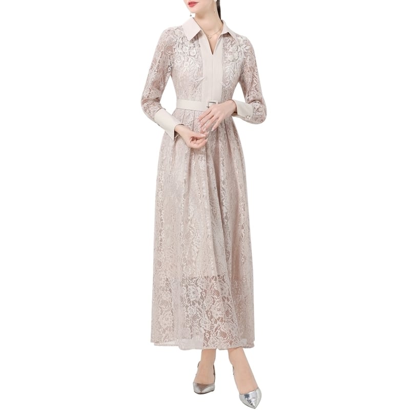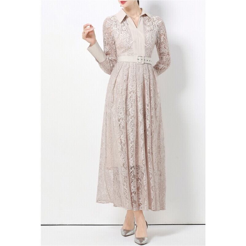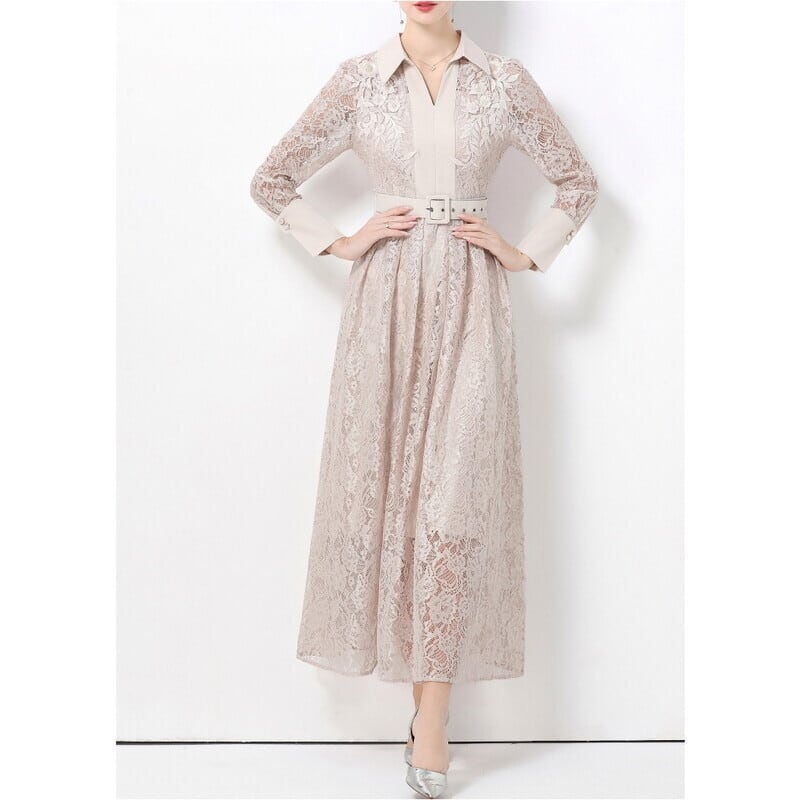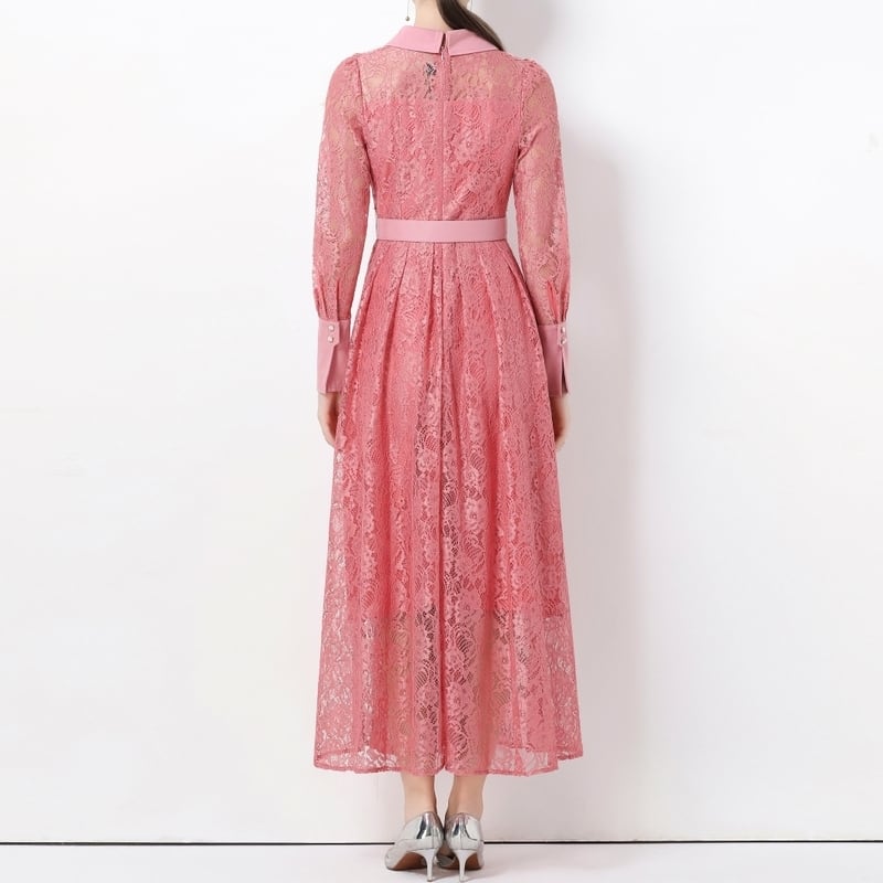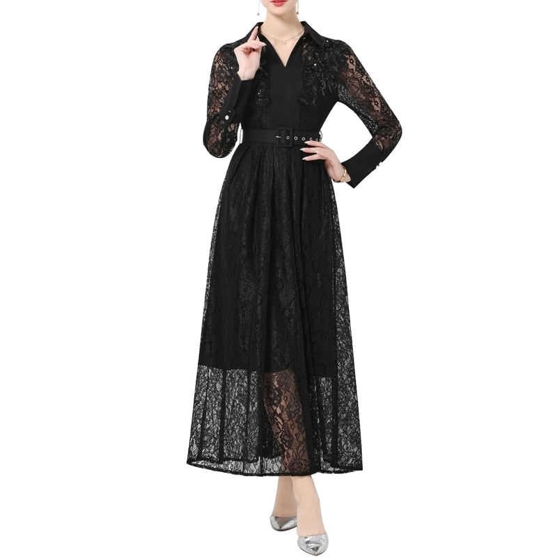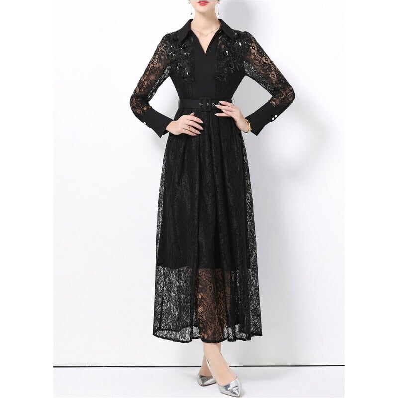 繊細な総レース仕立てが魅力的な襟付きのロング丈ドレスです。上品なフレア感が魅力的で、シックな配色が大人かわいい印象を与えます。普段使いから特別な日のコーディネートまで幅広く活躍しますので、どんな場面でもあなたを引き立ててくれること間違いなしです!