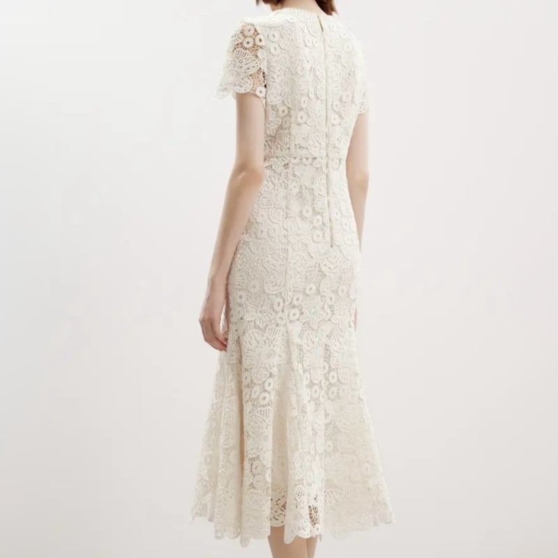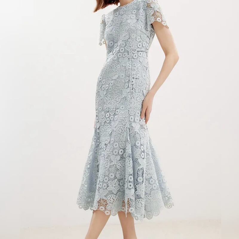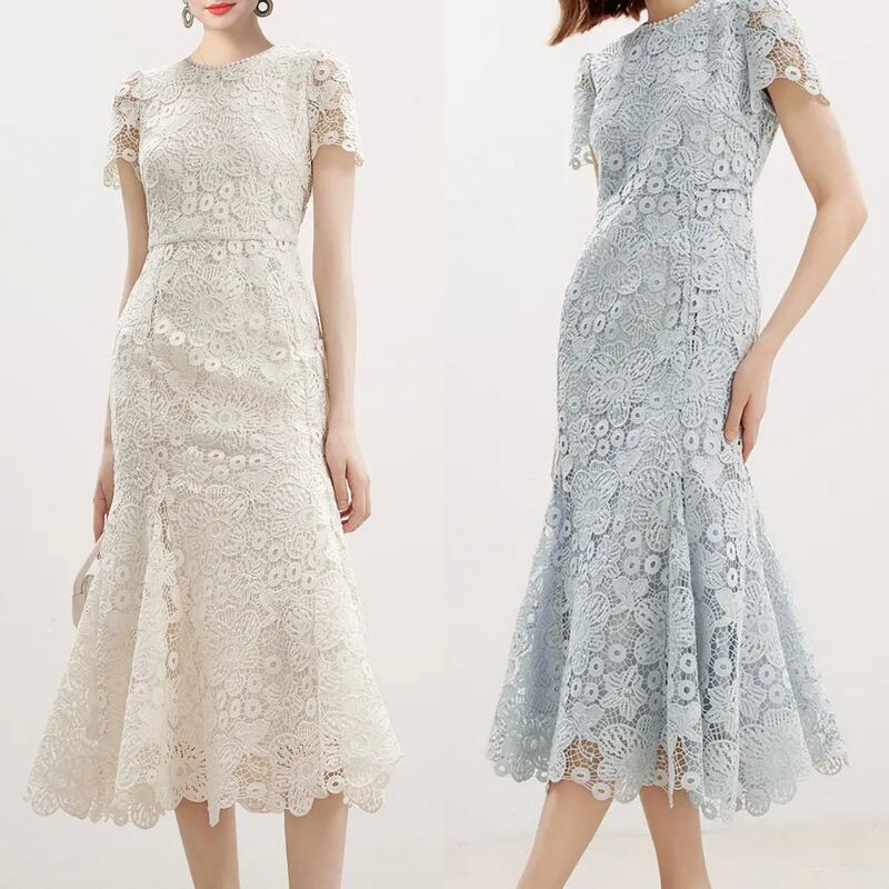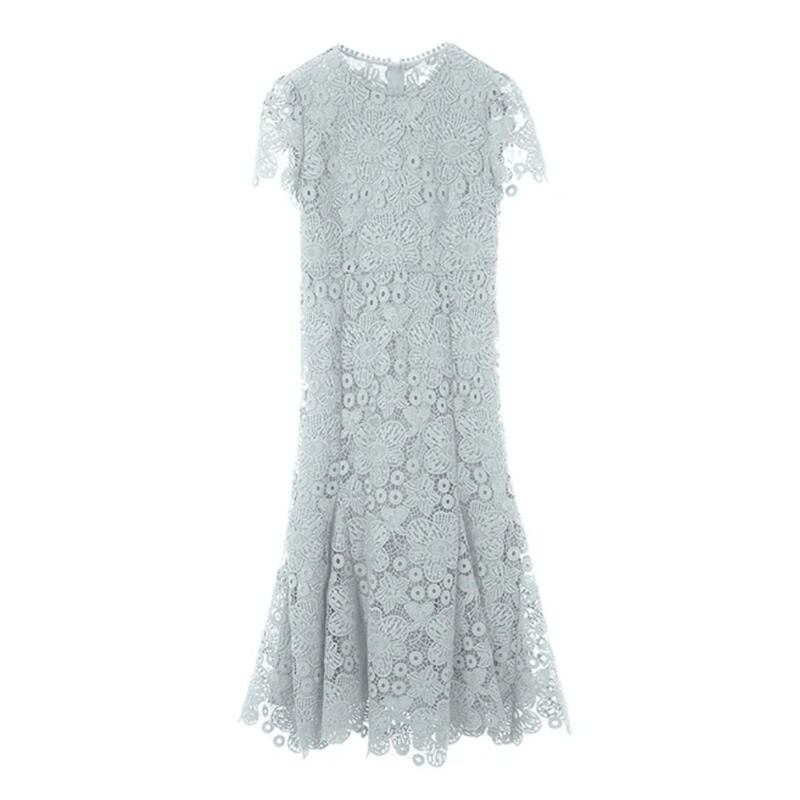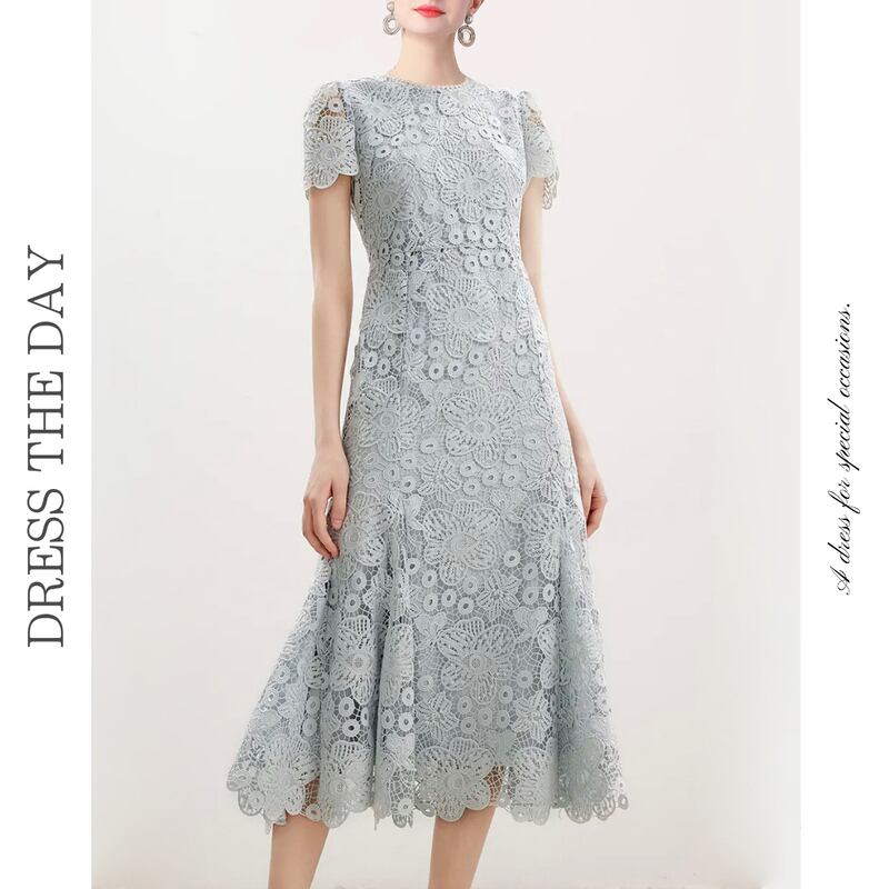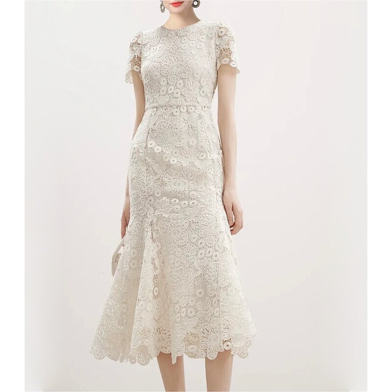 繊細な総レース仕立てが魅力的な半袖のミモレ丈ドレスです。上品なフレア感が魅力的で、フィッシュテールスカートが大人かわいい印象を与えます。普段使いから特別な日のコーディネートまで幅広く活躍しますので、どんな場面でもあなたを引き立ててくれること間違いなしです!