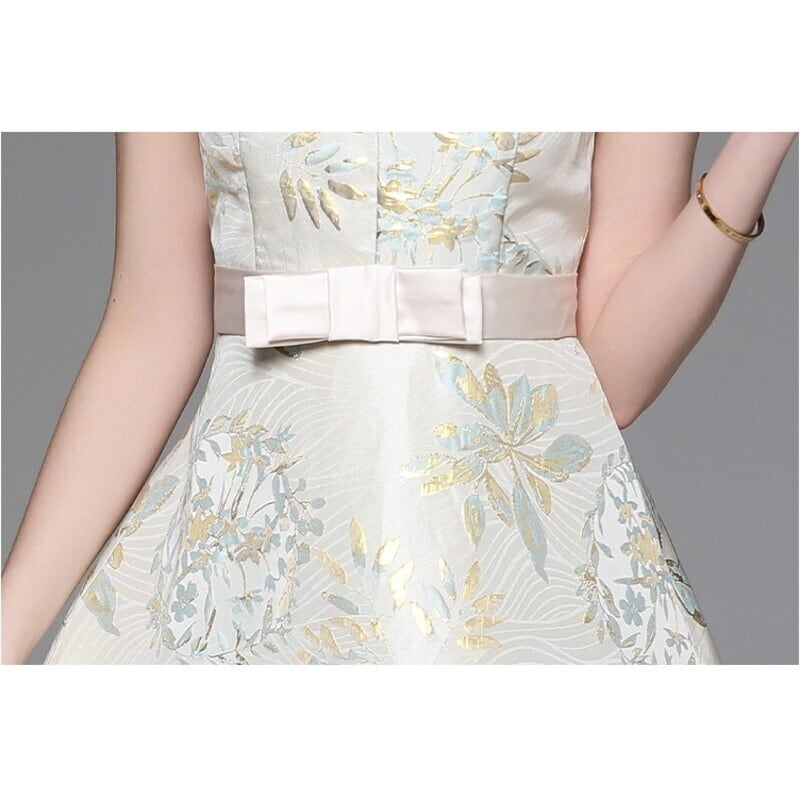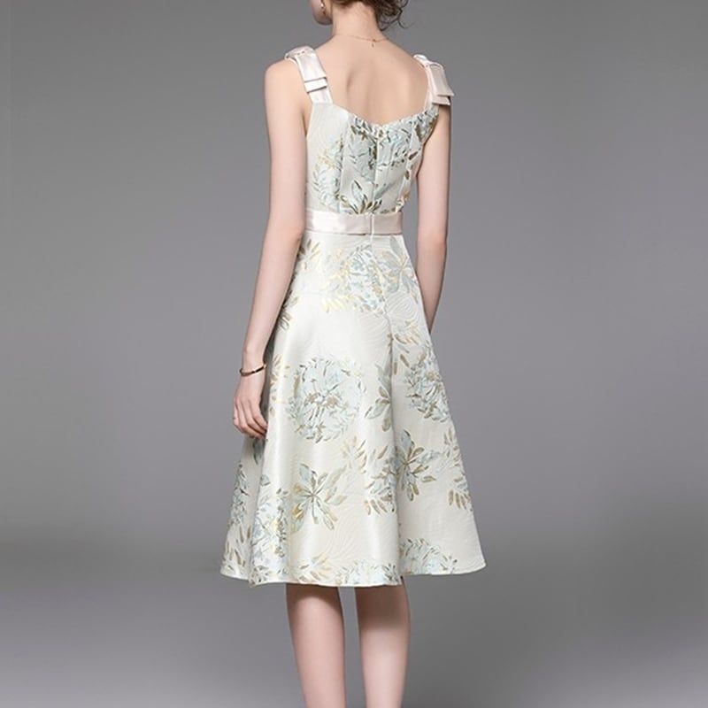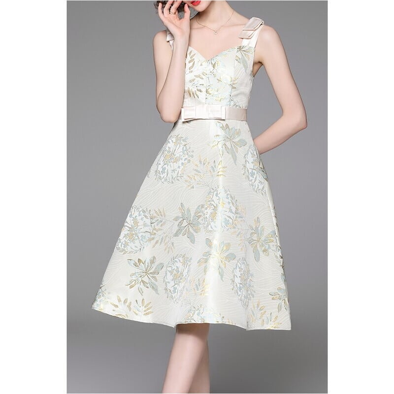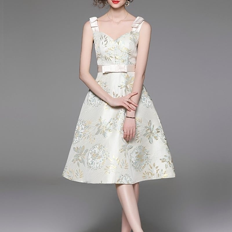 淡いジャガード生地に華やかなフラワープリントが映えるAラインドレスです。ウエストと肩紐の大ぶりなリボンが可愛らしい印象を演出します。普段使いから特別な日のコーディネートまで幅広く活躍する一着です。ふんわりと立体的なAラインスカートが体型を自然にカバーしてくれます。どんなシーンでも目を引く存在感を発揮しますので、ぜひお試しください!