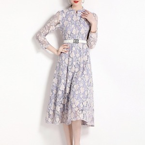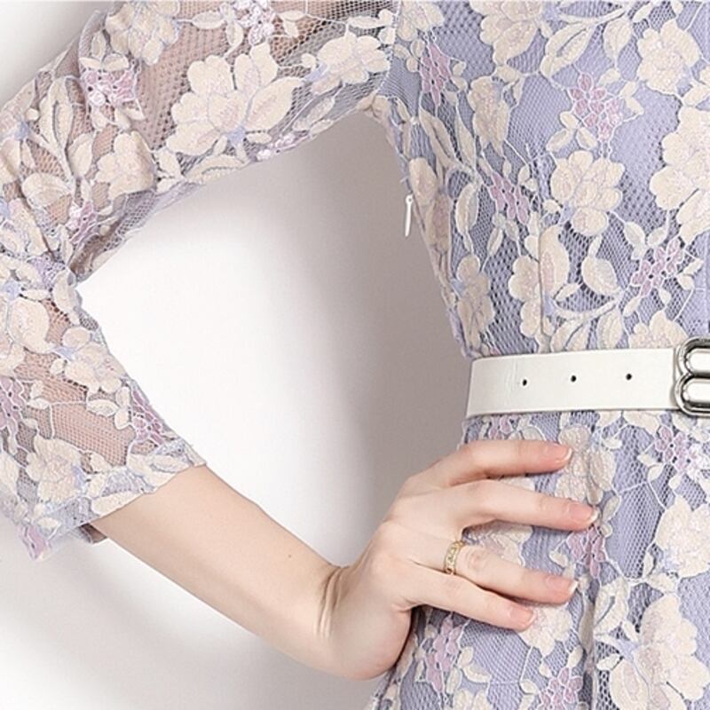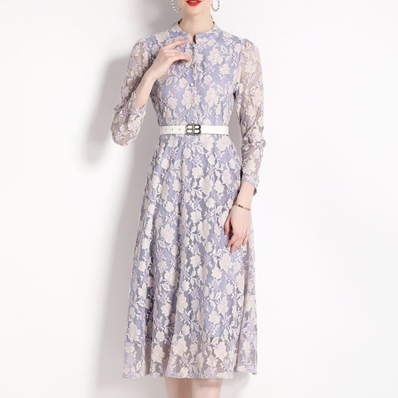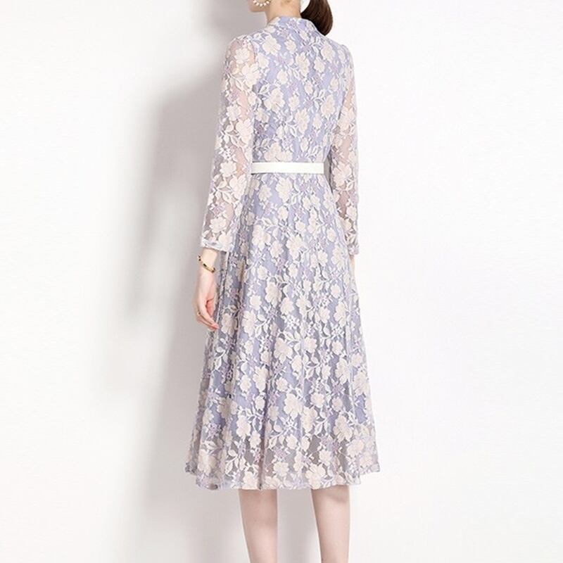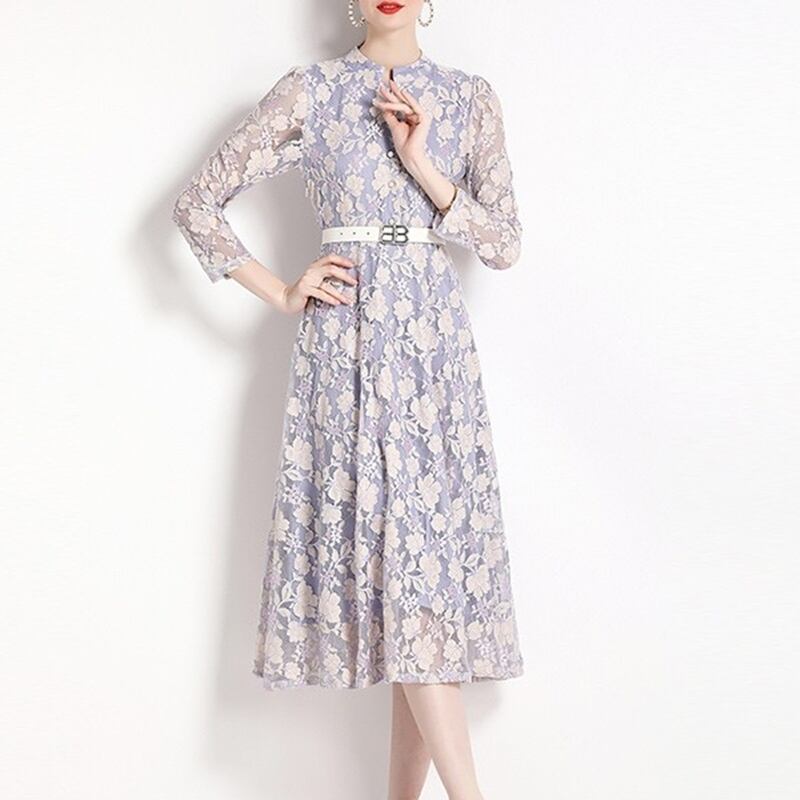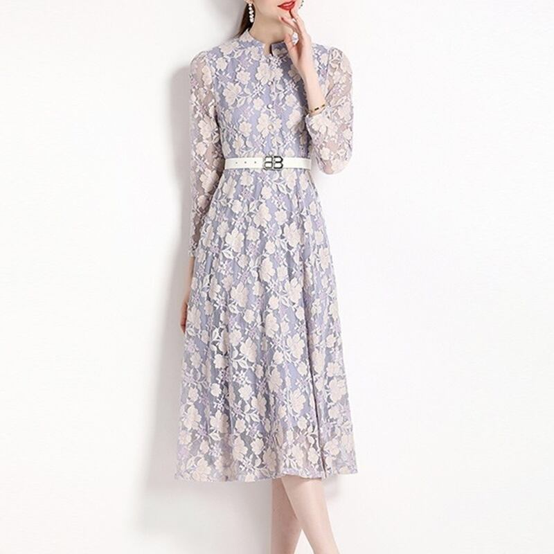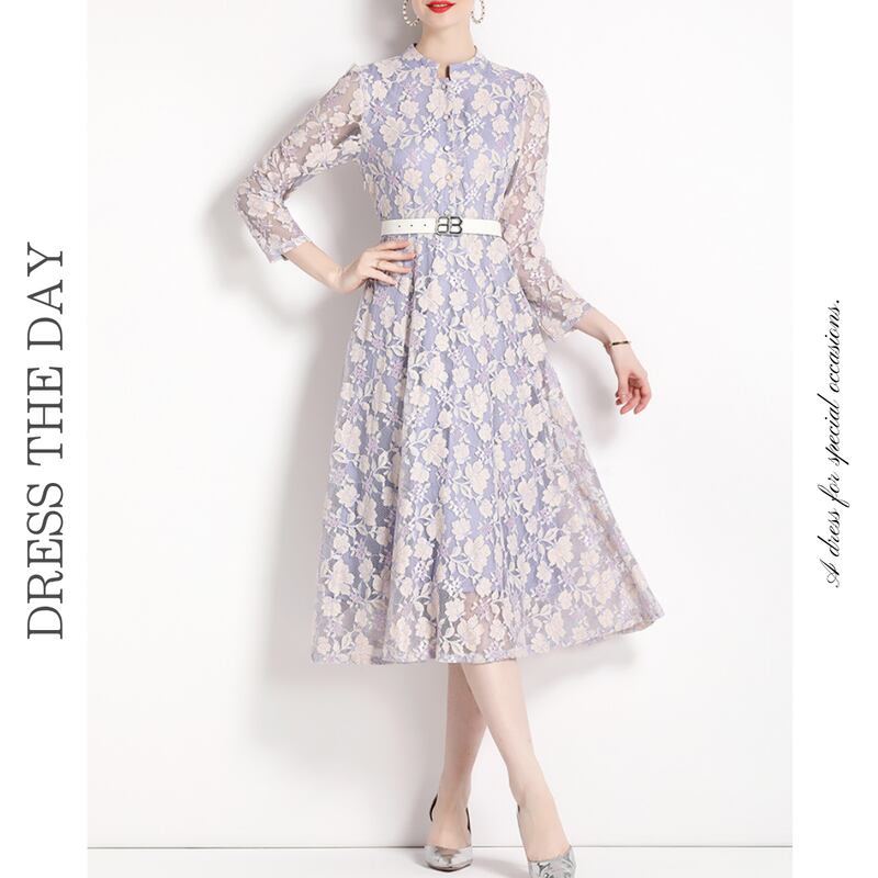 繊細な総レース仕立てで、袖の透け感が魅力的なバンドカラーのミディアム丈ドレスです。上品なフレア感が魅力的で、シックな配色が大人かわいい印象を与えます。普段使いから特別な日のコーディネートまで幅広く活躍しますので、どんな場面でもあなたを引き立ててくれること間違いなしです!