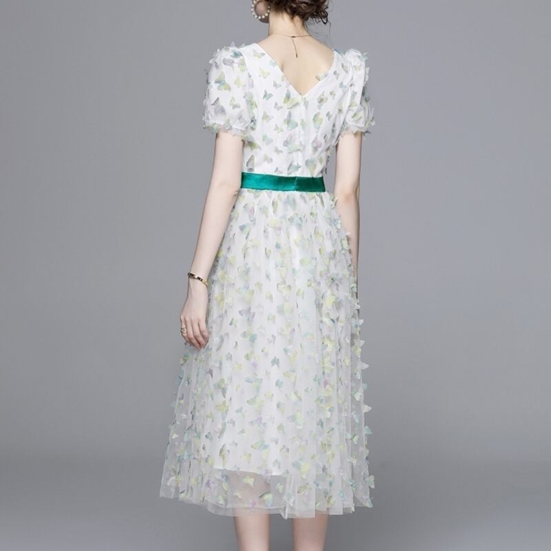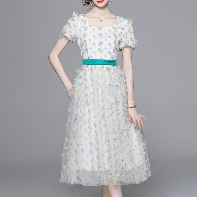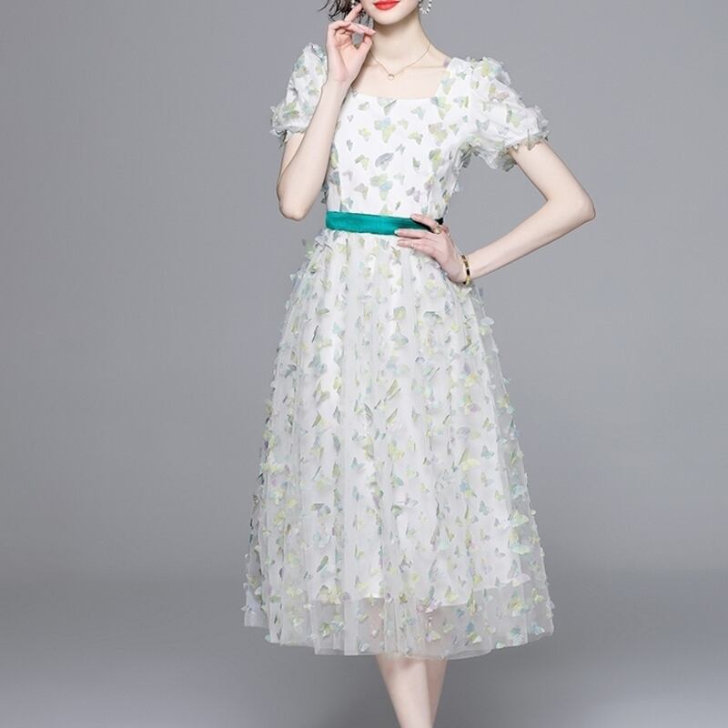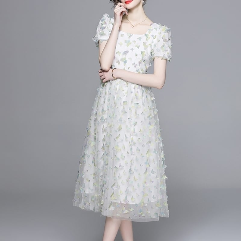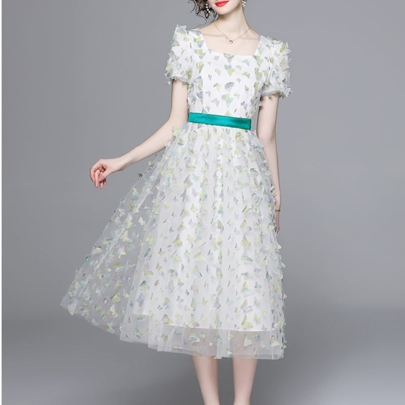 淡いチュールに華やかなバタフライモチーフが映えるシアードレスです。裾まわりのチュールの透け感が大人可愛い印象を演出します。普段使いから特別な日のコーディネートまで幅広く活躍する一着です。ウエストマークが目を引く上品なAラインスカート仕立てで、膝が隠れるミディアム丈は体型を自然にカバーしてくれます。どんなシーンでも目を引く存在感を発揮しますので、ぜひお試しください!
