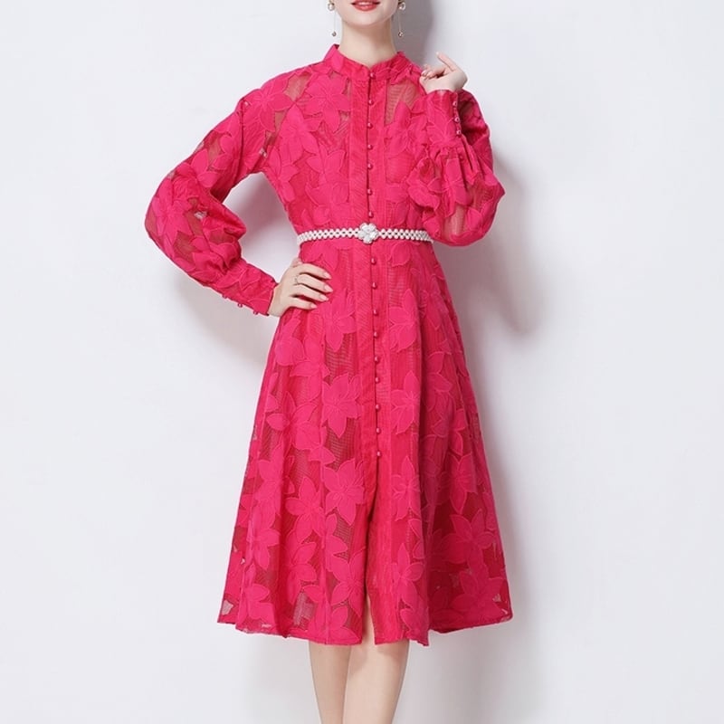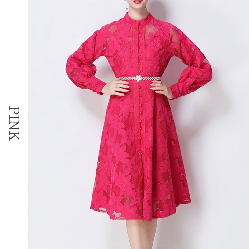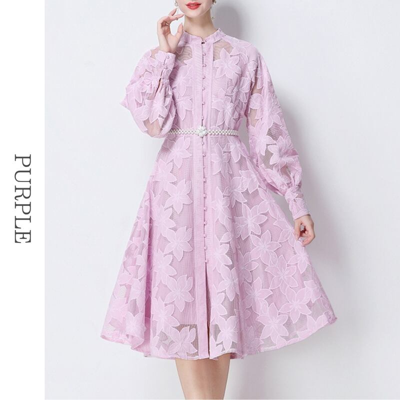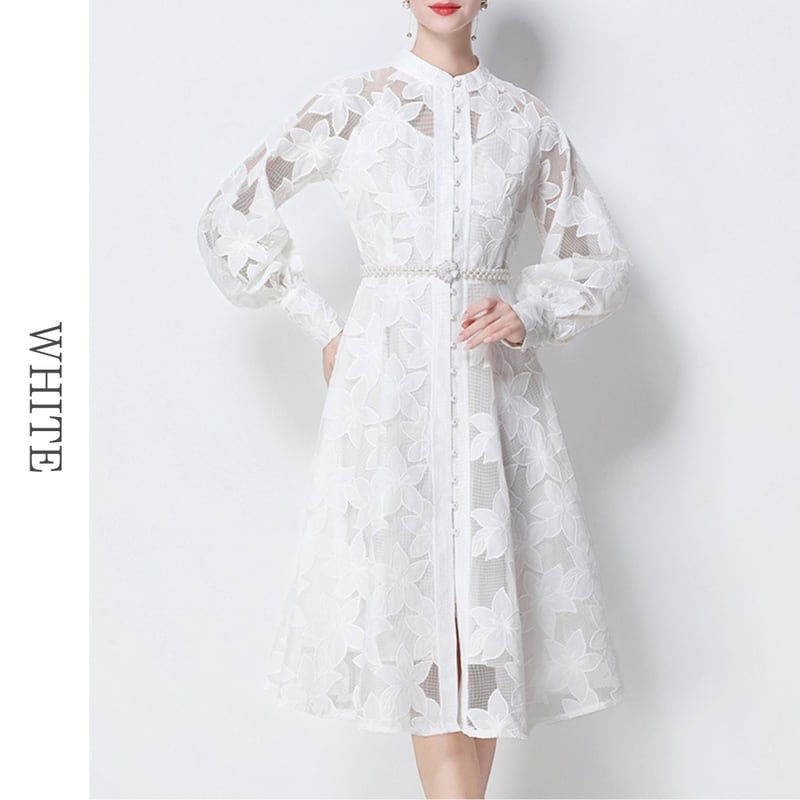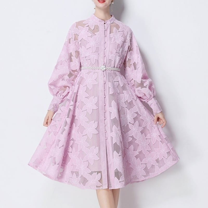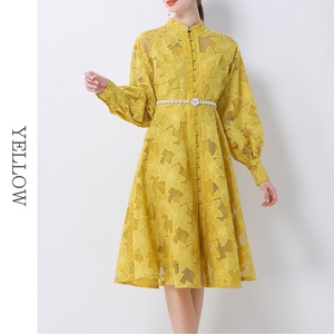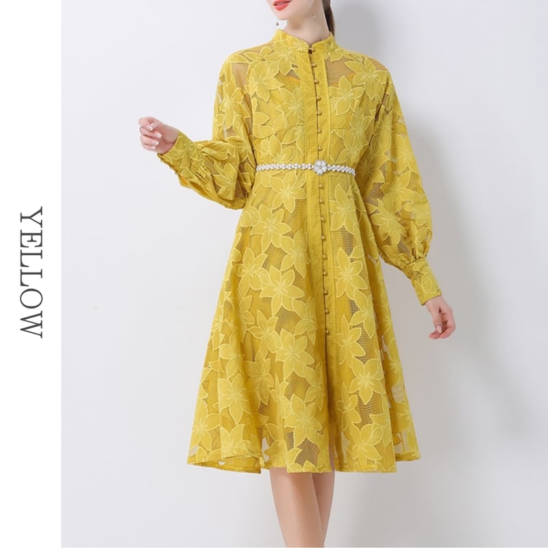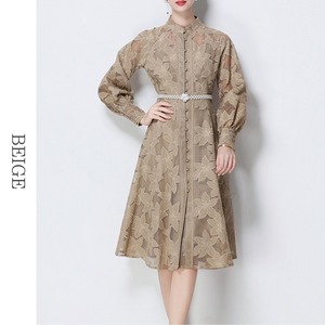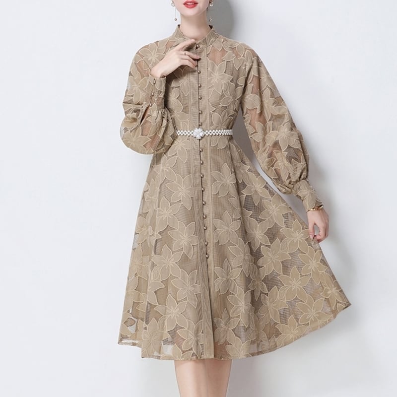 総レースの透け感が魅力的なバンドカラーのミディアム丈ドレスです。ふんわりパフスリーブと上品なフレア感が魅力的で、シックな配色が大人かわいい印象を与えます。普段使いから特別な日のコーディネートまで幅広く活躍しますので、どんな場面でもあなたを引き立ててくれること間違いなしです!