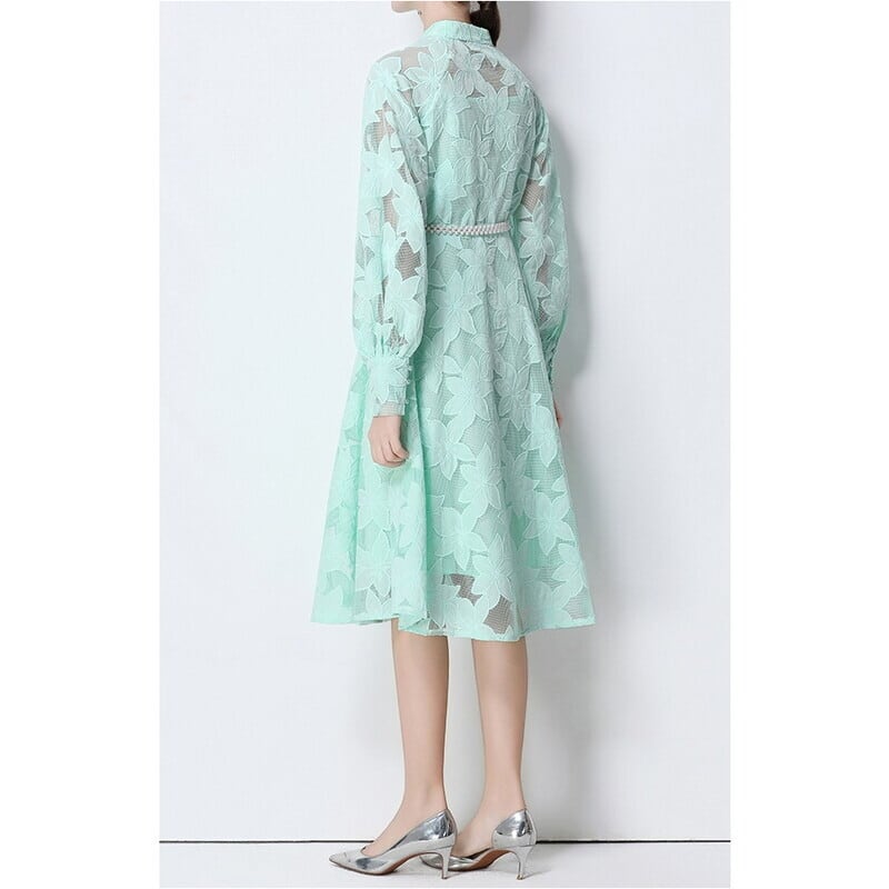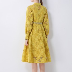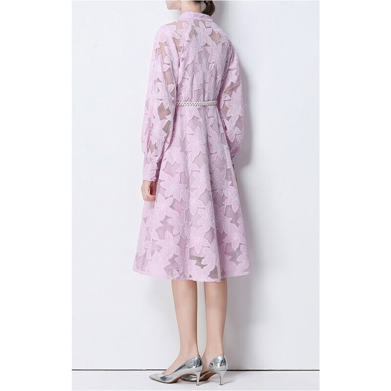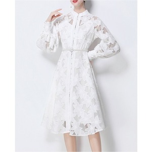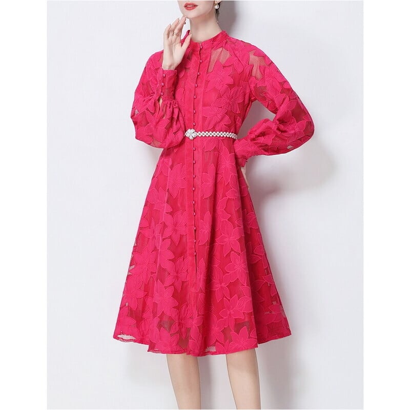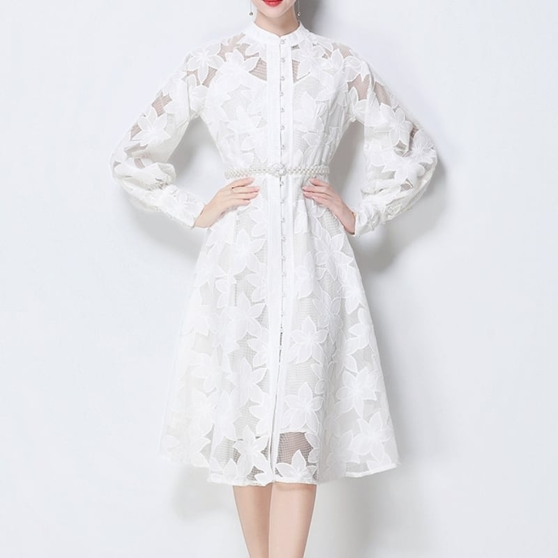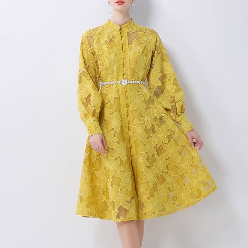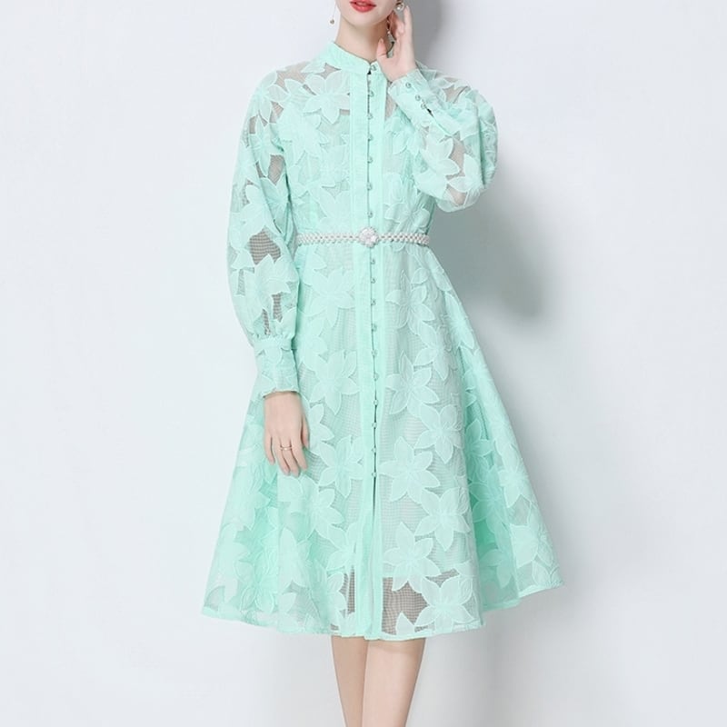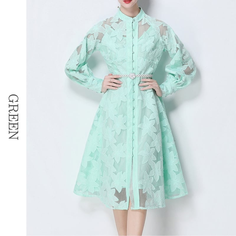総レースの透け感が魅力的なバンドカラーのミディアム丈ドレスです。ふんわりパフスリーブと上品なフレア感が魅力的で、シックな配色が大人かわいい印象を与えます。普段使いから特別な日のコーディネートまで幅広く活躍しますので、どんな場面でもあなたを引き立ててくれること間違いなしです!