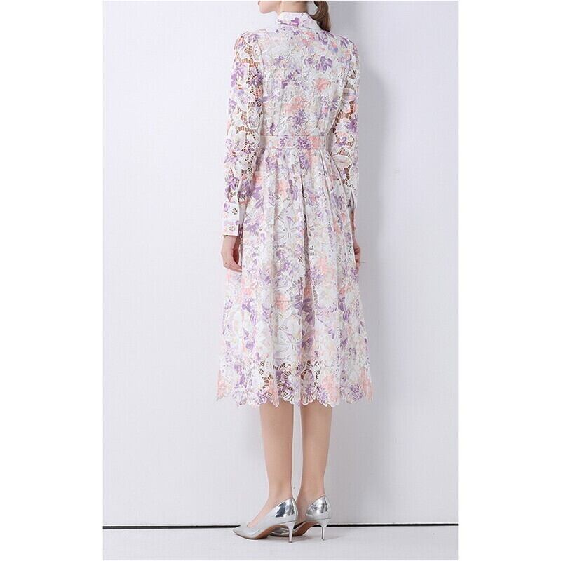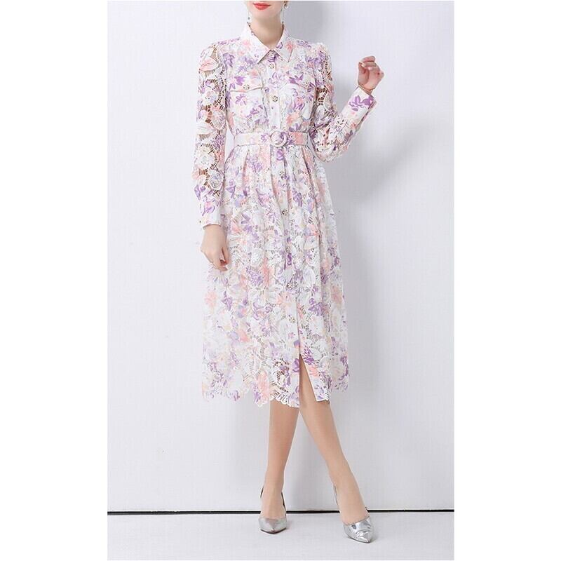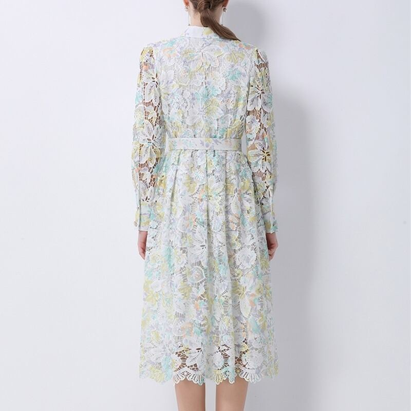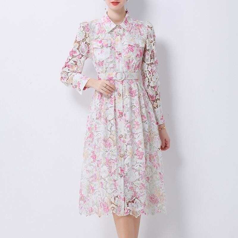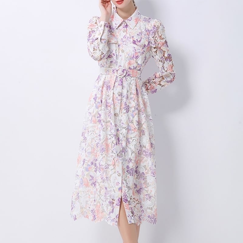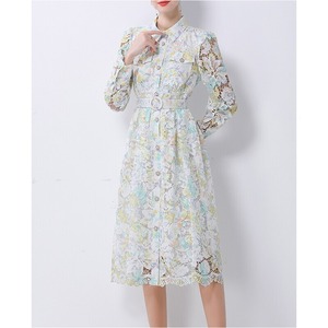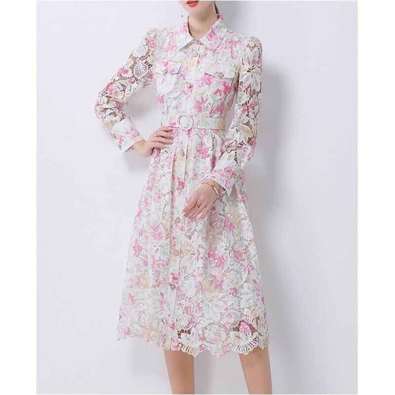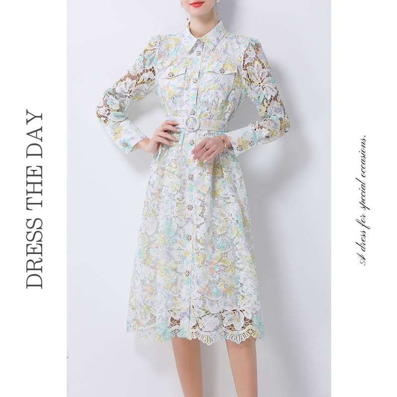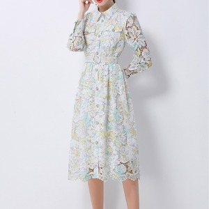 淡い配色の総レースにウエストのベルトが映えるシアードレスです。袖まわりのレースの透け感が大人可愛い印象を演出します。普段使いから特別な日のコーディネートまで幅広く活躍する一着です。カジュアルなシャツワンピース仕立てのAラインスカートで、膝が隠れるミディアム丈は体型を自然にカバーしてくれます。どんなシーンでも目を引く存在感を発揮しますので、ぜひお試しください!