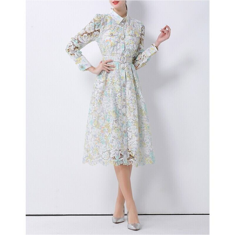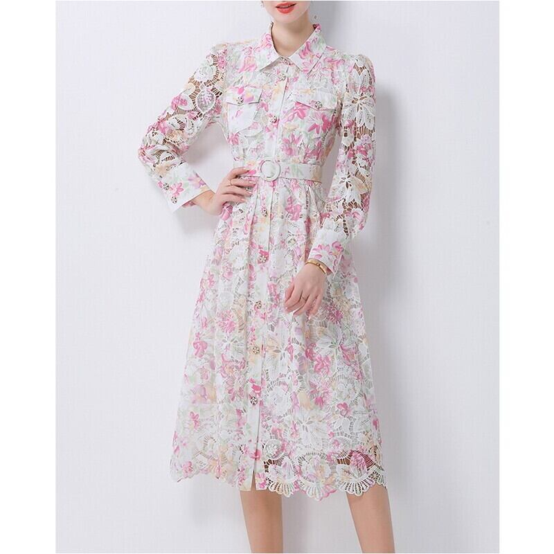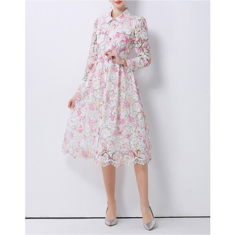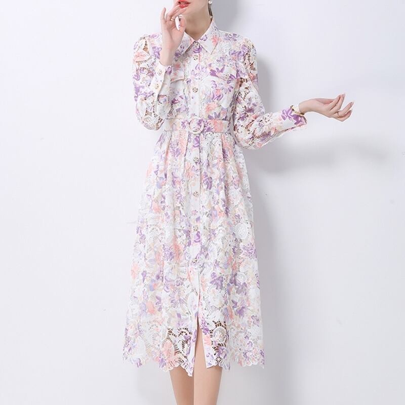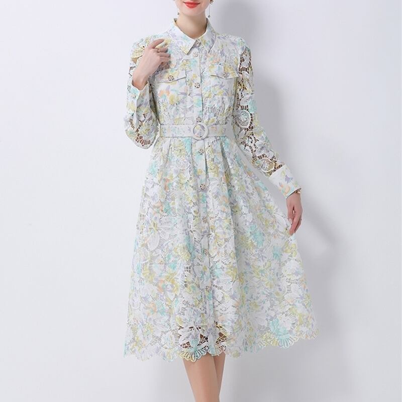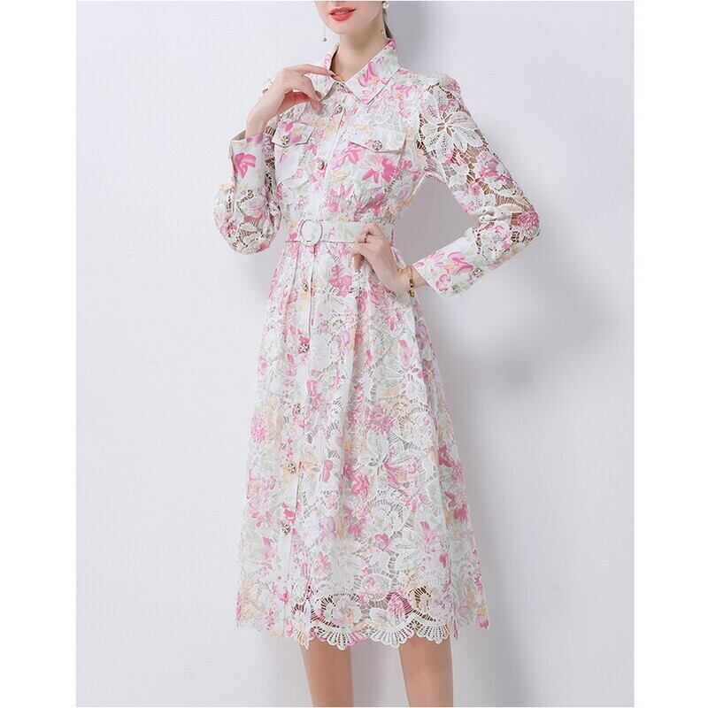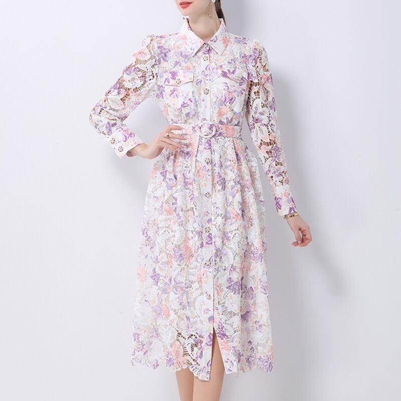 淡い配色の総レースにウエストのベルトが映えるシアードレスです。袖まわりのレースの透け感が大人可愛い印象を演出します。普段使いから特別な日のコーディネートまで幅広く活躍する一着です。カジュアルなシャツワンピース仕立てのAラインスカートで、膝が隠れるミディアム丈は体型を自然にカバーしてくれます。どんなシーンでも目を引く存在感を発揮しますので、ぜひお試しください!