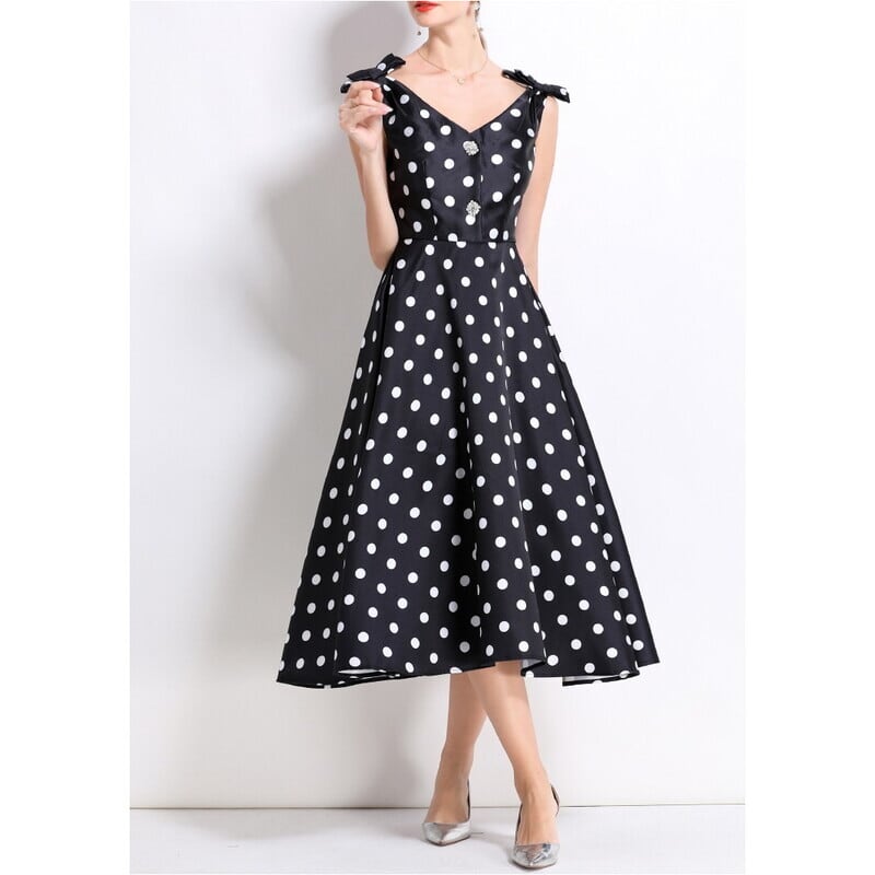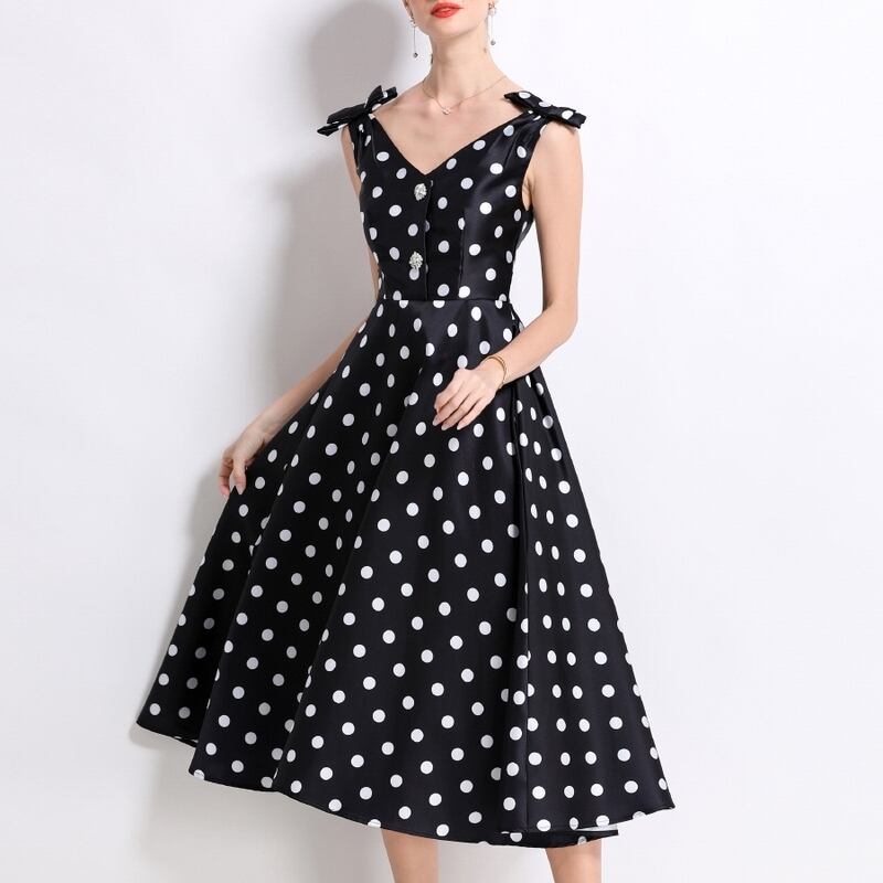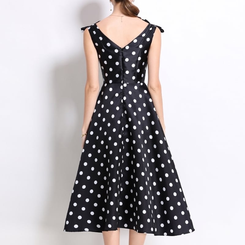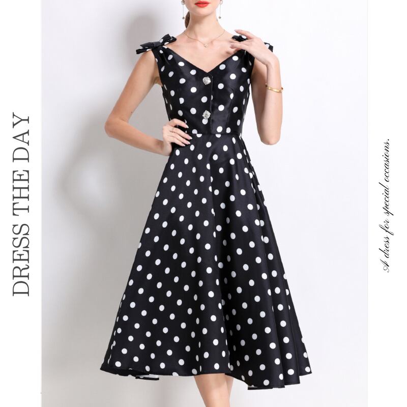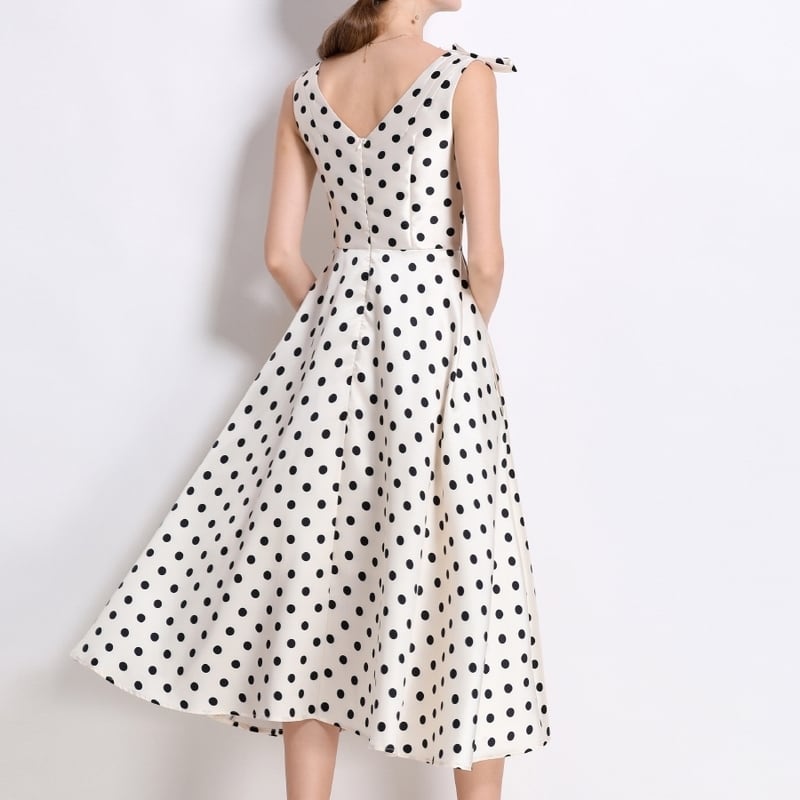 レトロなポルカドットパターンが目を引くミモレ丈ドレスです。肩にリボンをあしらったVネックと上品なフレア感が魅力的で、ボリューム感のあるスカートが大人かわいい印象を与えます。普段使いから特別な日のコーディネートまで幅広く活躍しますので、どんな場面でもあなたを引き立ててくれること間違いなしです!