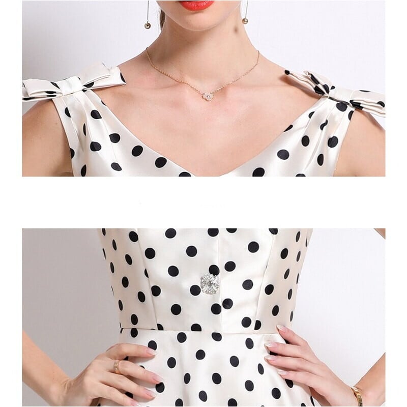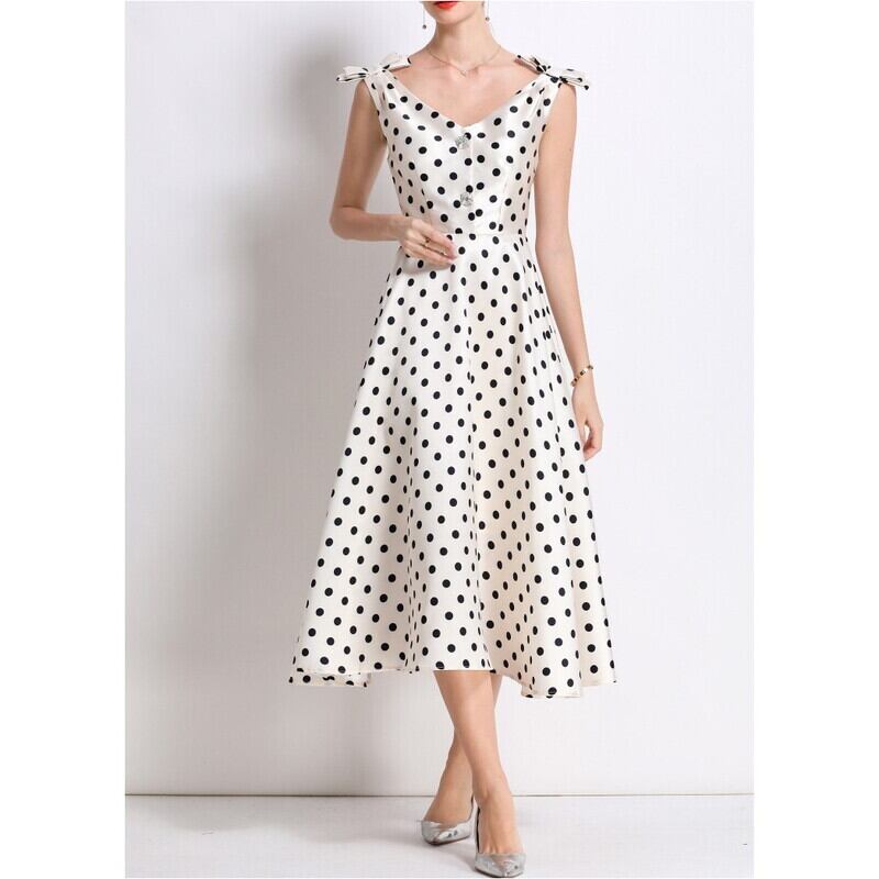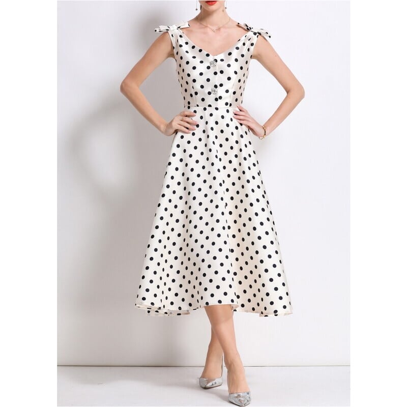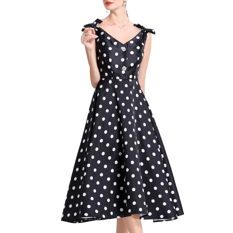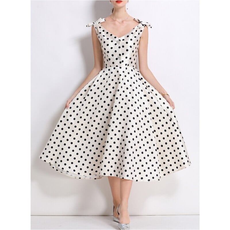 レトロなポルカドットパターンが目を引くミモレ丈ドレスです。肩にリボンをあしらったVネックと上品なフレア感が魅力的で、ボリューム感のあるスカートが大人かわいい印象を与えます。普段使いから特別な日のコーディネートまで幅広く活躍しますので、どんな場面でもあなたを引き立ててくれること間違いなしです!