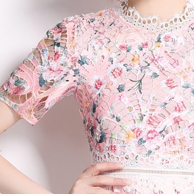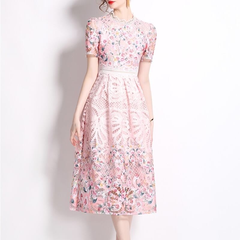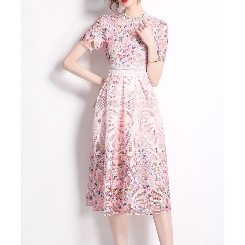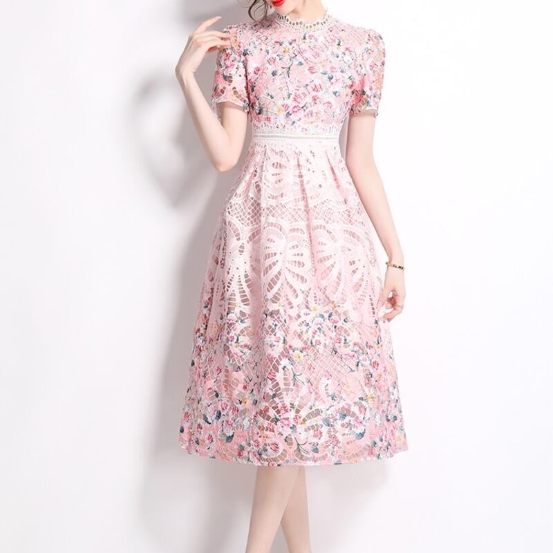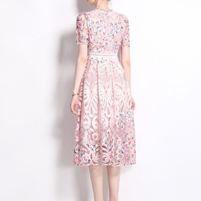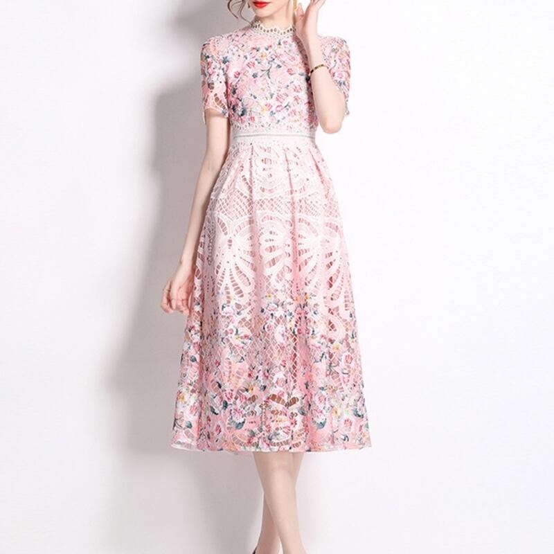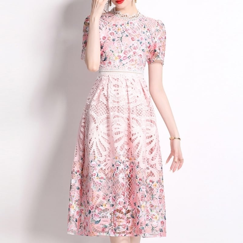 繊細なパンチングレース仕立てが魅力的なミディアム丈ドレスです。上品なフレア感が魅力的で、フラワー柄の透け感ある仕立てが大人かわいい印象を与えます。普段使いから特別な日のコーディネートまで幅広く活躍しますので、どんな場面でもあなたを引き立ててくれること間違いなしです!