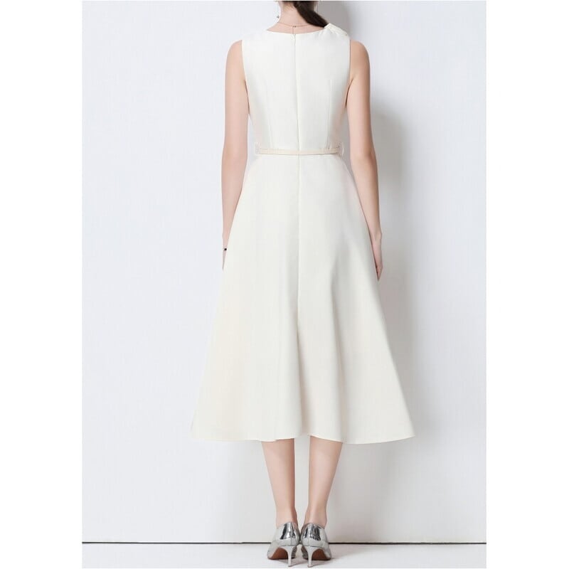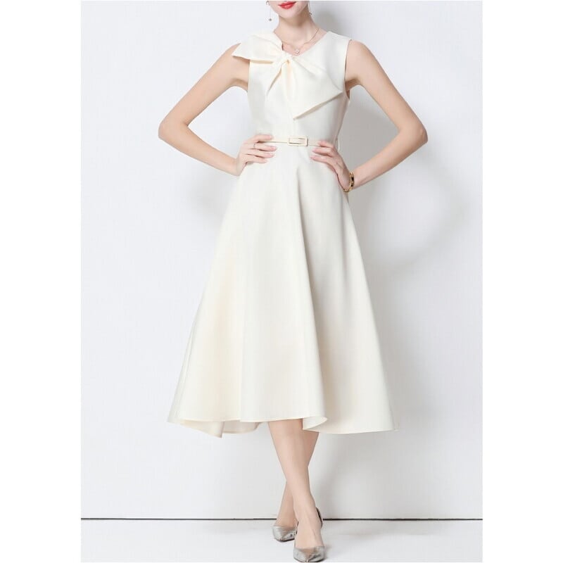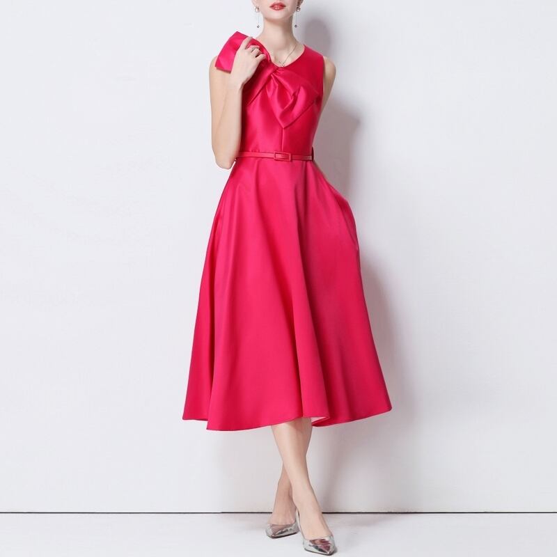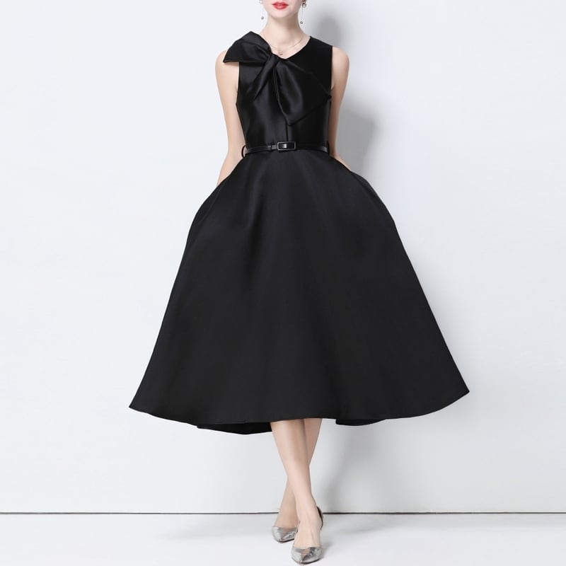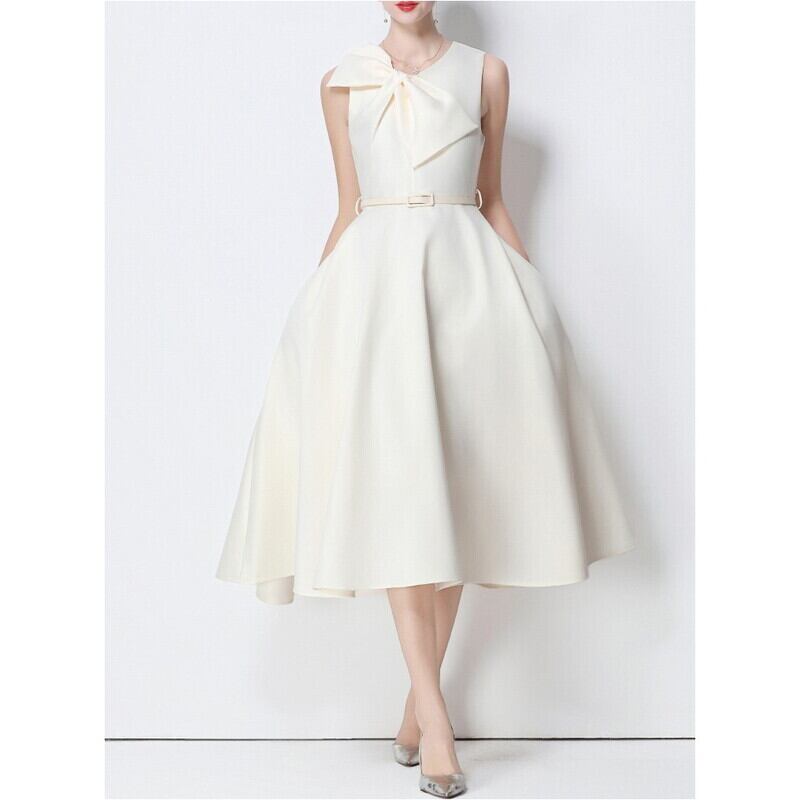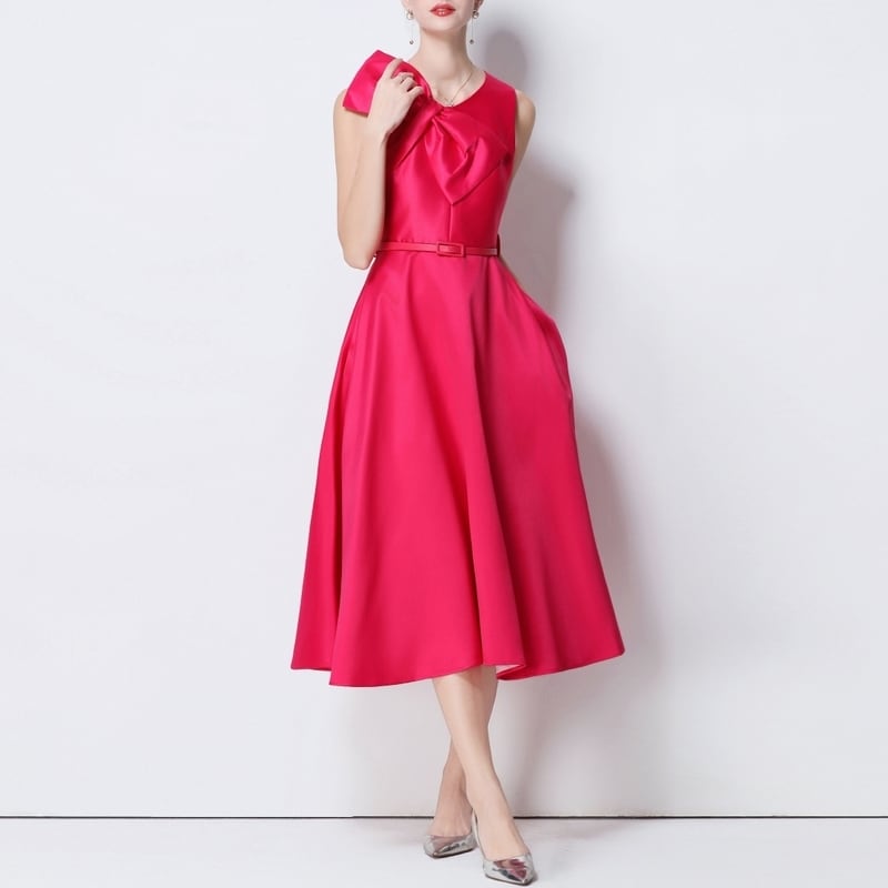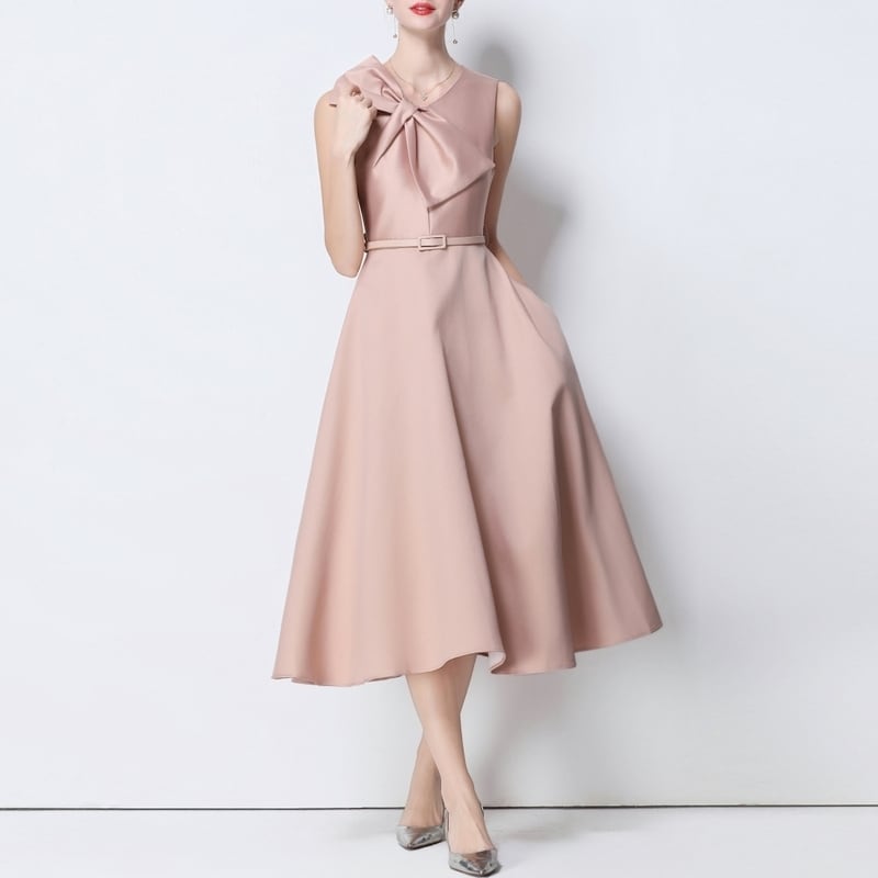 シームレスで滑らかなデザインが洗練されたビッグリボンがアクセントのミモレ丈ドレスです。ふんわりと上品なボリューム感のあるフレアスカートが大人かわいい印象を与えます。普段使いから特別な日のコーディネートまで幅広く活躍しますので、どんな場面でもあなたを引き立ててくれること間違いなしです!