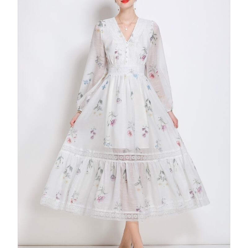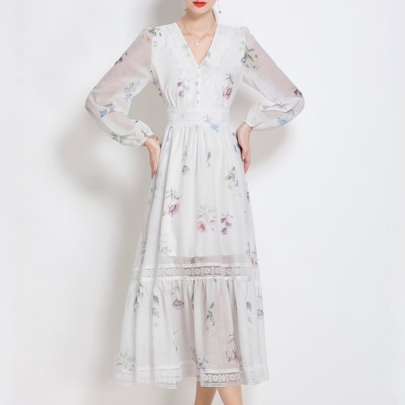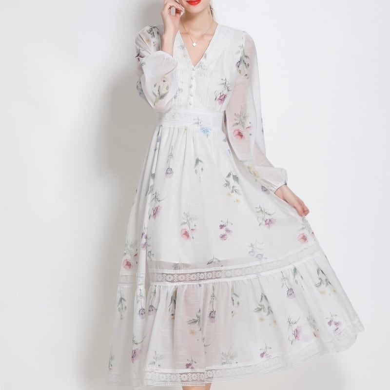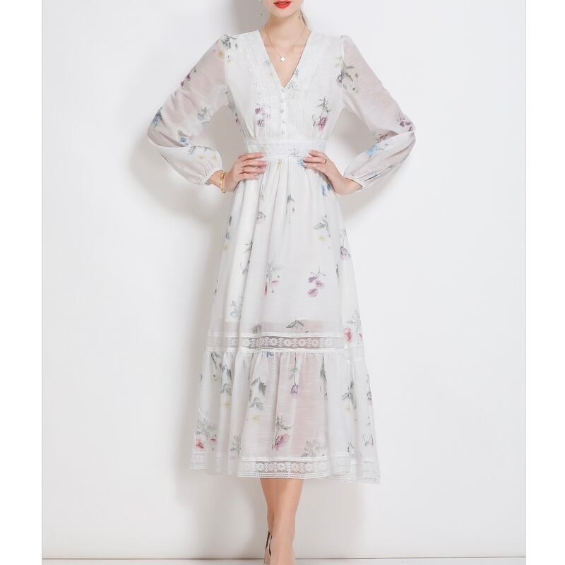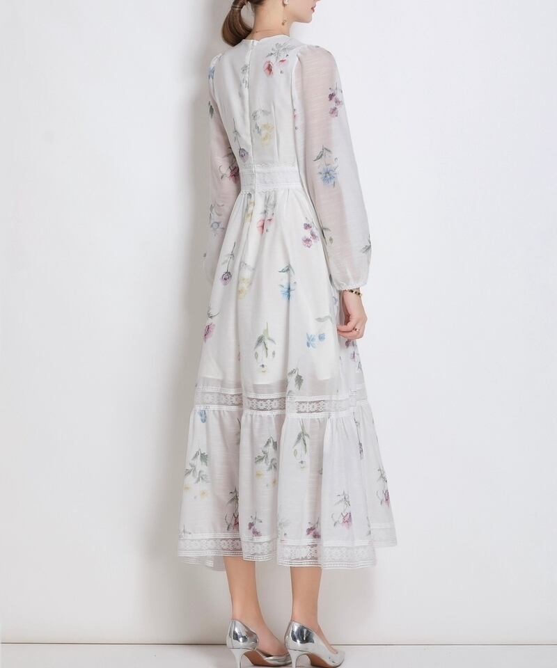 淡いフラワープリントが魅力的な、さり気なく透け感のあるVネックドレスです。シフォンのとろみ感が可愛らしい印象で、繊細なデコルテまわりのレース装飾が華やかさを演出します。普段使いから特別な日のコーディネートまで幅広く活躍する一着です。ミモレ着丈は体型を自然にカバーしてくれます。どんなシーンでも目を引く存在感を発揮しますので、ぜひお試しください!