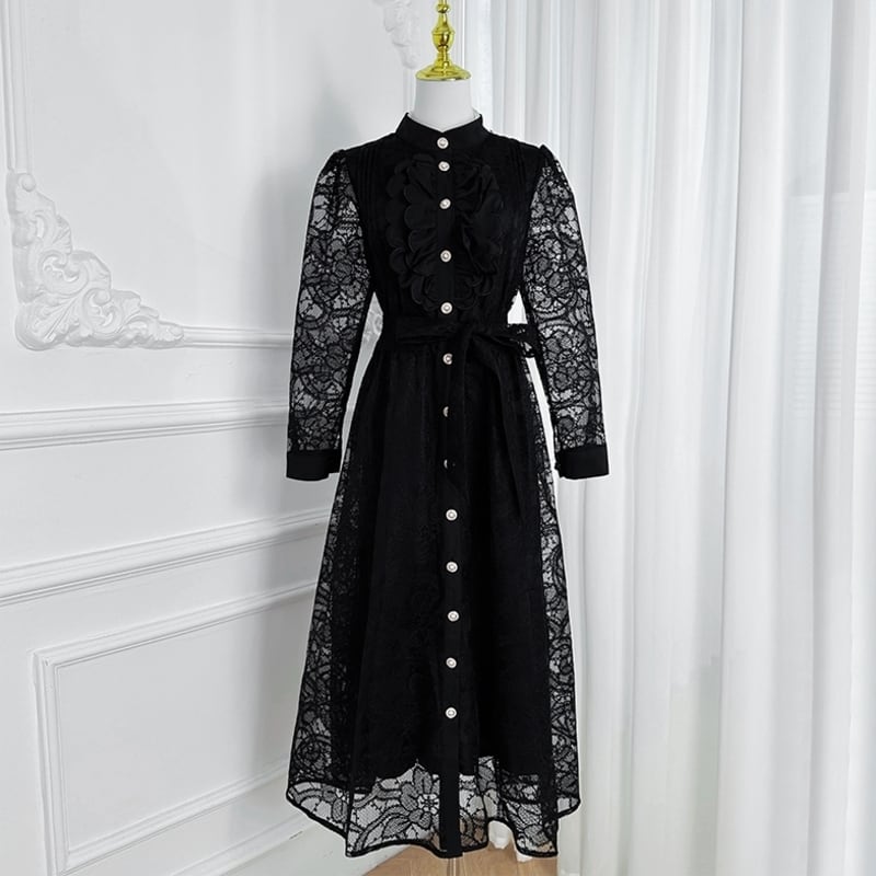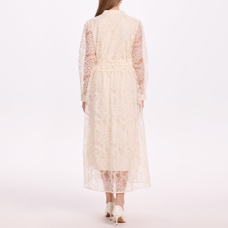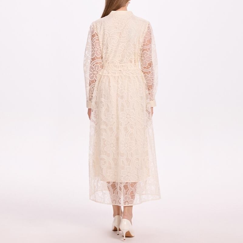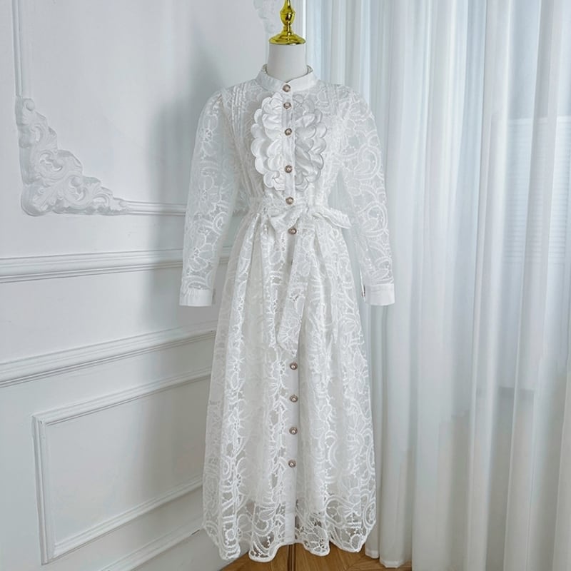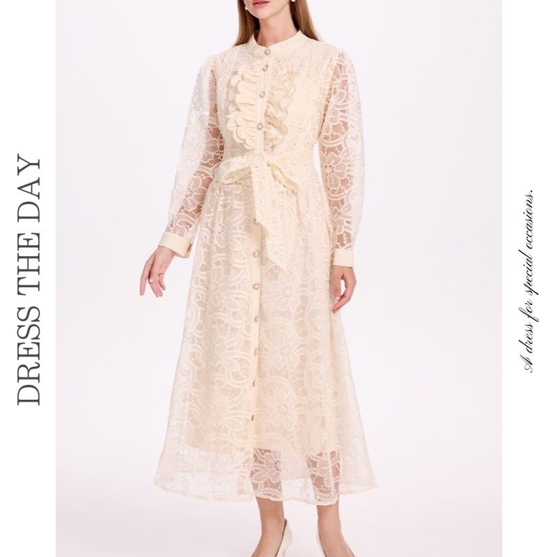 クラシカルな総レースにウエストのリボンベルトが映えるシアードレスです。膝や袖まわりのレースの透け感が大人可愛い印象を演出します。普段使いから特別な日のコーディネートまで幅広く活躍する一着です。カジュアルなシャツワンピース仕立てのAラインスカートで、ロング丈は体型を自然にカバーしてくれます。どんなシーンでも目を引く存在感を発揮しますので、ぜひお試しください!