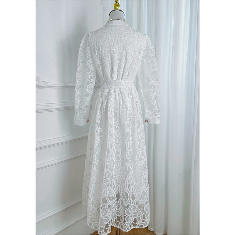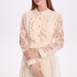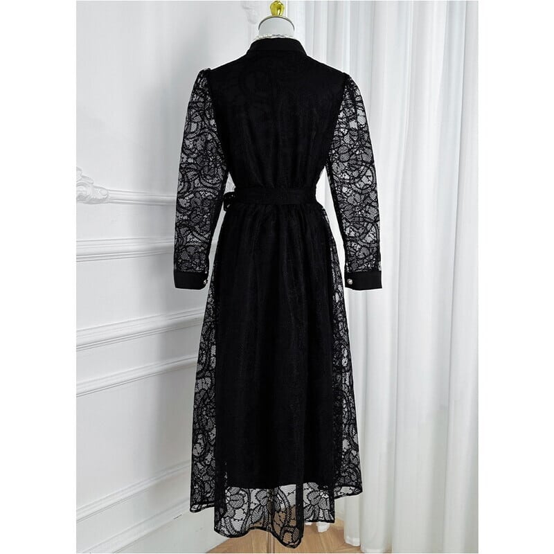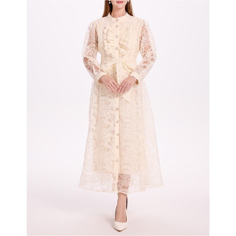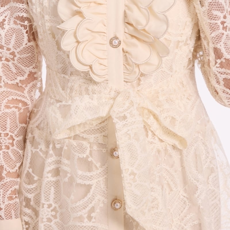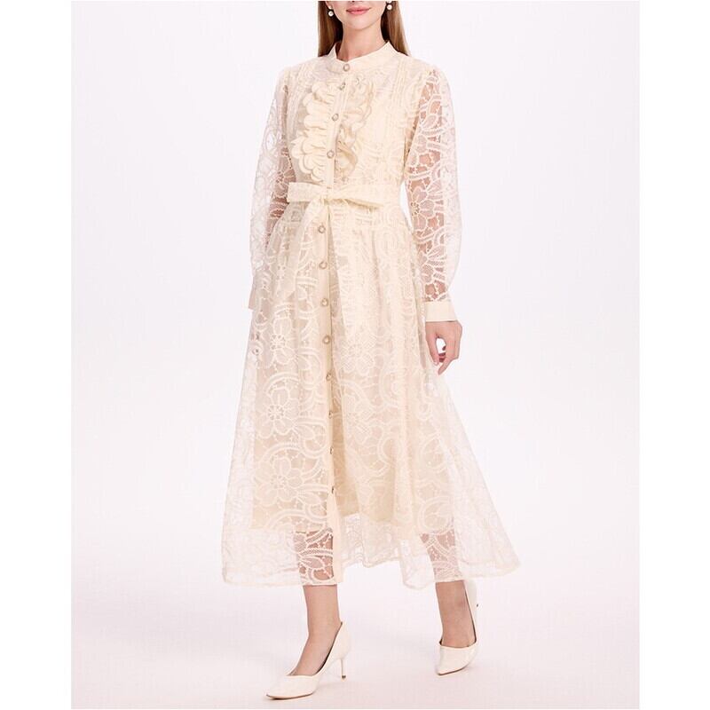 クラシカルな総レースにウエストのリボンベルトが映えるシアードレスです。膝や袖まわりのレースの透け感が大人可愛い印象を演出します。普段使いから特別な日のコーディネートまで幅広く活躍する一着です。カジュアルなシャツワンピース仕立てのAラインスカートで、ロング丈は体型を自然にカバーしてくれます。どんなシーンでも目を引く存在感を発揮しますので、ぜひお試しください!