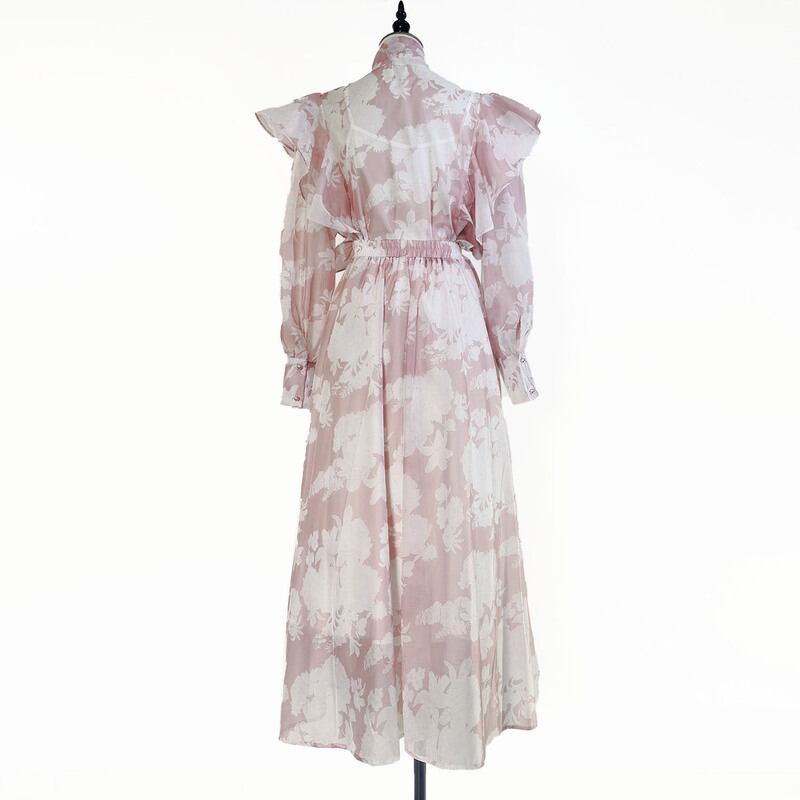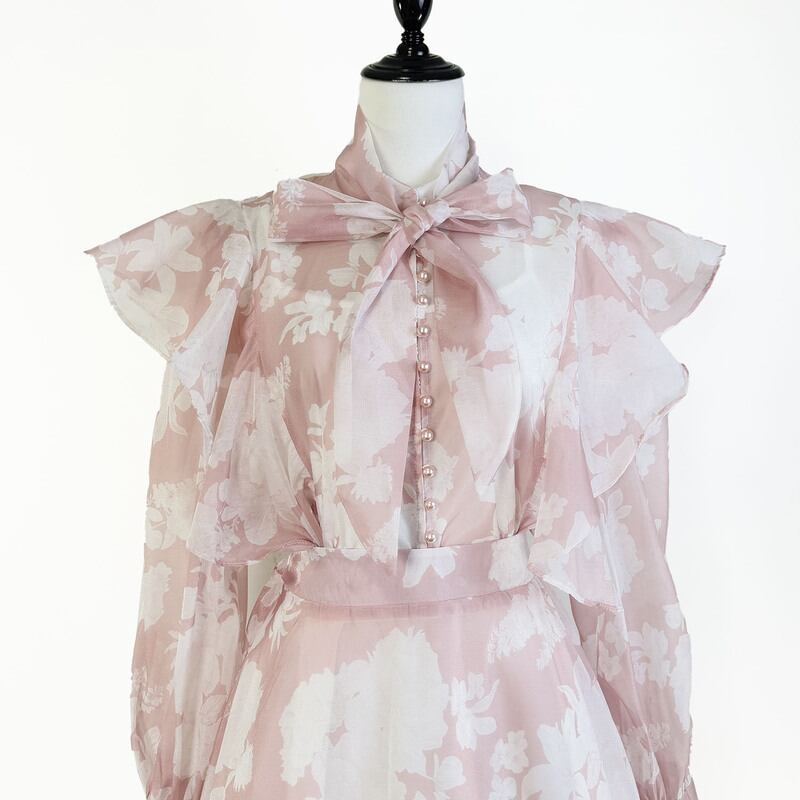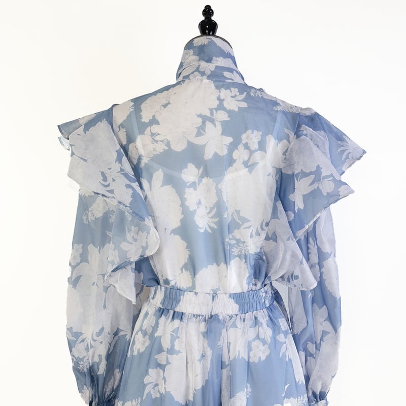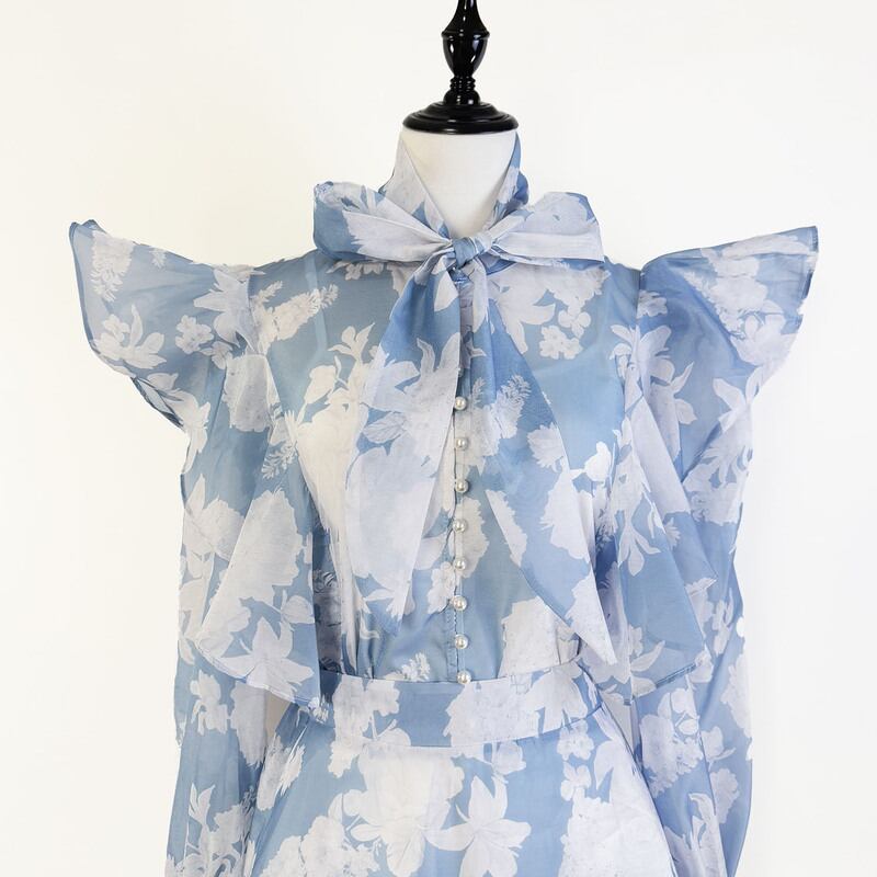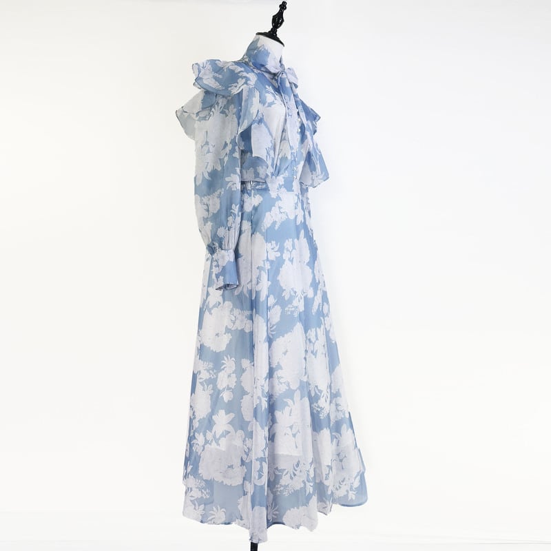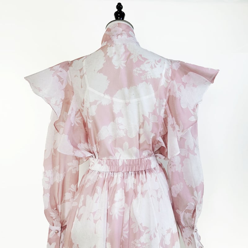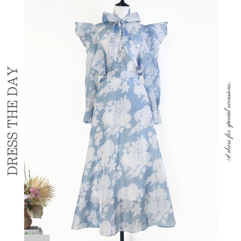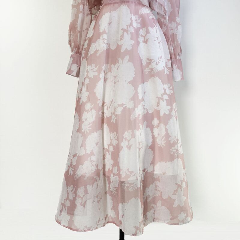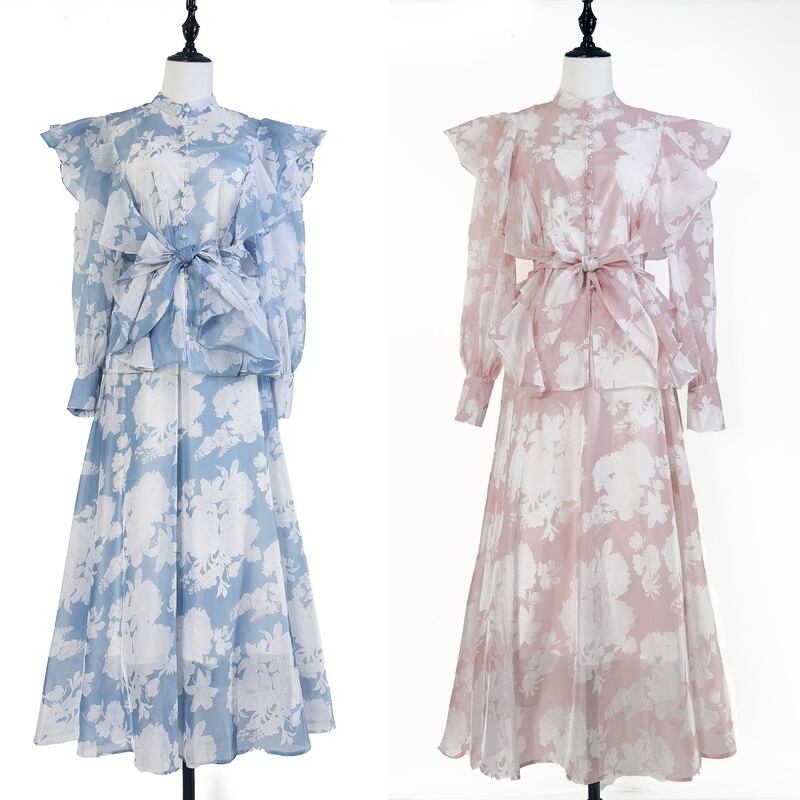 付属のリボンでアレンジを楽しめる魅力的なフラワープリントセットドレスです。白抜きのプリントがレトロで可愛らしい印象を演出します。普段使いから特別な日のコーディネートまで幅広く活躍する一着です。肩のフリルがクラシカルなブラウスは華やかで、フレアスカートは体型を自然にカバーしてくれます。どんなシーンでも目を引く存在感を発揮しますので、ぜひお試しください!