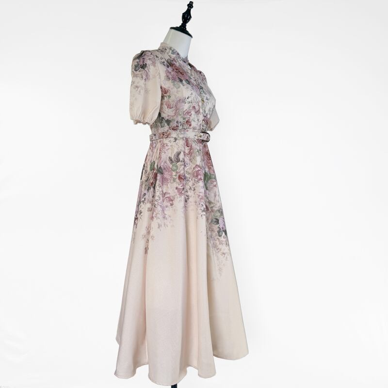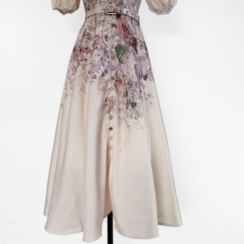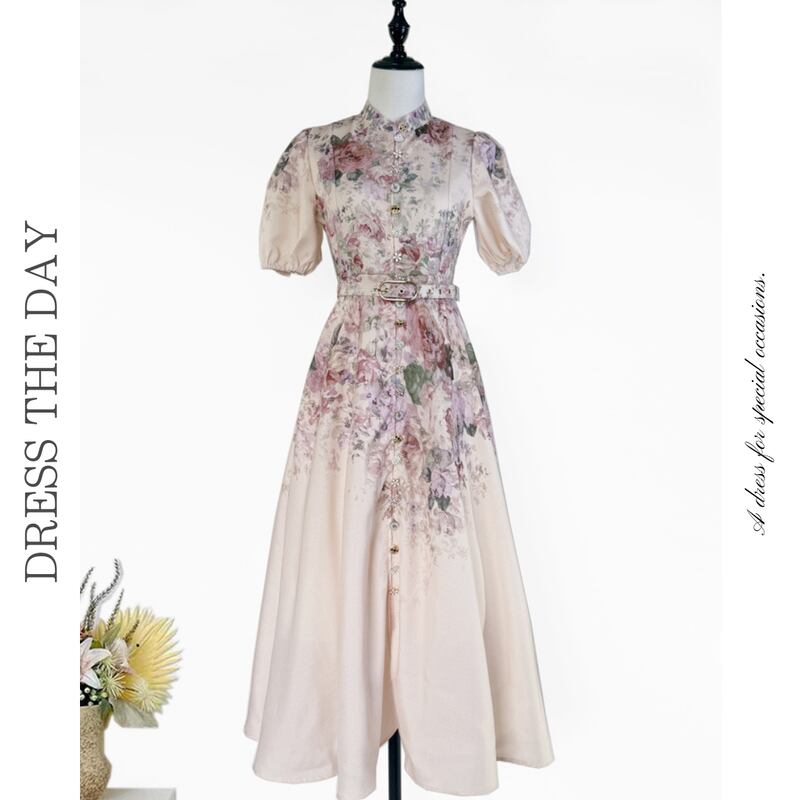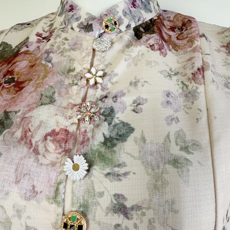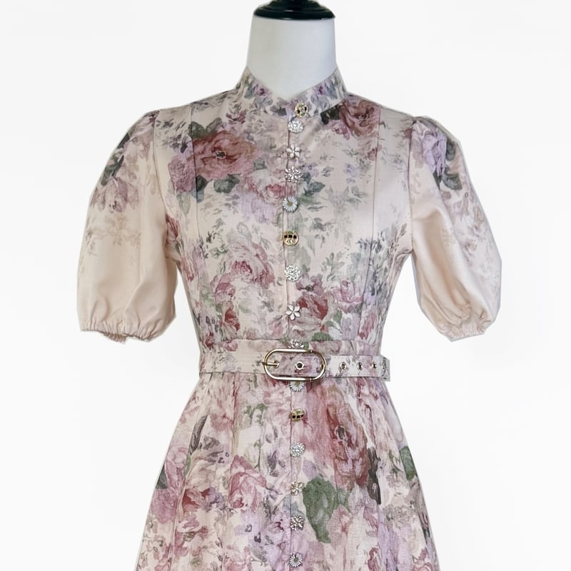 鮮やかなフラワープリントが魅力的なふんわりパフスリーブドレスです。様々な個性派ボタンをあしらい愛らしい華やかさをプラスします。普段使いから特別な日のコーディネートまで幅広く活躍する一着です。ミモレ着丈は体型を自然にカバーしてくれます。どんなシーンでも目を引く存在感を発揮しますので、ぜひお試しください!