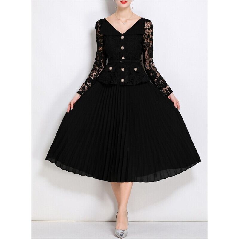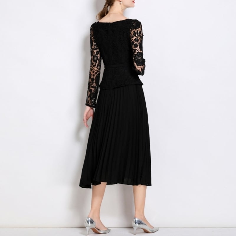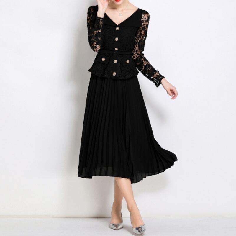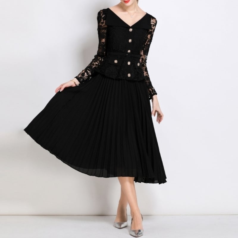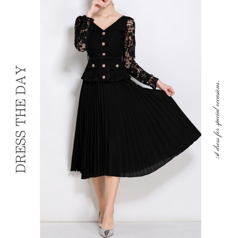 金ボタンがクラシカルなペプラムトップスと、プリーツスカートがドッキングしたデザインのミモレ丈ドレスです。トップのVネックと上品な透け感と、Aラインが綺麗なプリーツスカートの組み合わせが魅力的で、シックな配色が大人かわいい印象を与えます。普段使いから特別な日のコーディネートまで幅広く活躍しますので、どんな場面でもあなたを引き立ててくれること間違いなしです!