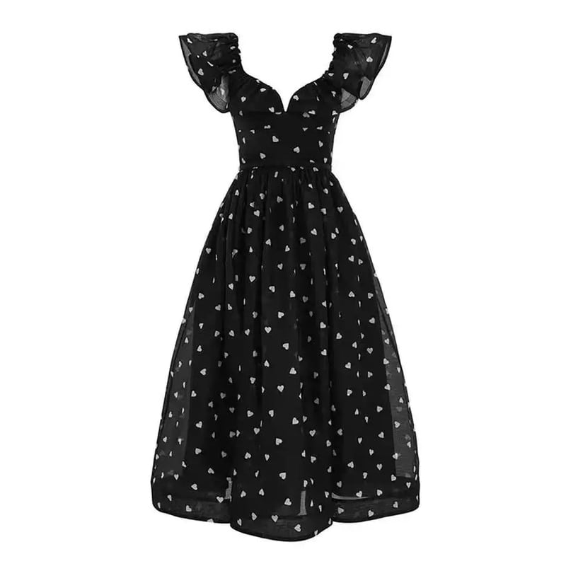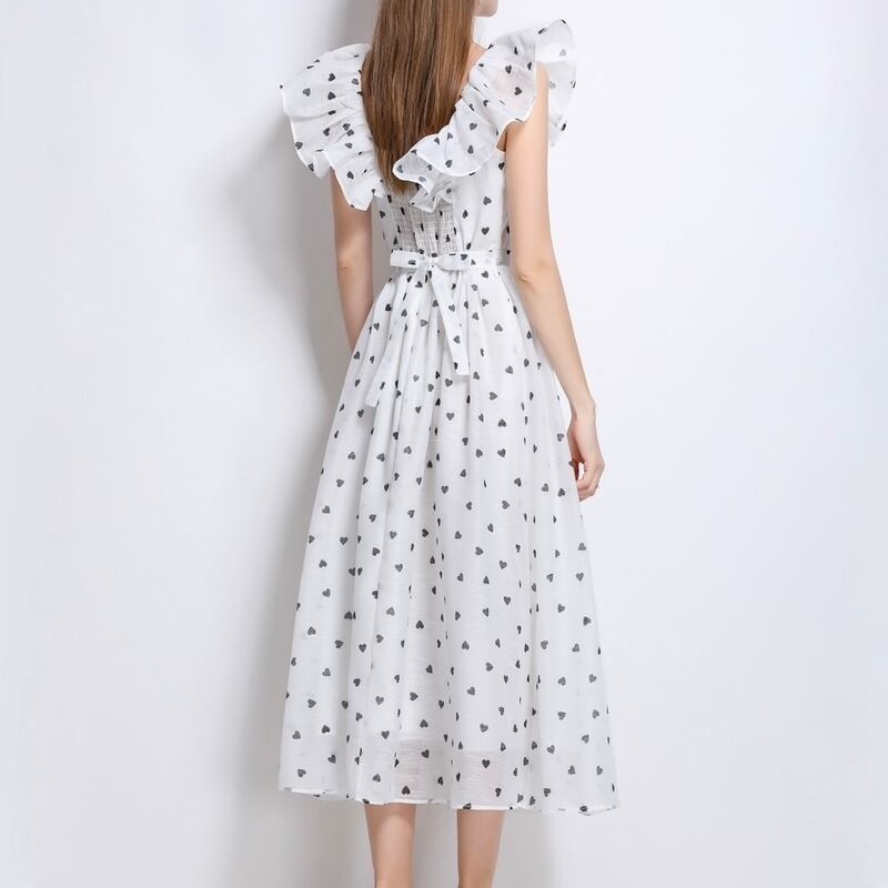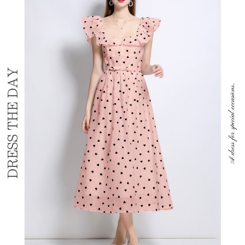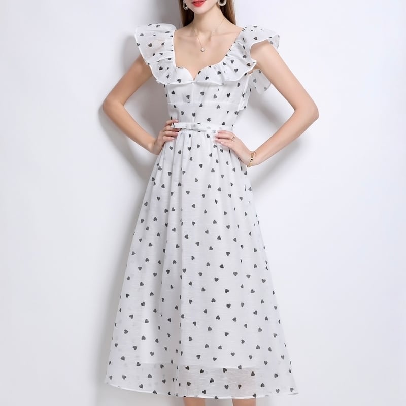 ドットパターンのプチハート柄が目を引くミモレ丈ドレスです。肩におおぶりなフリルをあしらったVネックと上品なフレア感が魅力的で、自然なAラインが体型を整えるスカートが大人かわいい印象を与えます。普段使いから特別な日のコーディネートまで幅広く活躍しますので、どんな場面でもあなたを引き立ててくれること間違いなしです!