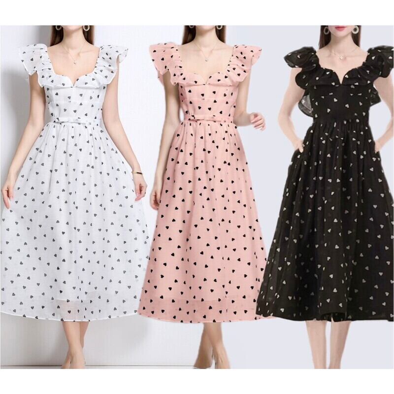 ハート柄ドットフリルVネックドレス3色展開 D0071