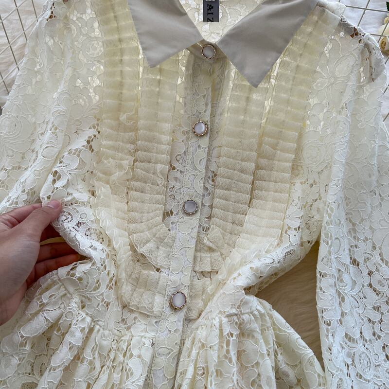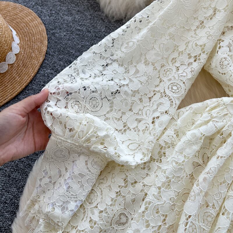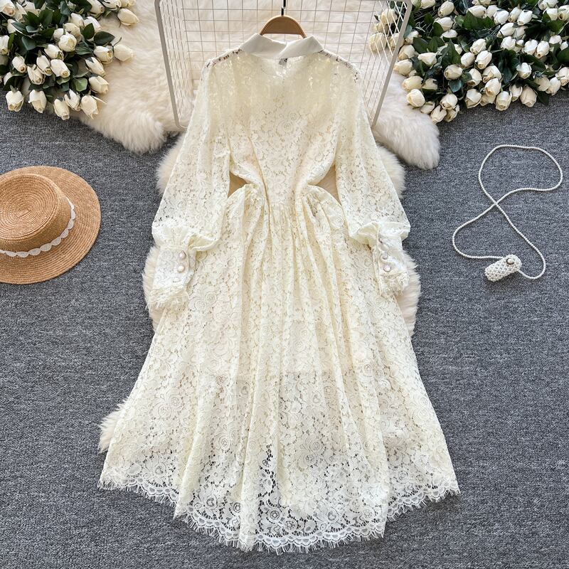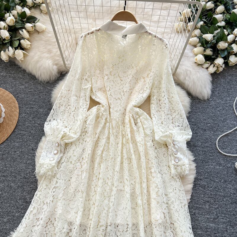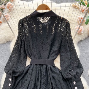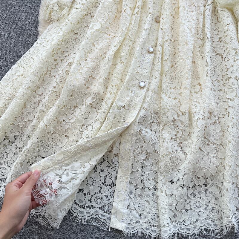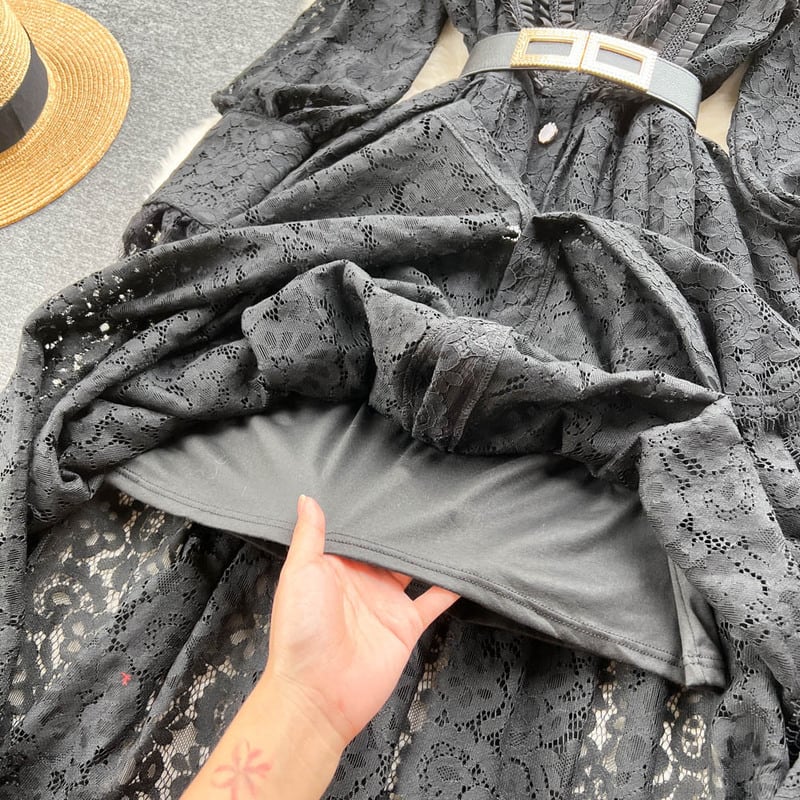 シックなモノトーンの総レースにウエストのベルトが映えるシアードレスです。袖まわりのレースの透け感が大人可愛い印象を演出します。普段使いから特別な日のコーディネートまで幅広く活躍する一着です。カジュアルなシャツワンピース仕立てのAラインスカートで、膝が隠れるミディアム丈は体型を自然にカバーしてくれます。便利なペチワンピース付きです。