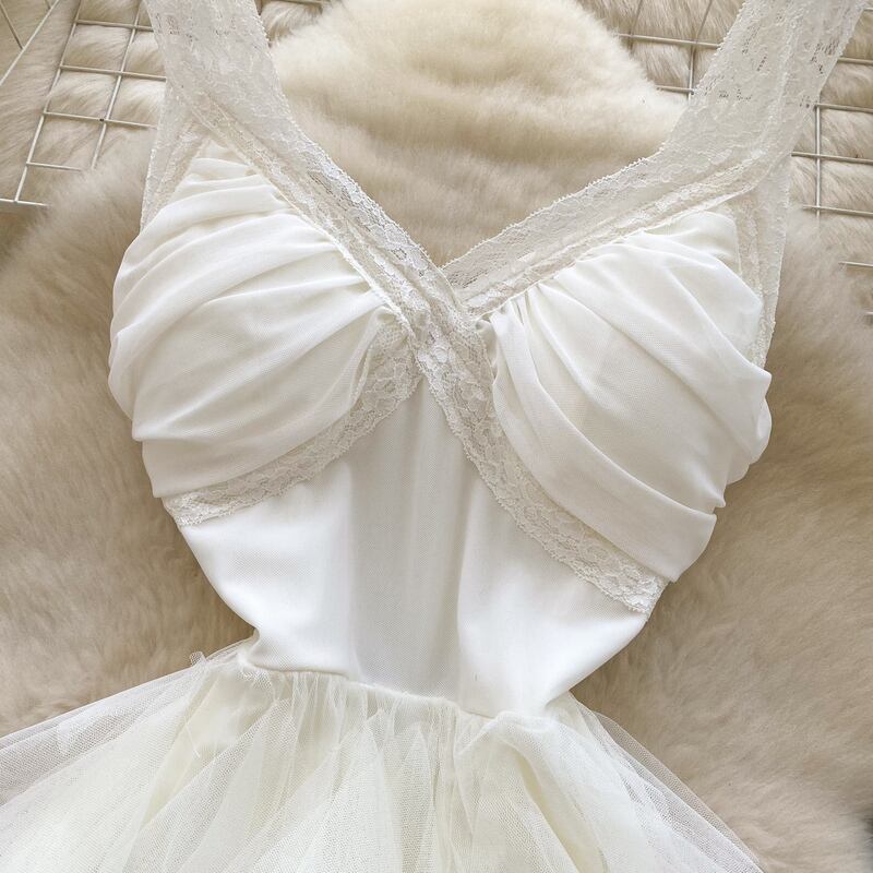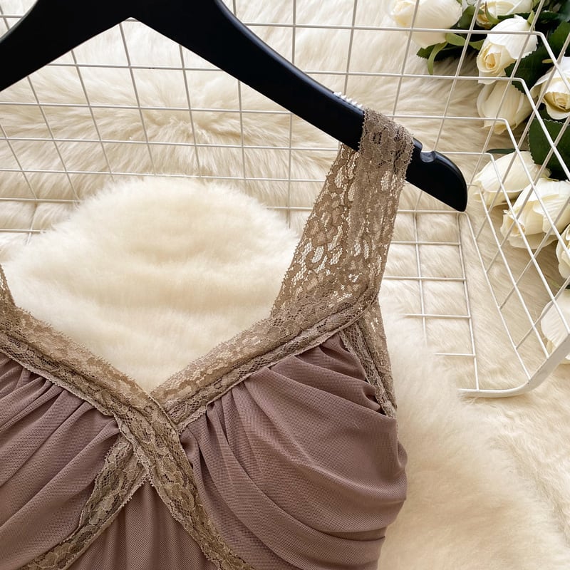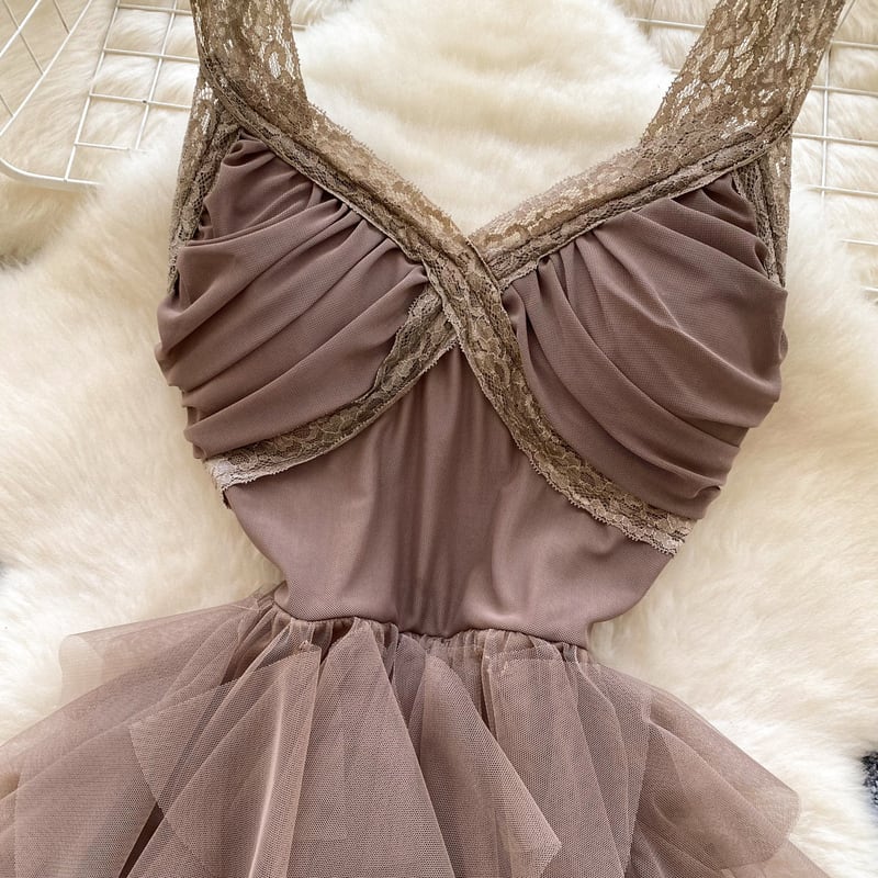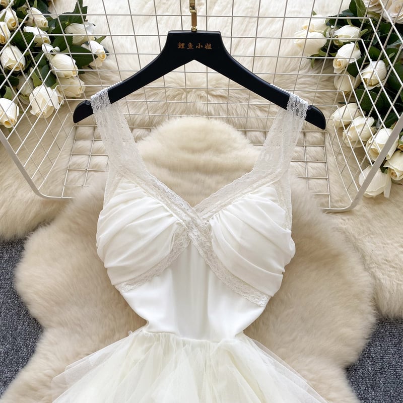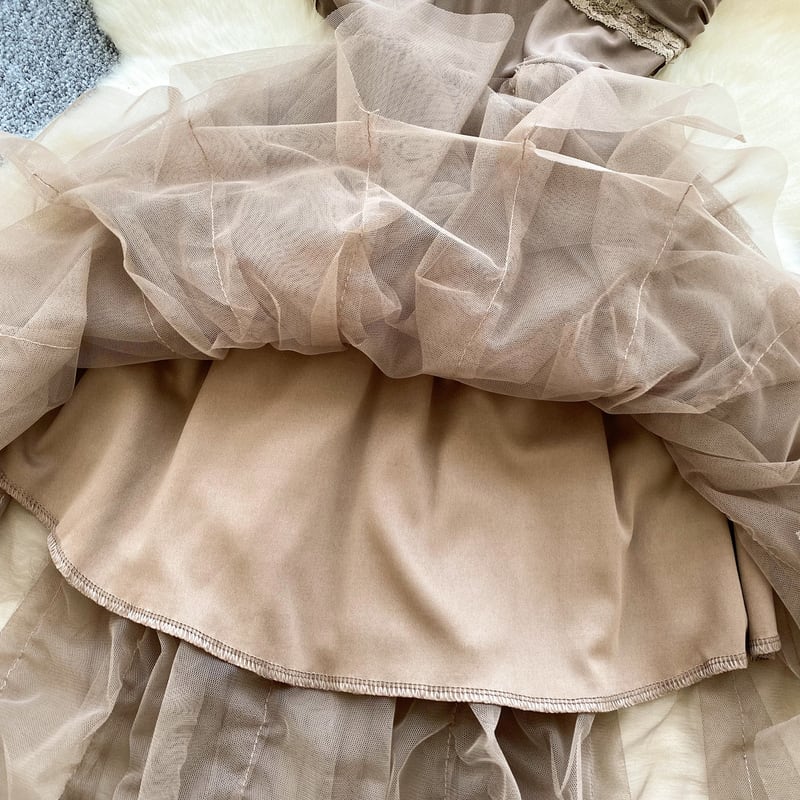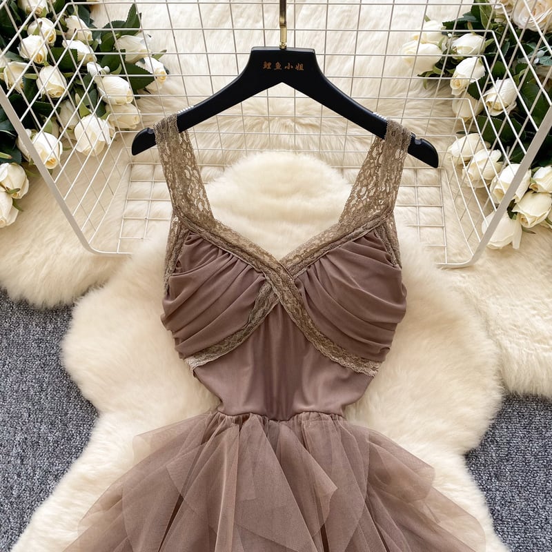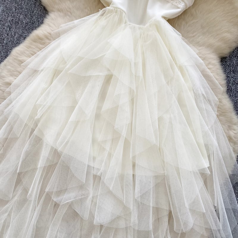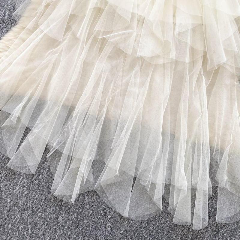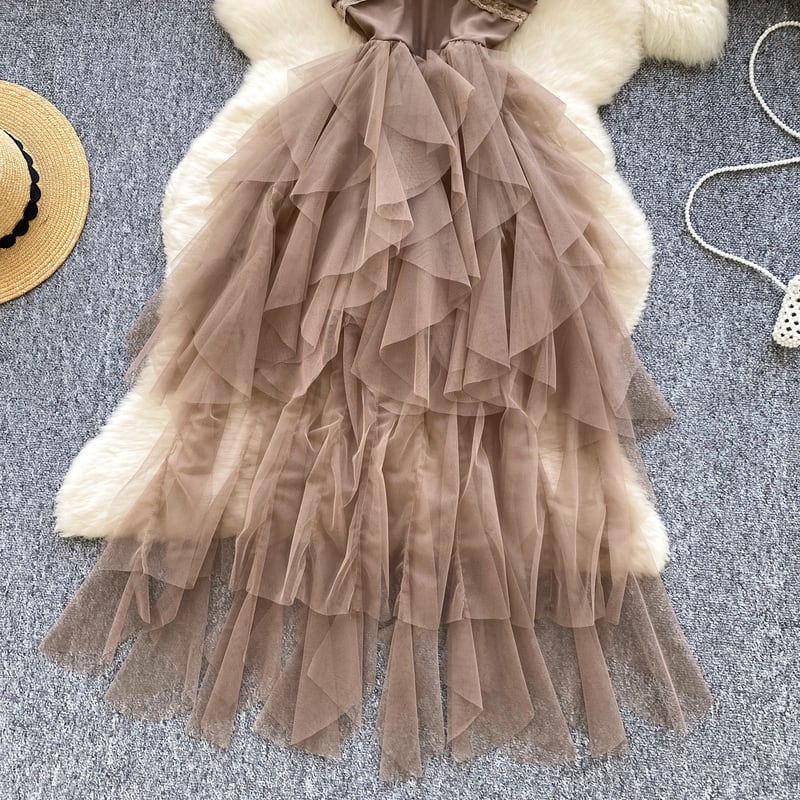 メッシュフリルのボリューム感がエアリーで上品な、ノースリーブドレスです。透け感がありながらもフリルやレースのガーリーなアクセントが絶妙にミックスされ、魅力的な一着に仕上がっています。普段使いから特別な日のコーディネートまで幅広く活躍しますので、どんな場面でもあなたを引き立ててくれること間違いなしです!