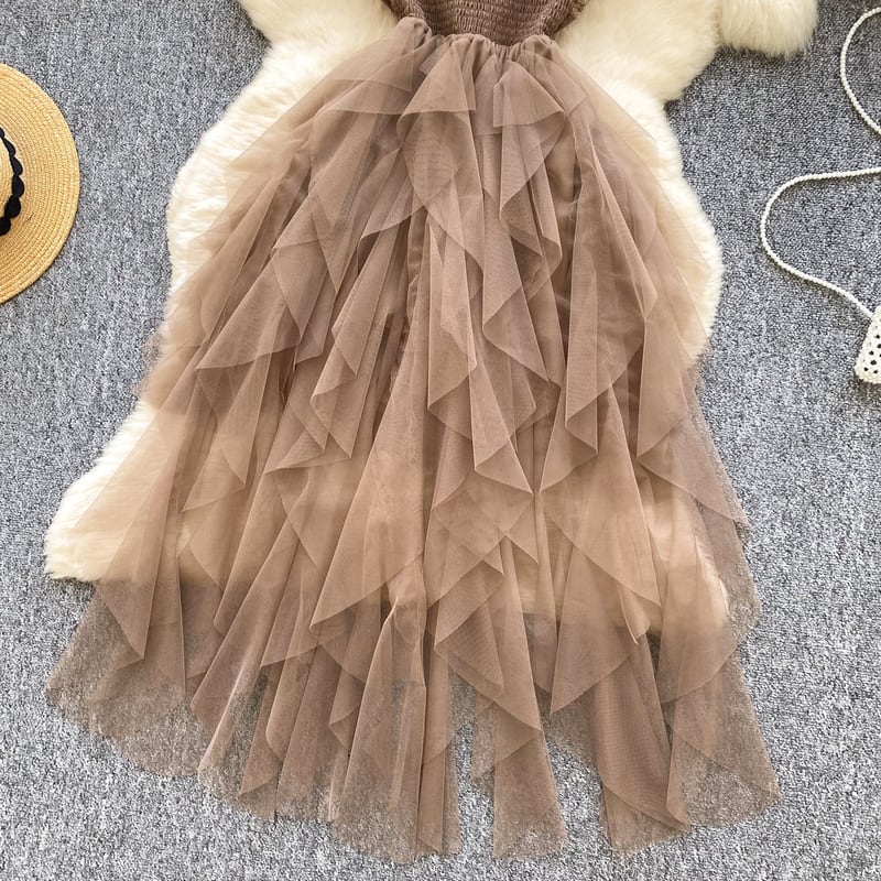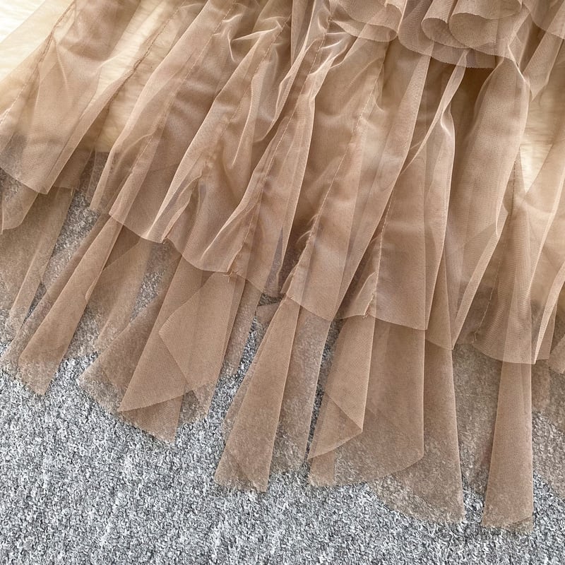 メッシュフリルスカートノースリーブドレス2色展開 D0095