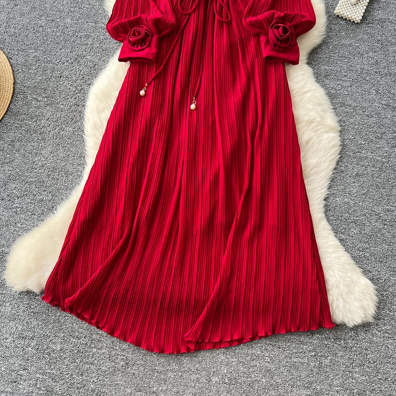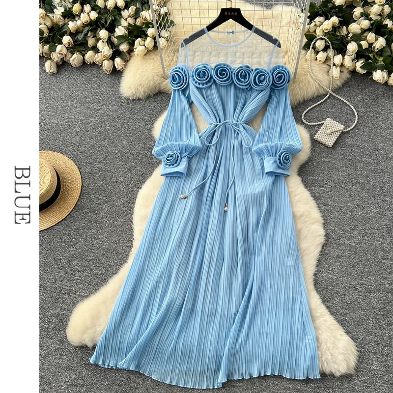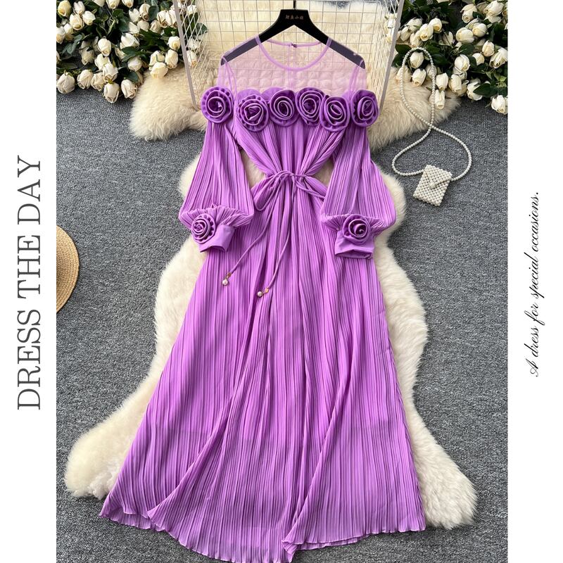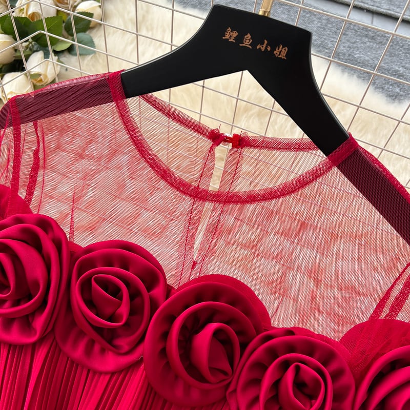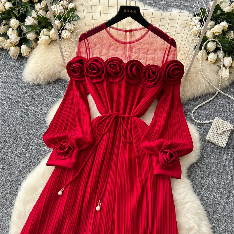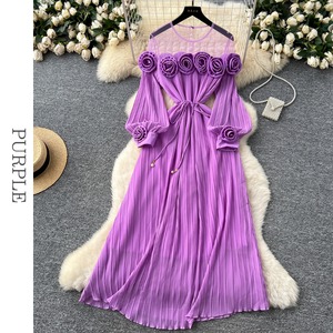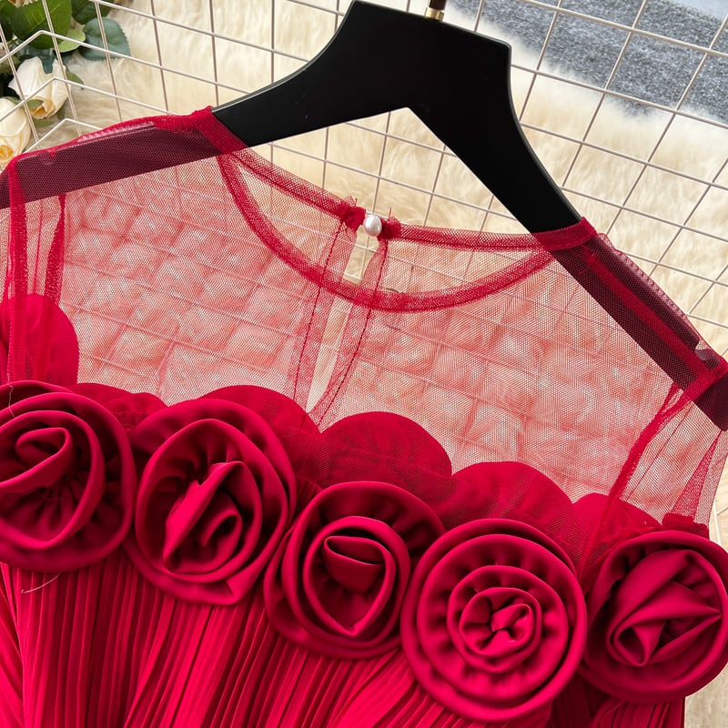 フラワーメッシュ切り替えプリーツドレス D0096