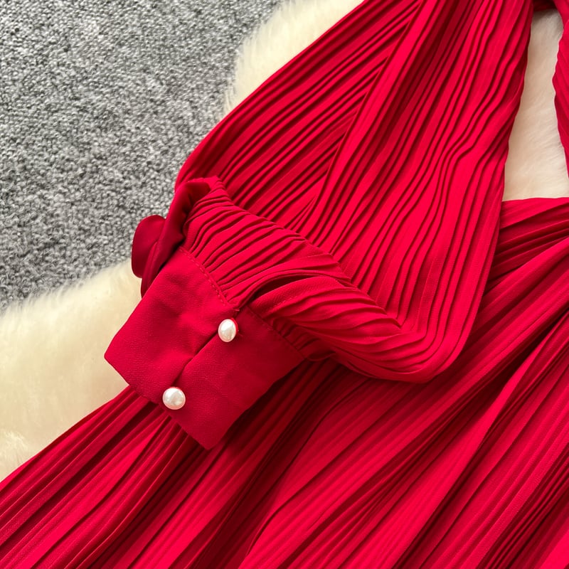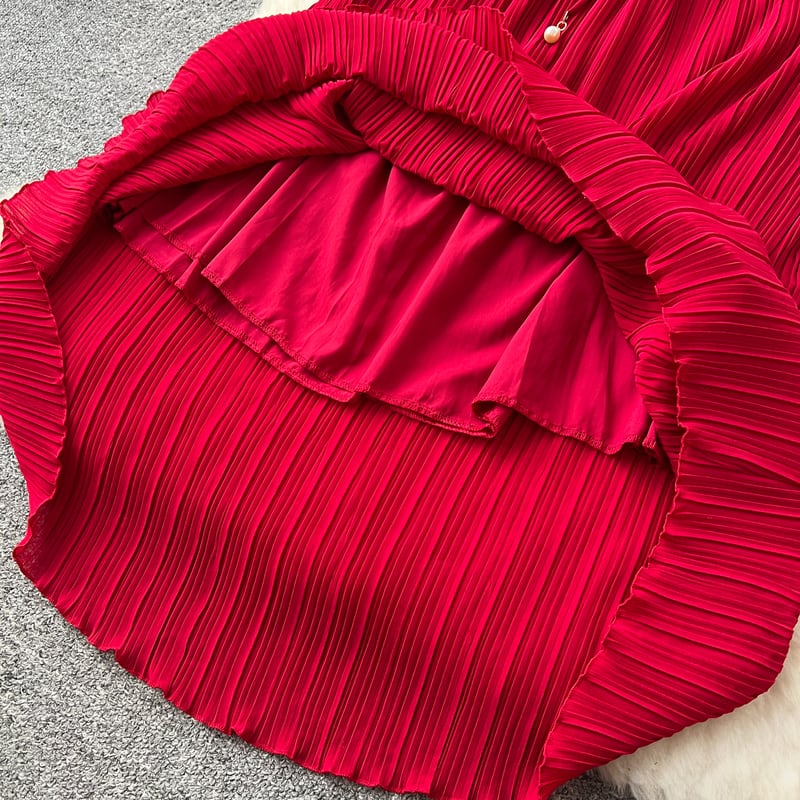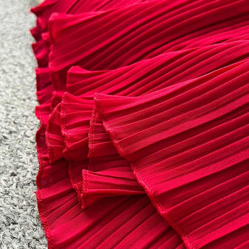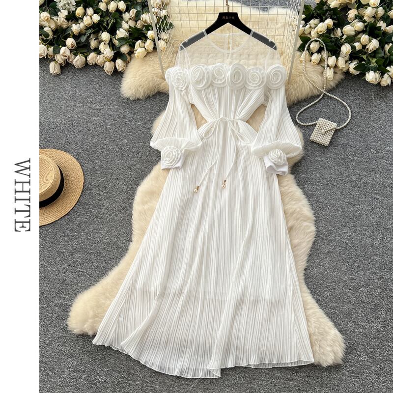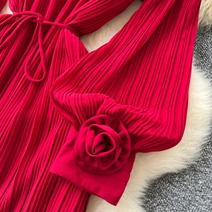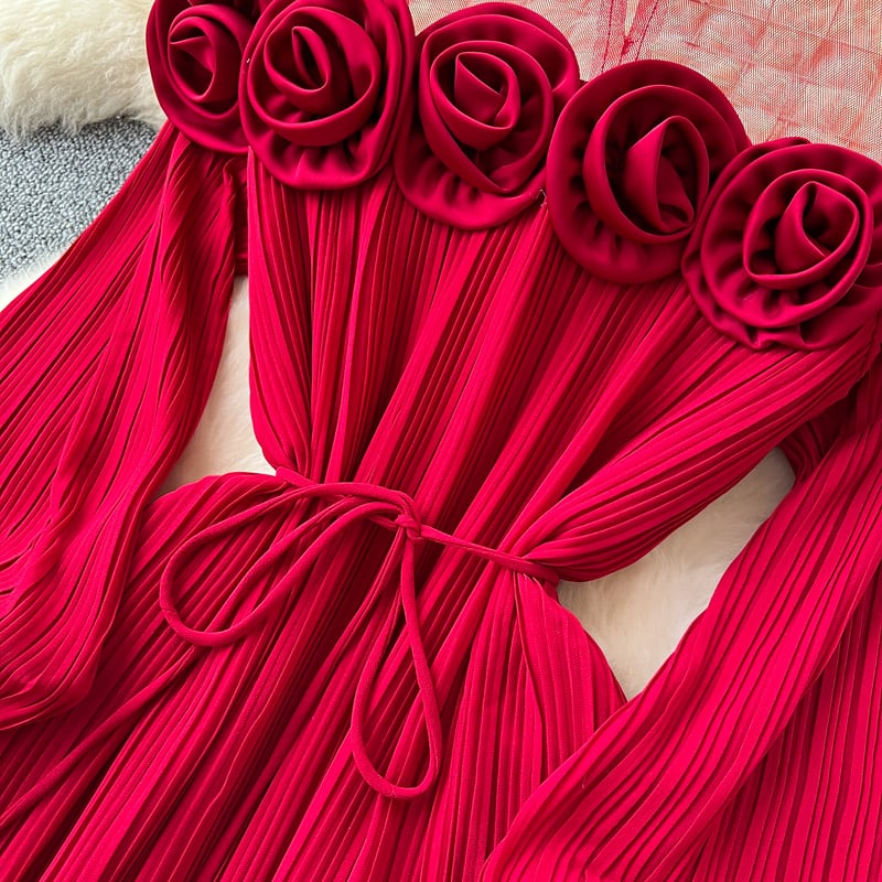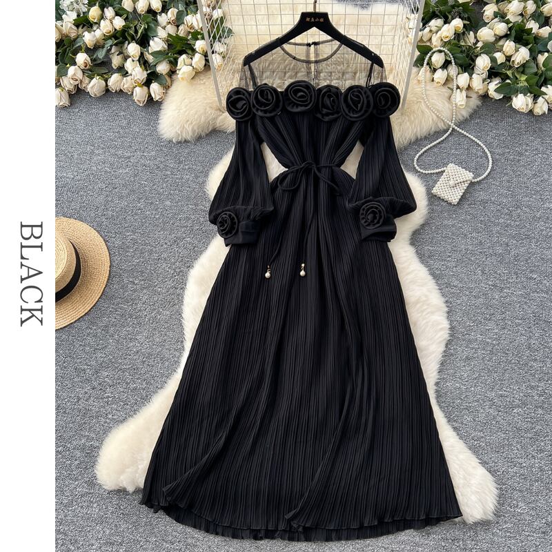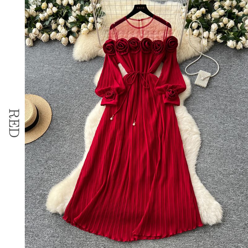 フラワーメッシュ切り替えプリーツドレス D0096
