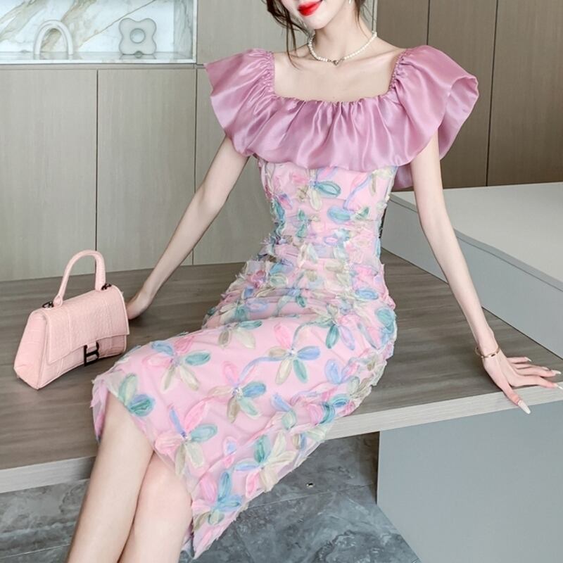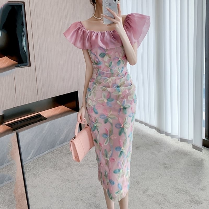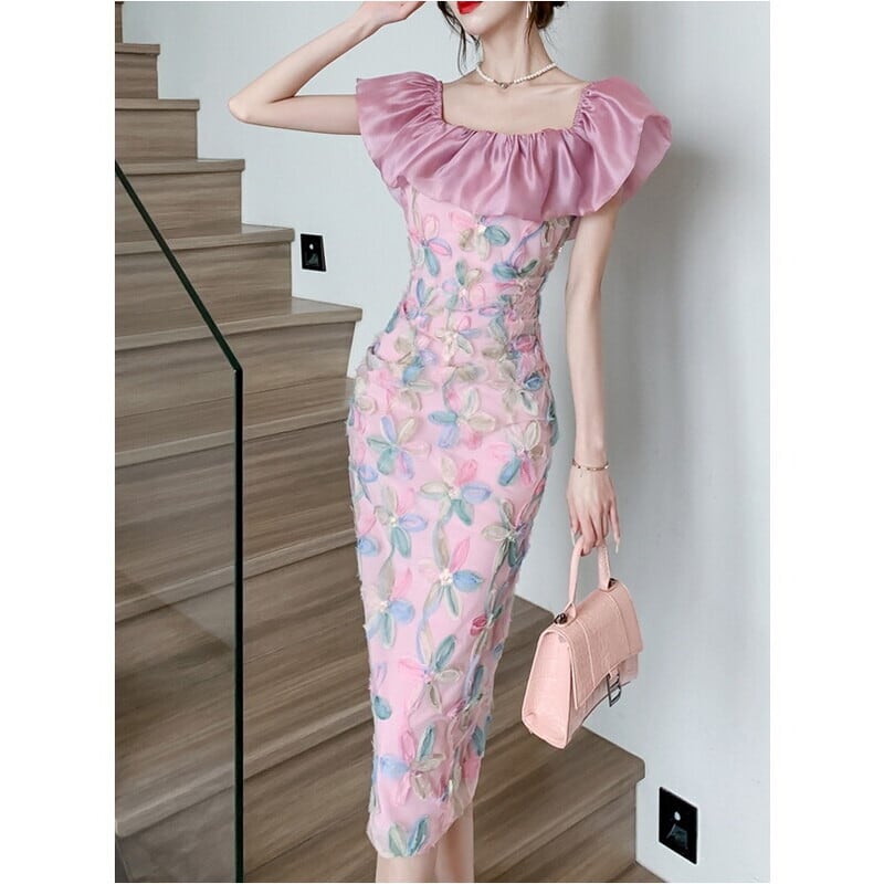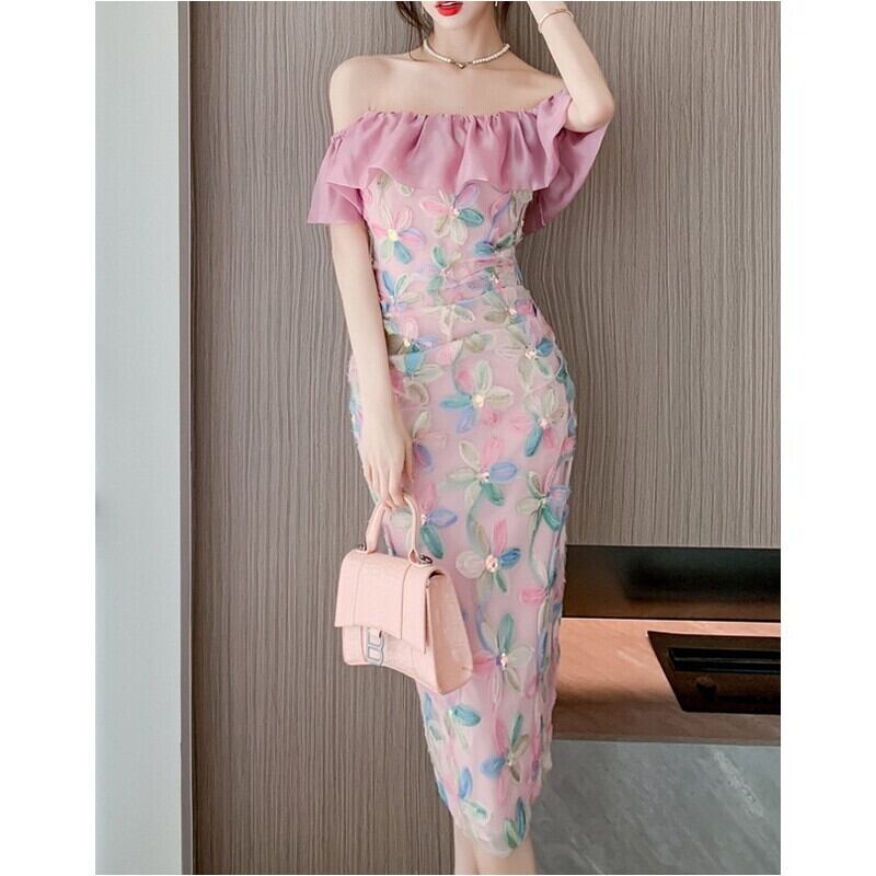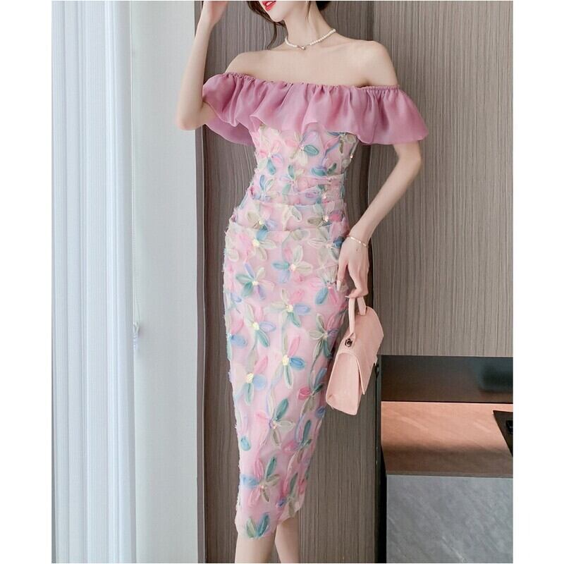 カラフルなスパンコール付きのフラワー刺繍が映えるデザインが洗練されたミモレ丈ドレスです。ふんわりと上品なボリューム感のあるフリルがデコルテを大人かわいい印象に演出します。スクエアネックとオフショルダーの2WAYでアレンジを楽しめる襟デザインが魅力的。普段使いから特別な日のコーディネートまで幅広く活躍しますので、どんな場面でもあなたを引き立ててくれること間違いなしです!
