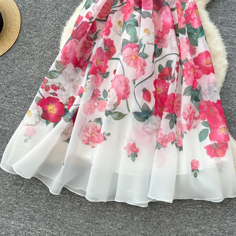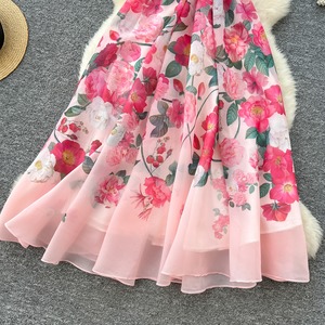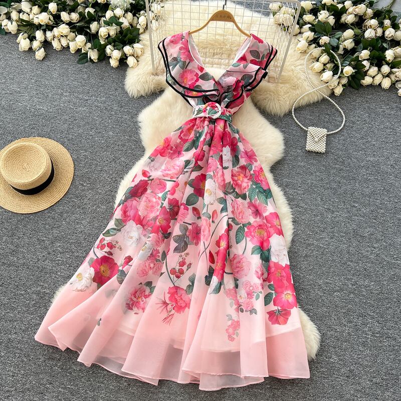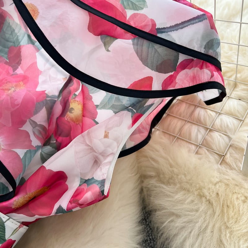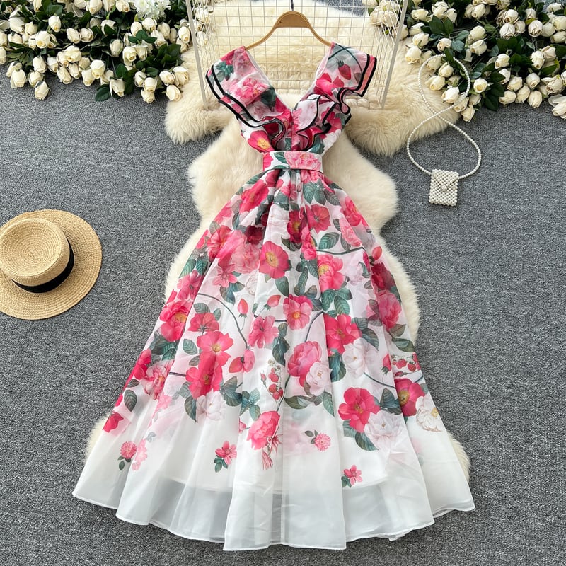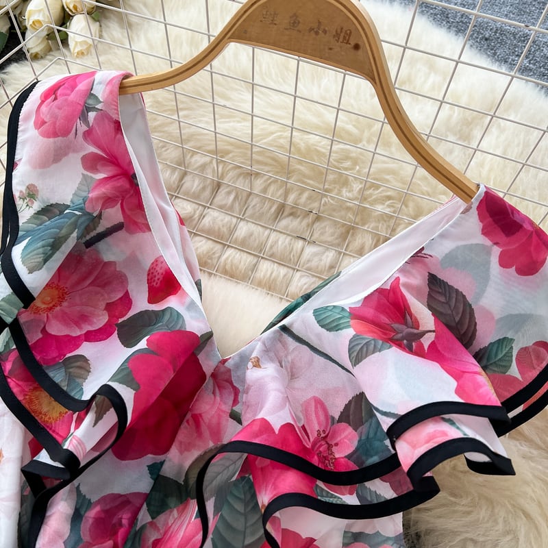 Vネックパイピングフリルフラワードレス2色展開 D0099