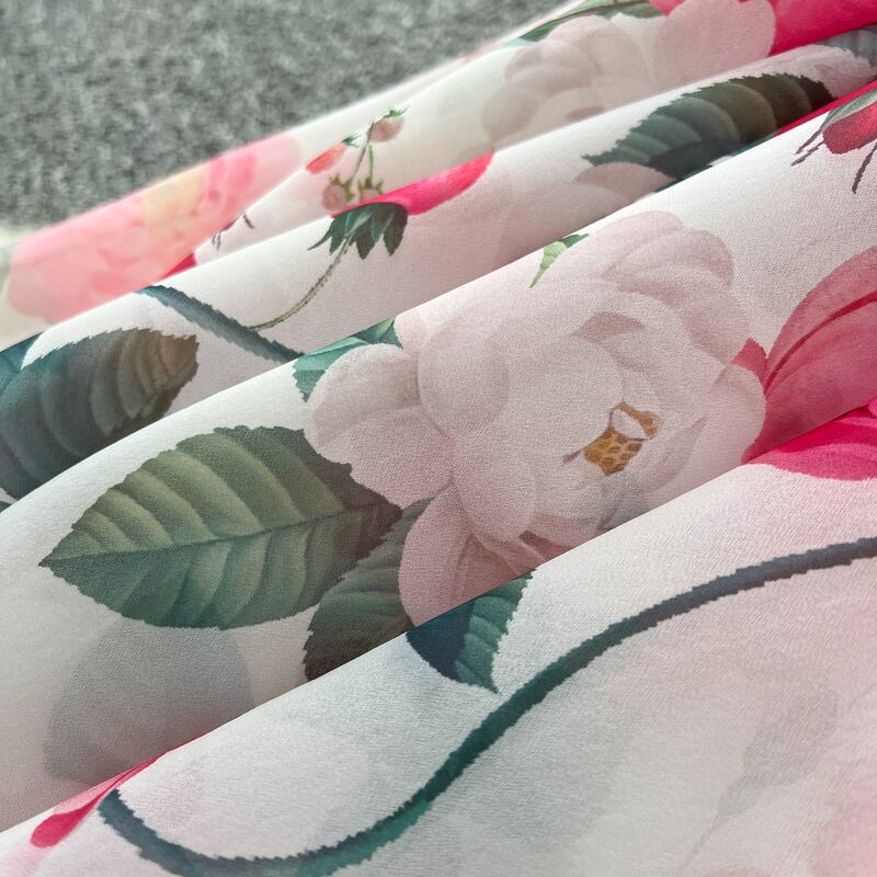軽やかなチュールに華やかなフラワープリントが映えるシアードレスです。袖や足元のチュールの透け感が大人かわいい印象を演出します。普段使いから特別な日のコーディネートまで幅広く活躍する一着です。フリルをあしらった袖まわりは上品な仕立てで、Aラインスカートが体型を自然にカバーしてくれます。どんなシーンでも目を引く存在感を発揮しますので、ぜひお試しください!
