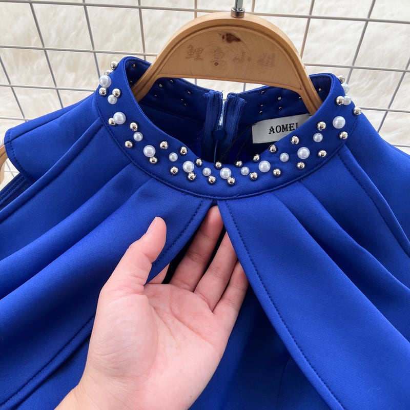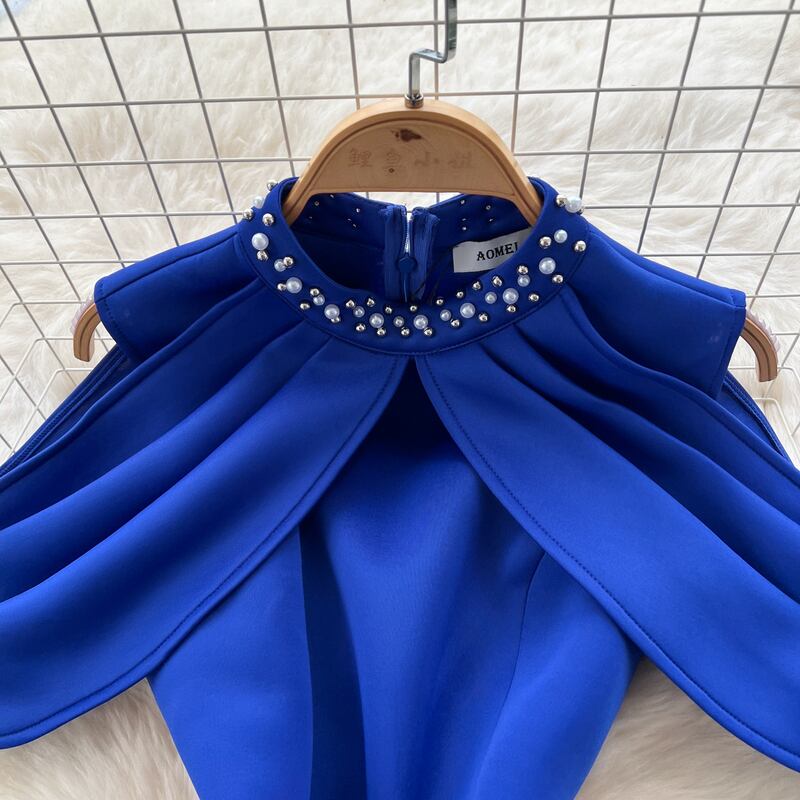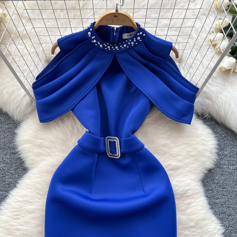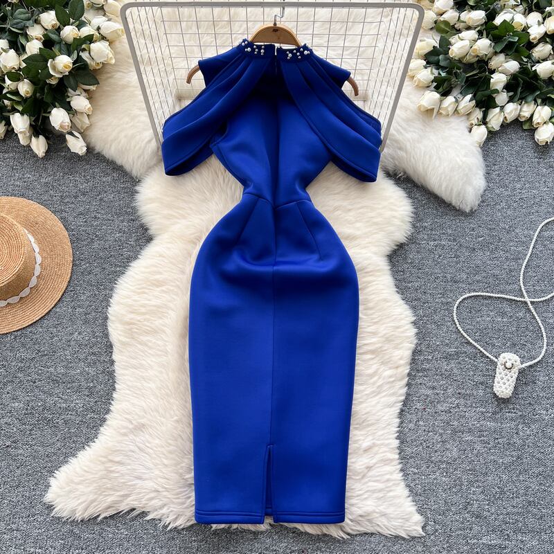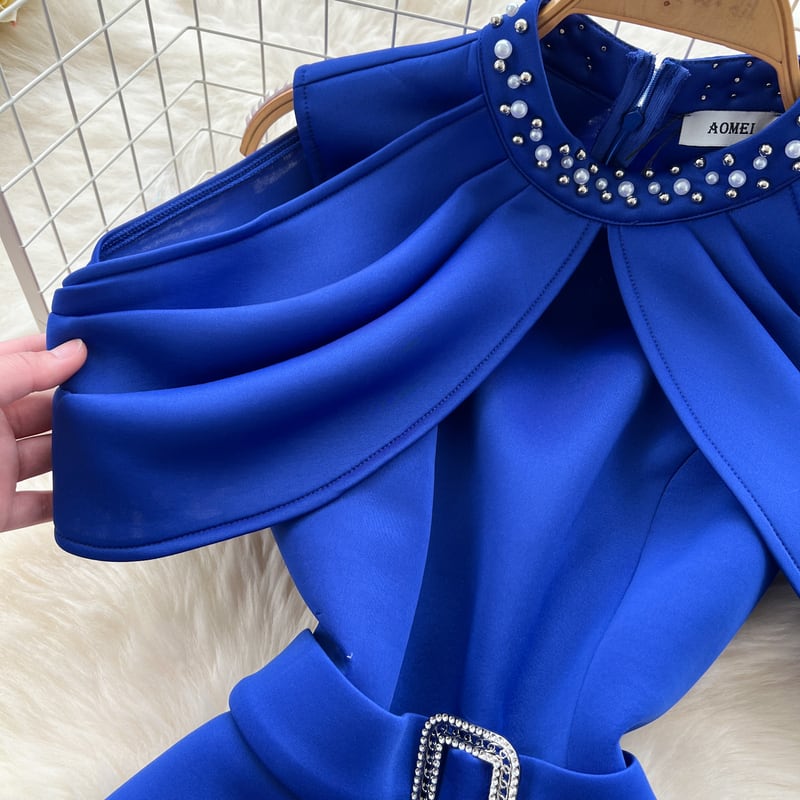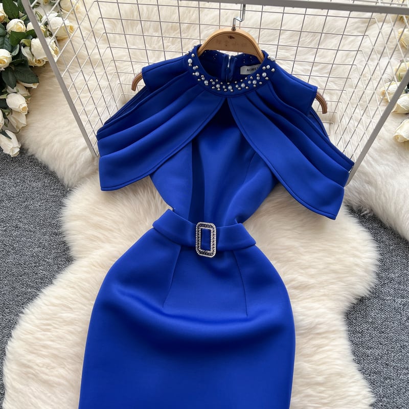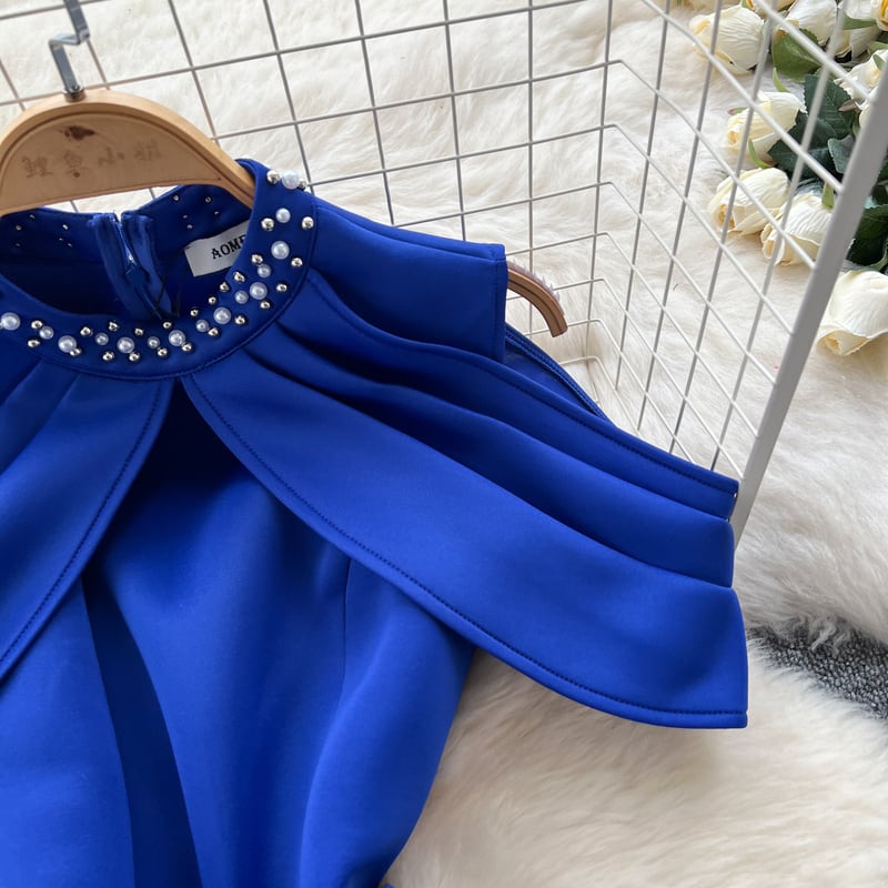 オープンショルダーパール付き襟ドレス D0105