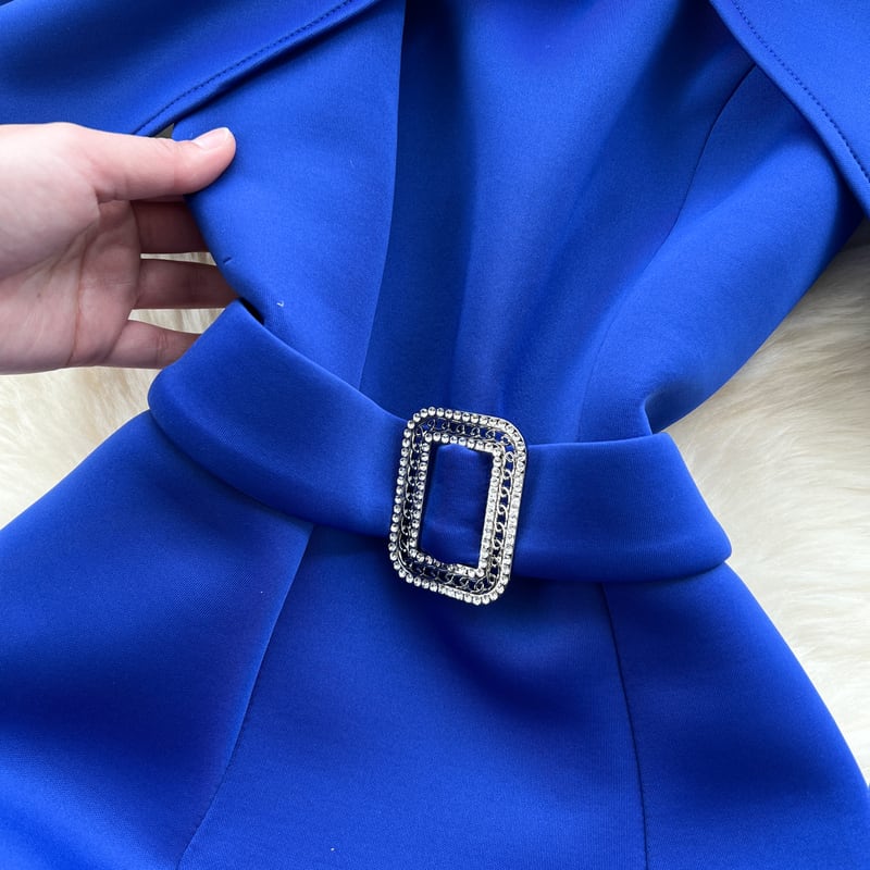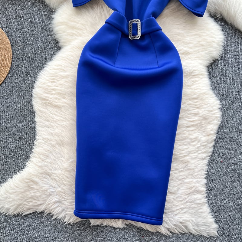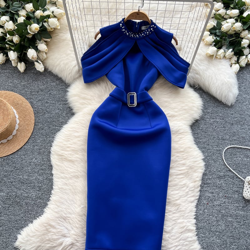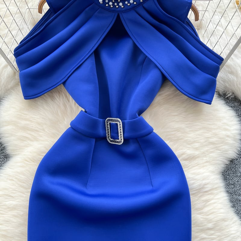 太めのベルトが映えるシンプルなデザインが洗練された、ノースリーブドレスです。オープンショルダーとプリーツ入りの装飾がこなれた印象を与えます。タイトなシルエットが綺麗なペンシルスカートは洗練された大人っぽさを演出します。どんな場面でもあなたを引き立ててくれること間違いなしです!