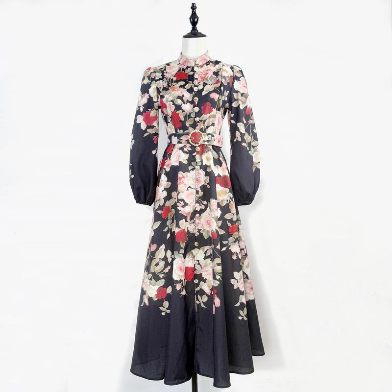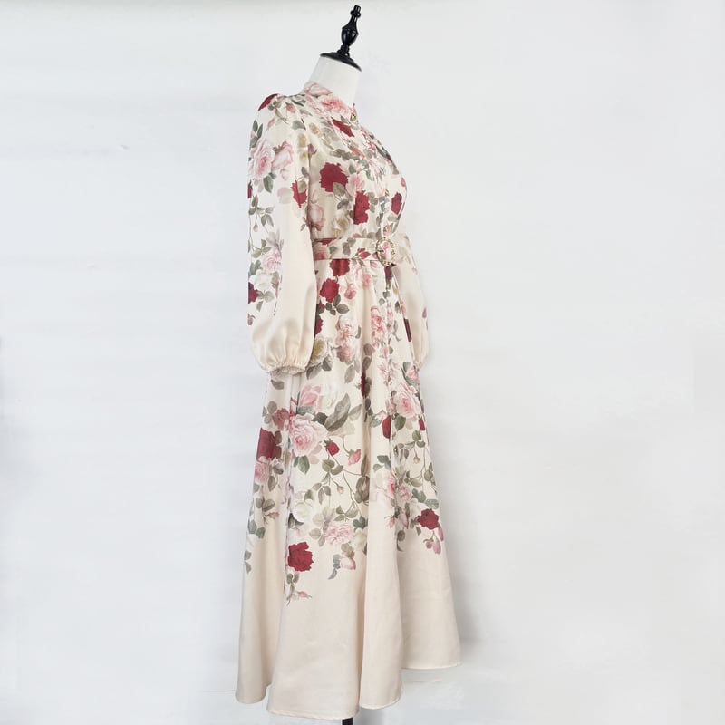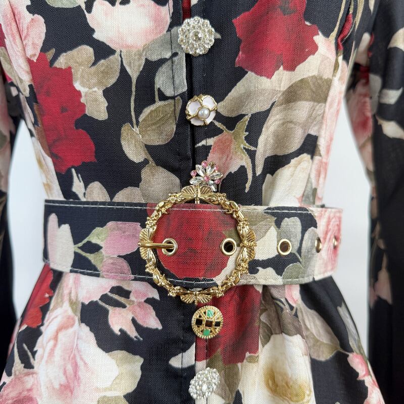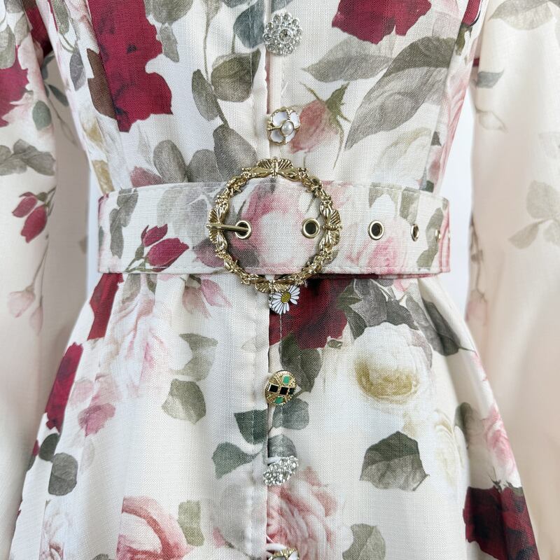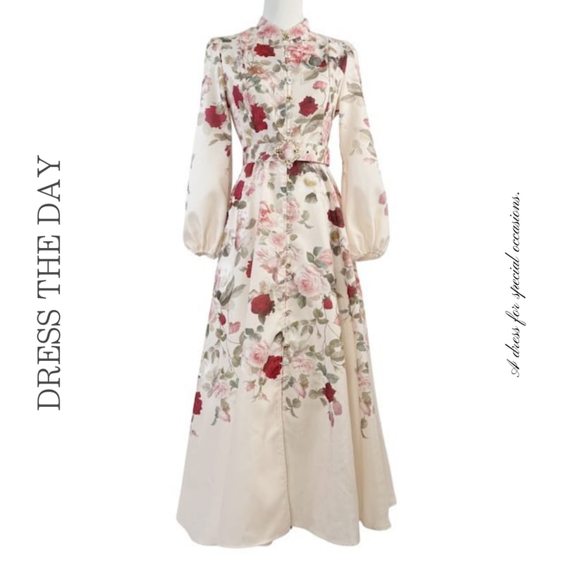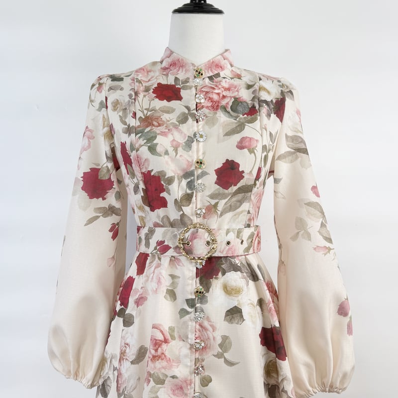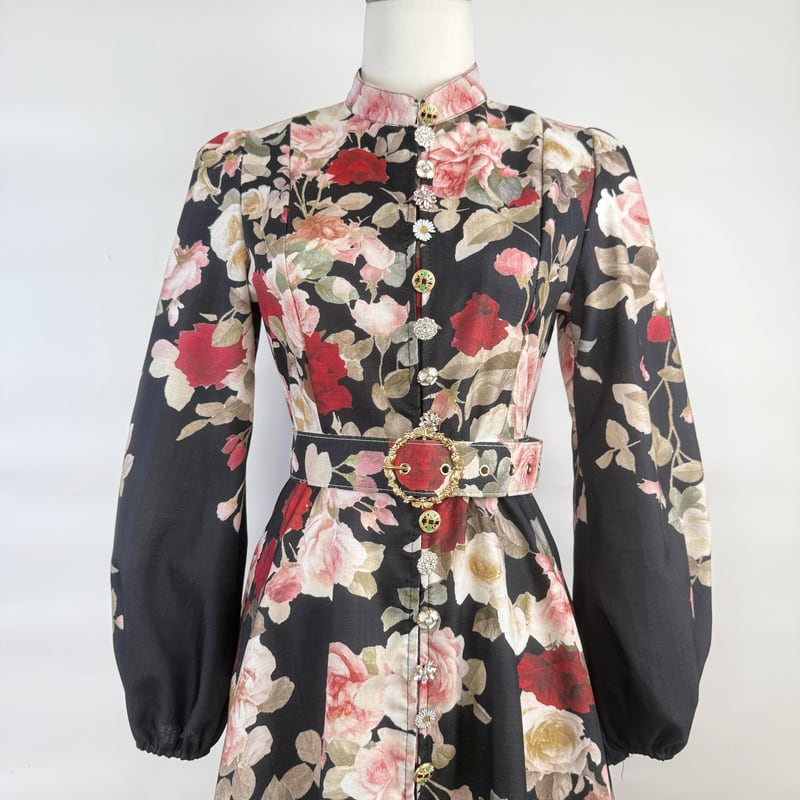 鮮やかなフラワープリントが魅力的なシャツワンピースタイプのドレスです。スタンドカラーがこなれた大人っぽい印象で、ウエストまわりのベルト装飾が華やかさを演出します。普段使いから特別な日のコーディネートまで幅広く活躍する一着です。ビジューをあしらったボタンは個性的で、フレアスカートは体型を自然にカバーしてくれます。どんなシーンでも目を引く存在感を発揮しますので、ぜひお試しください!