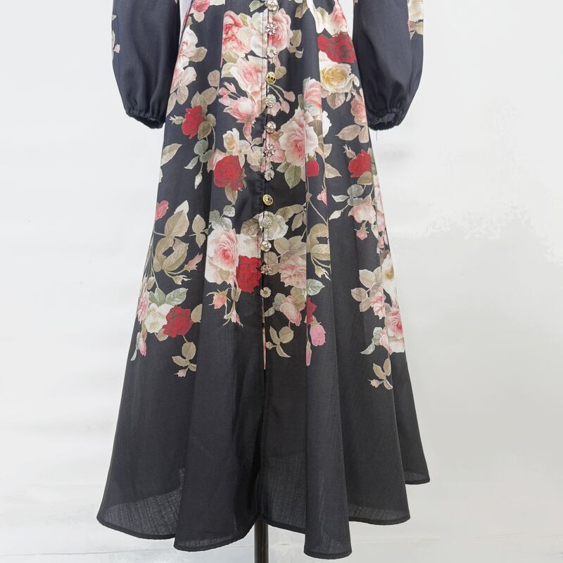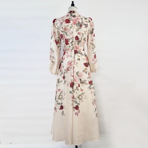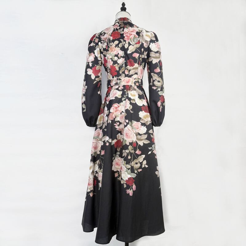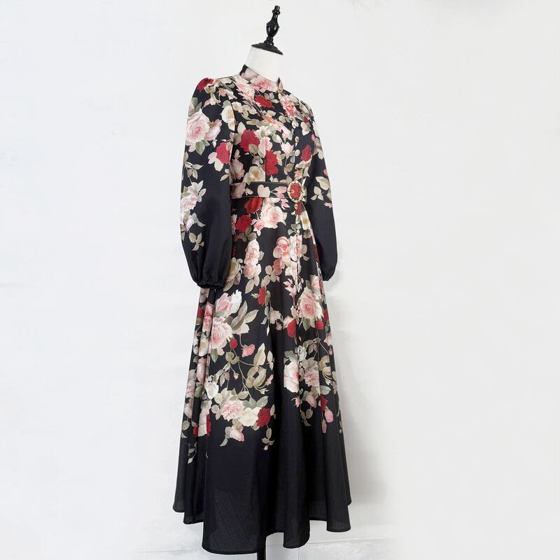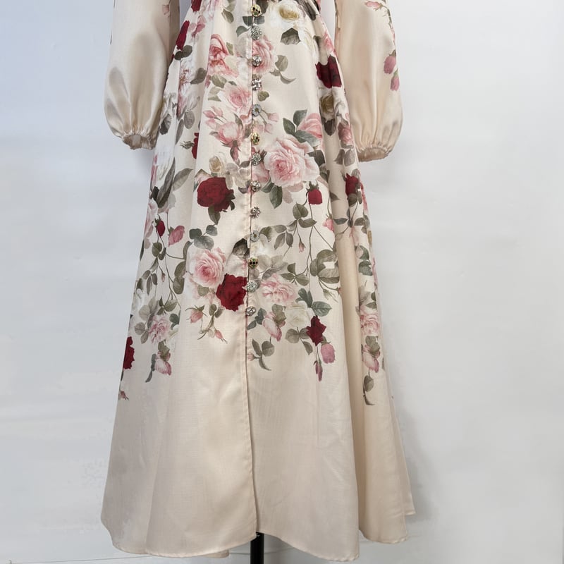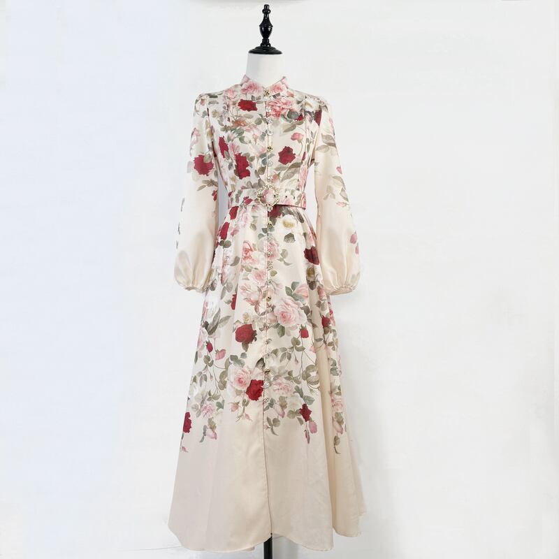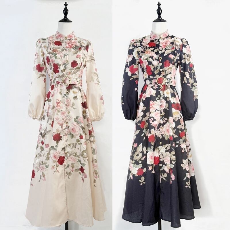 鮮やかなフラワープリントが魅力的なシャツワンピースタイプのドレスです。スタンドカラーがこなれた大人っぽい印象で、ウエストまわりのベルト装飾が華やかさを演出します。普段使いから特別な日のコーディネートまで幅広く活躍する一着です。ビジューをあしらったボタンは個性的で、フレアスカートは体型を自然にカバーしてくれます。どんなシーンでも目を引く存在感を発揮しますので、ぜひお試しください!