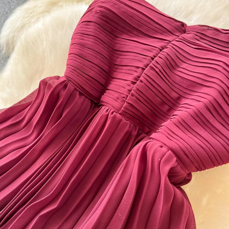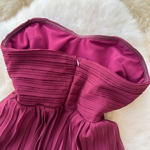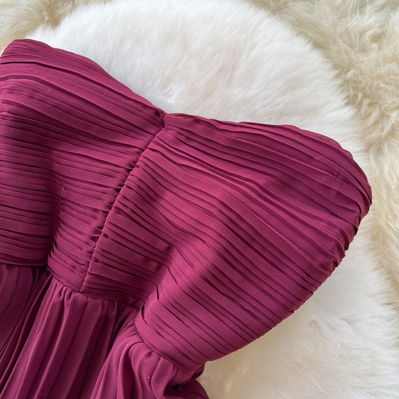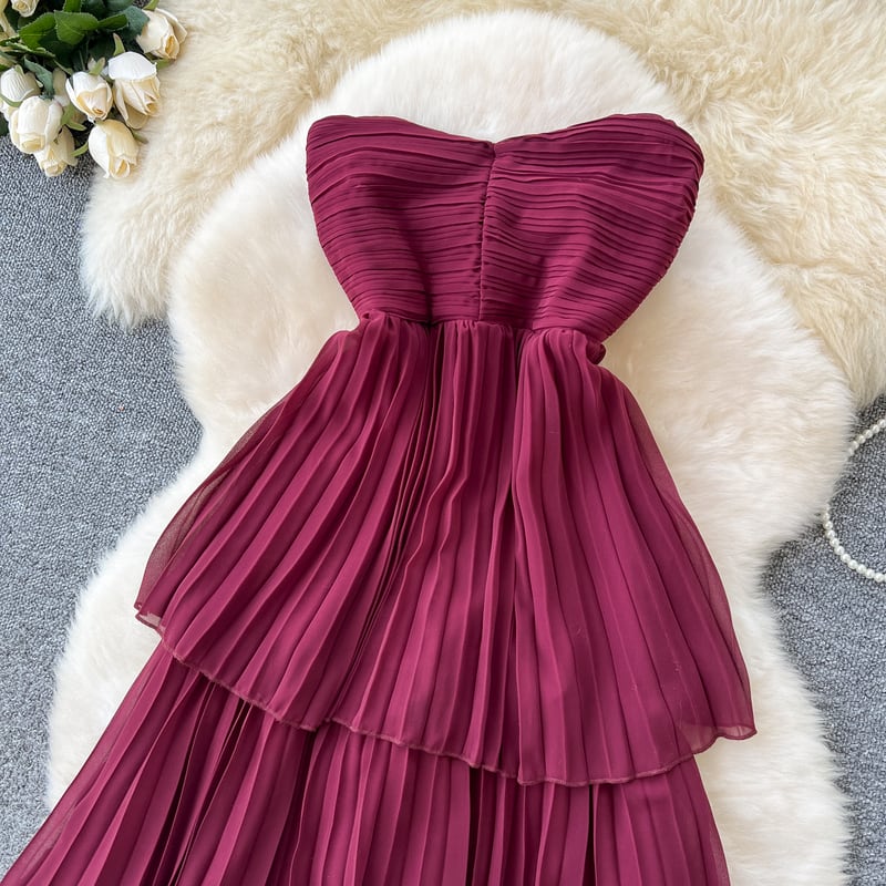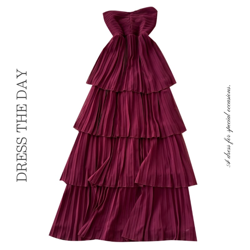 ノースリーブデザインがデコルテまわりをシックで大人かわいい印象に演出するドレスです。繊細なプリーツのティアードスカートが、特別な日のコーディネートに華やかさを添えます。大胆なストラップレスデザインがセクシーな印象を演出しており、女性らしいシルエットを引き立てます。スカートが動くたびに美しいドレープを描くため、さまざまなシーンであなたの個性を際立てる一着です。