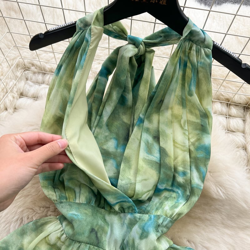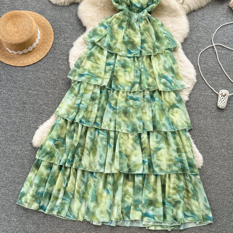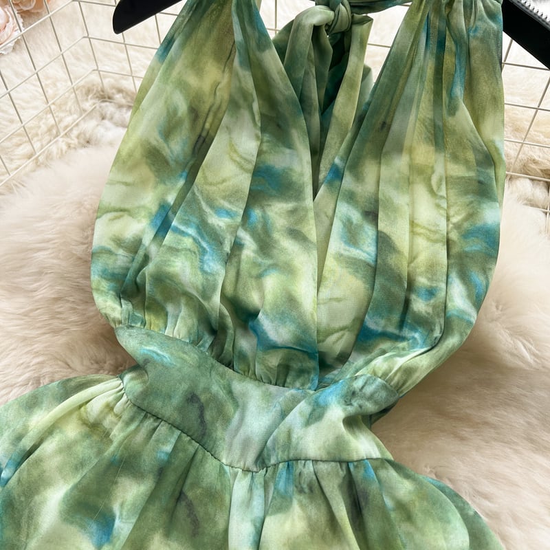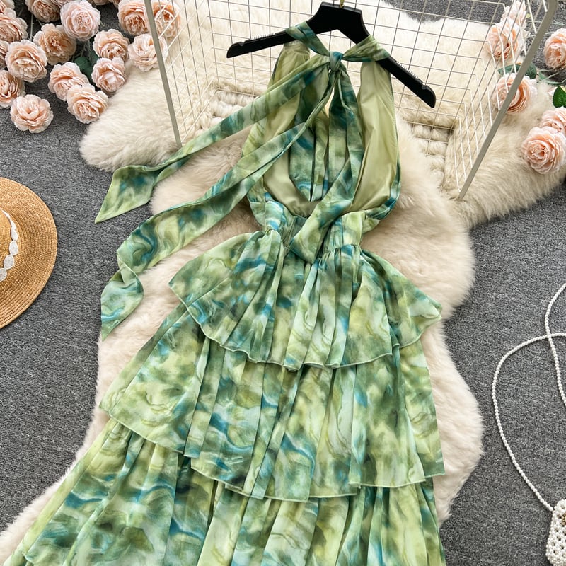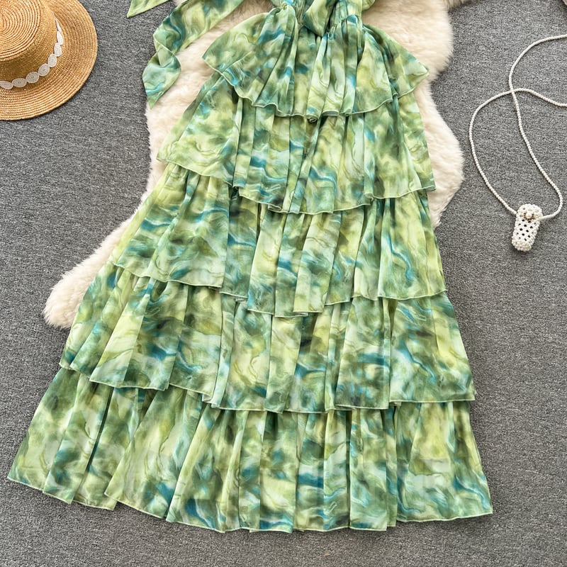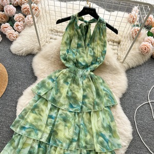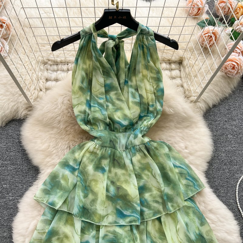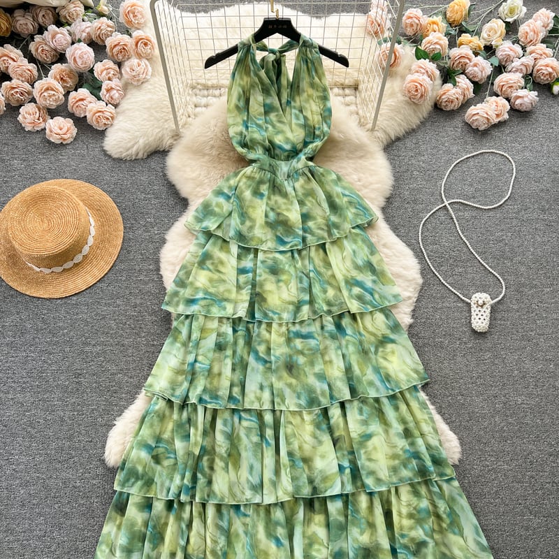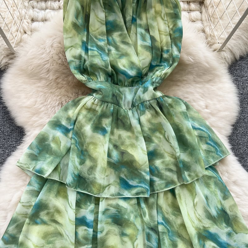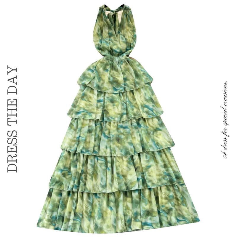 ノースリーブデザインがデコルテまわりをシックで大人かわいい印象に演出するVネックドレスです。ふんわりフリルのティアードスカートが、特別な日のコーディネートに華やかさを添えます。大胆なバックオープンデザインがセクシーな印象を演出しており、女性らしいシルエットを引き立てます。