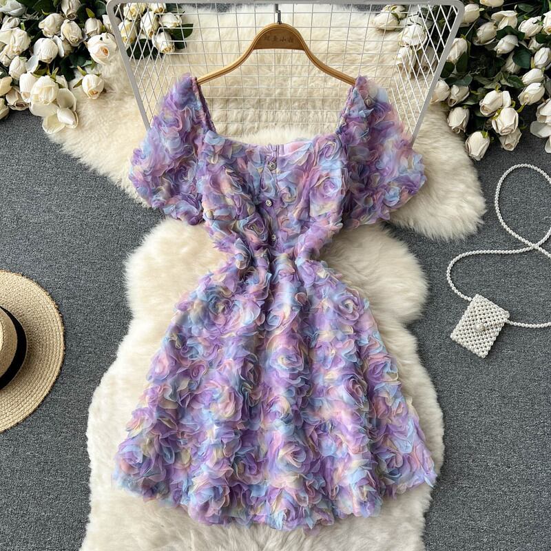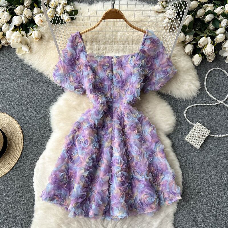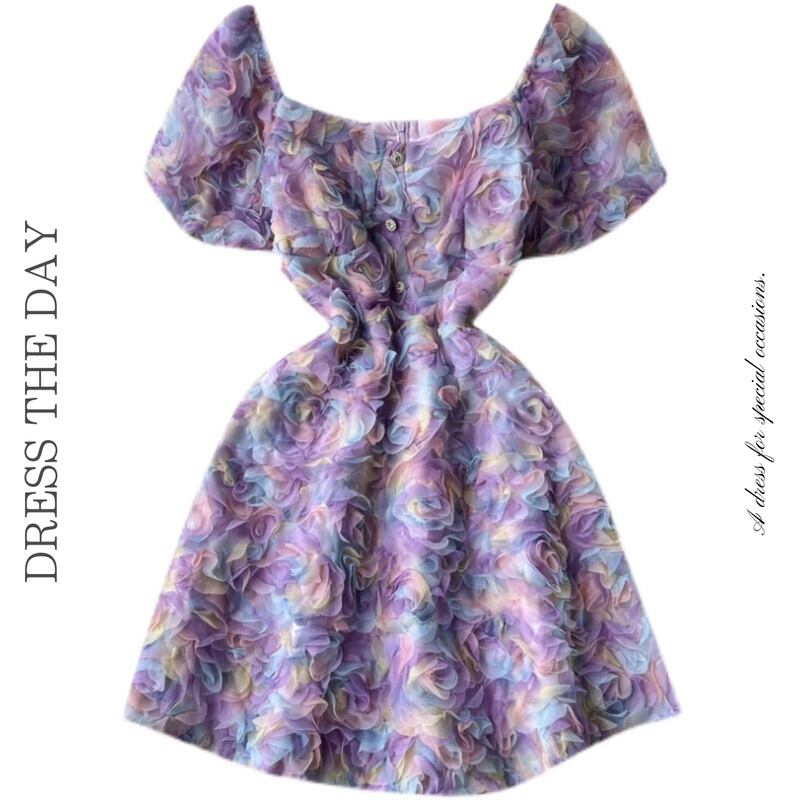 立体的なフラワーモチーフをあしらった仕立てが魅力的なスクエアネックドレスです。上品なフレア感が魅力的で、ハイウエストがメリハリのある大人かわいい印象を与えます。普段使いから特別な日のコーディネートまで幅広く活躍しますので、どんな場面でもあなたを引き立ててくれること間違いなしです!