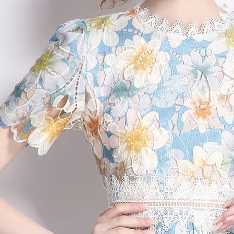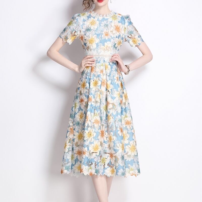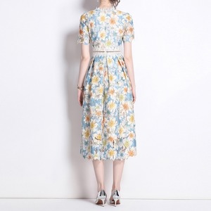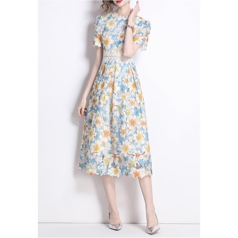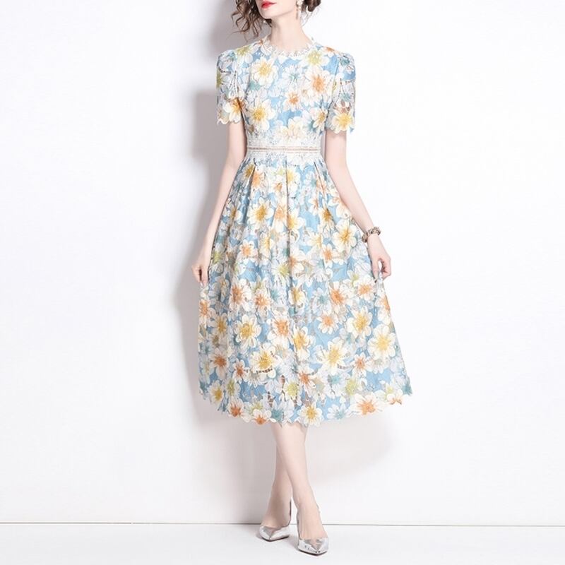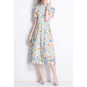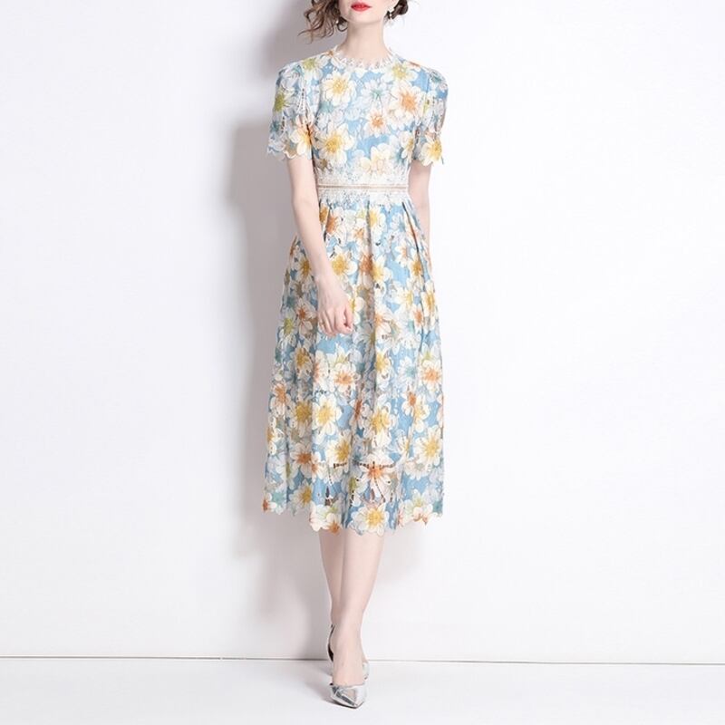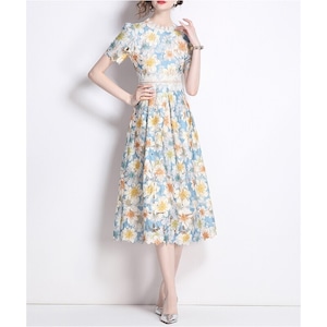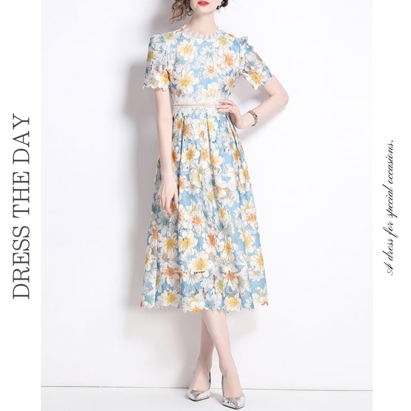 繊細な総レース仕立てで、裾の透け感が魅力的なフラワー柄ドレスです。スカートはタック入りの上品なフレア感が魅力的で、シックな配色が大人かわいい印象を与えます。普段使いから特別な日のコーディネートまで幅広く活躍しますので、どんな場面でもあなたを引き立ててくれること間違いなしです!