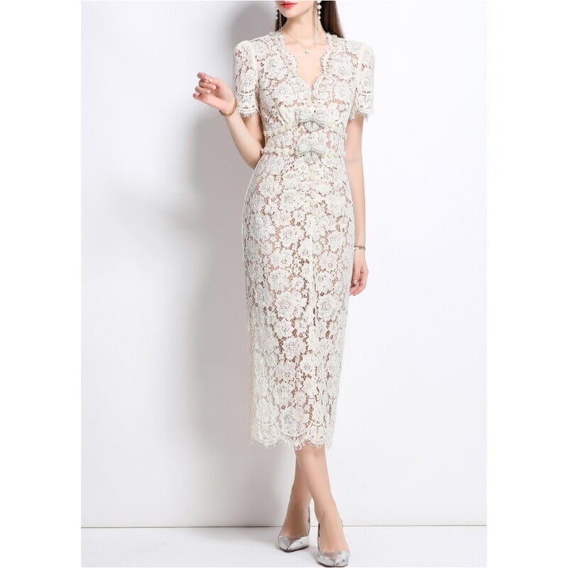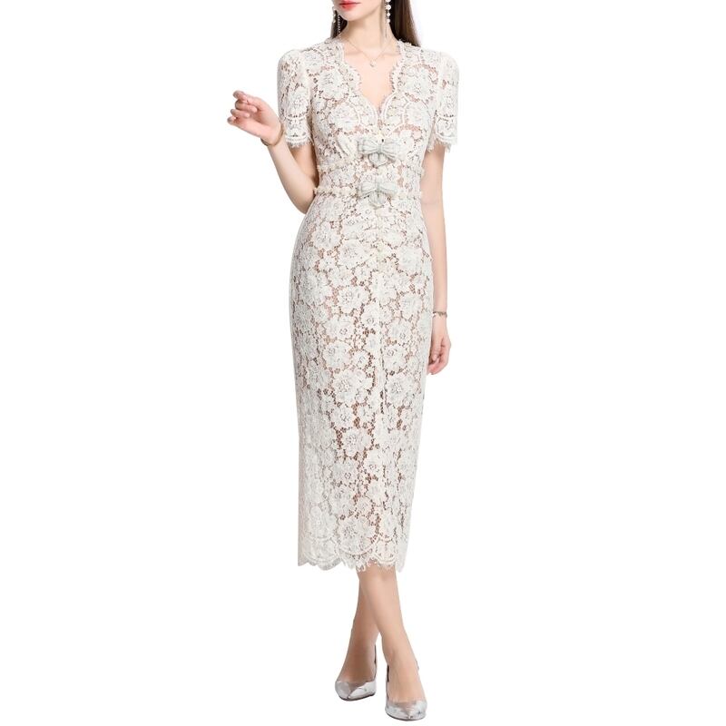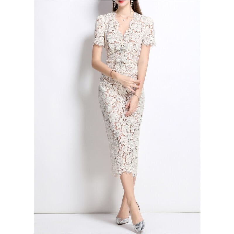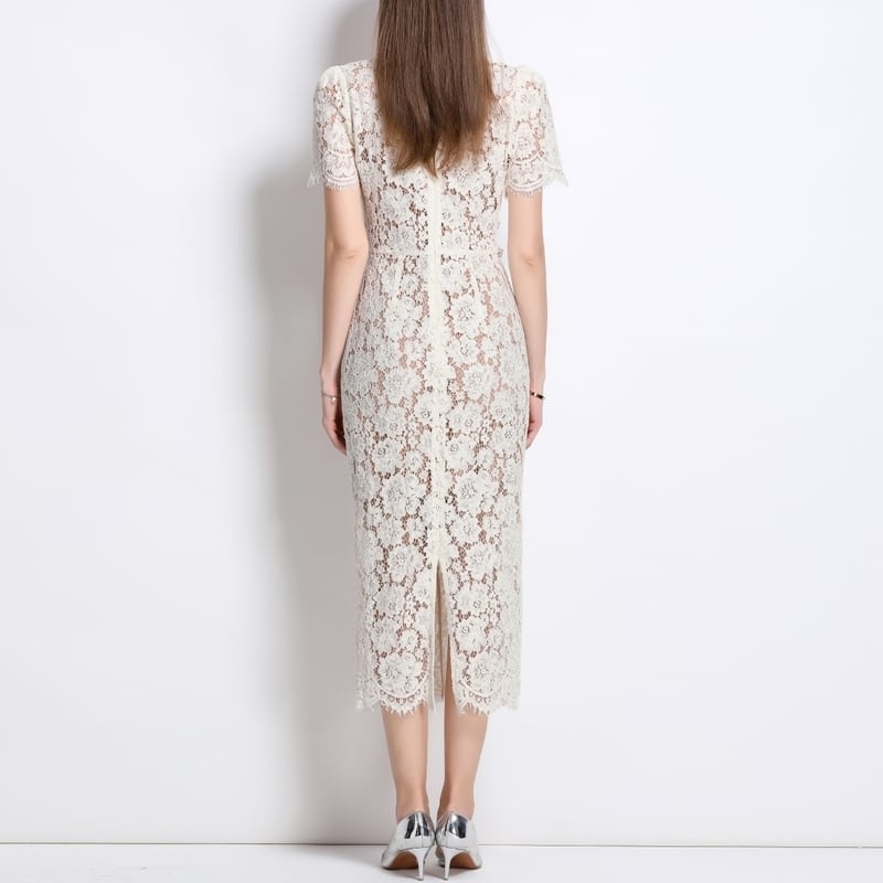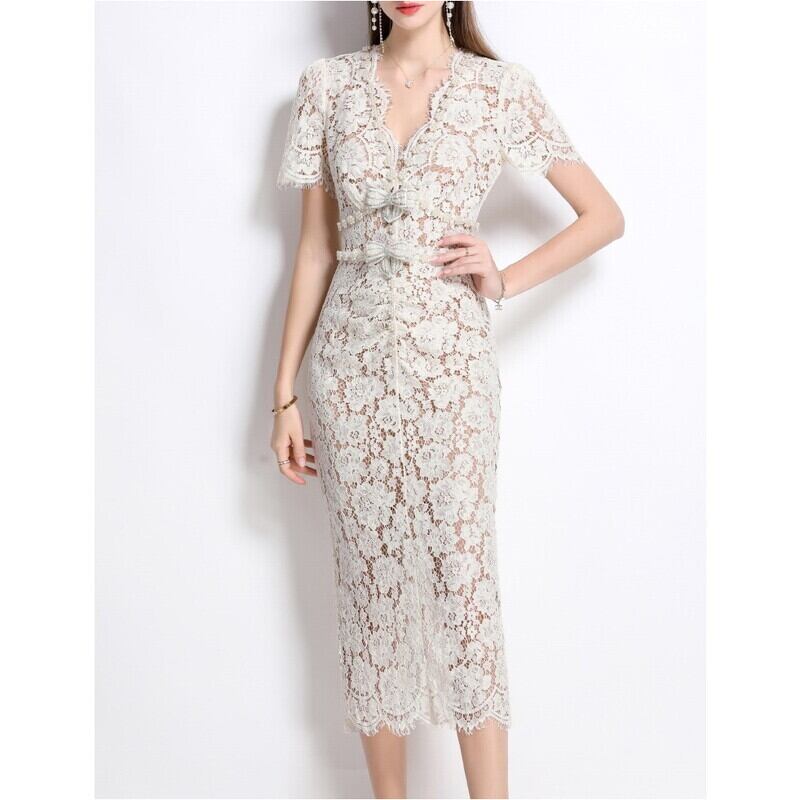総レースVネックボディコンシャスドレス D0130